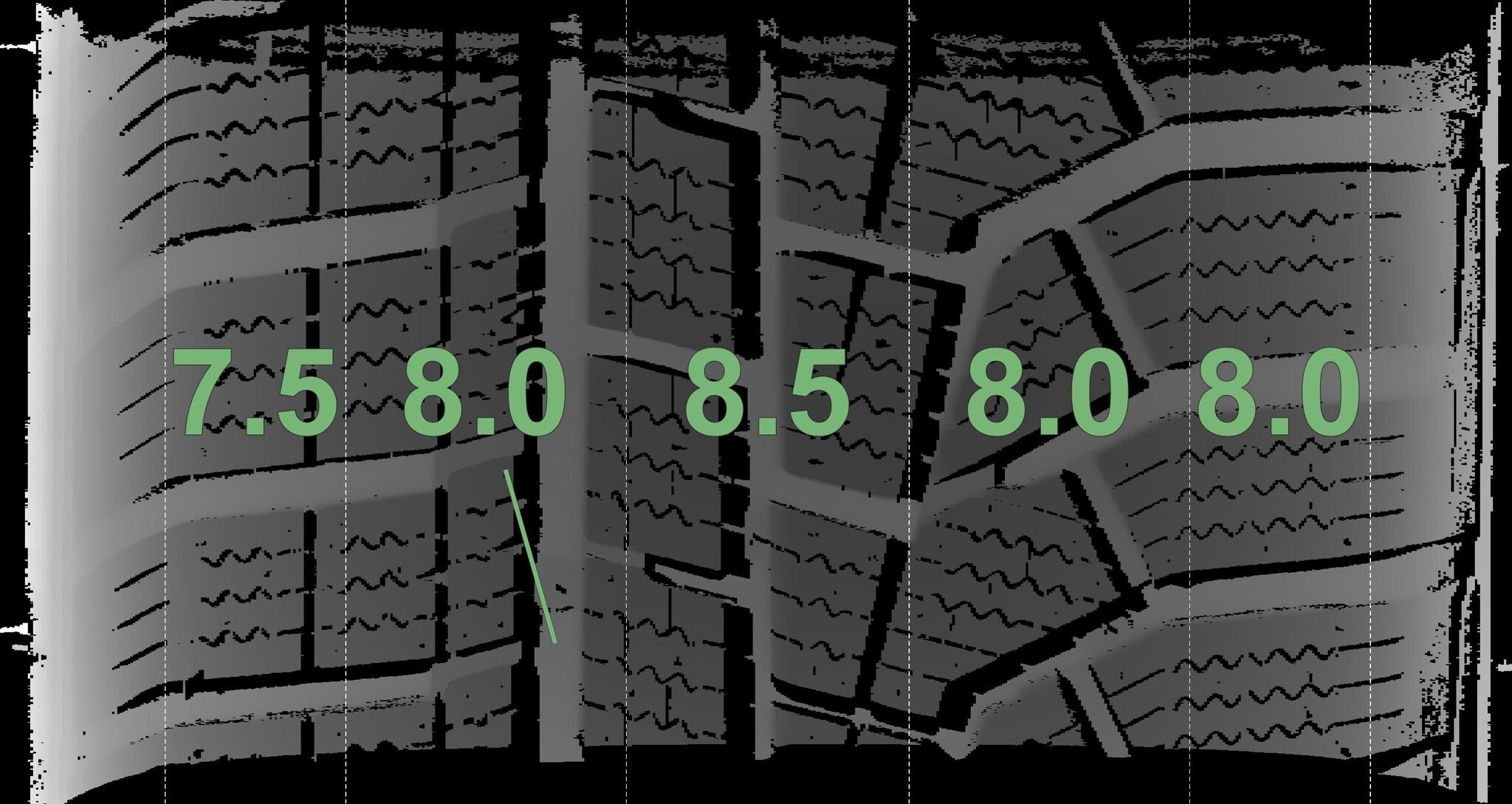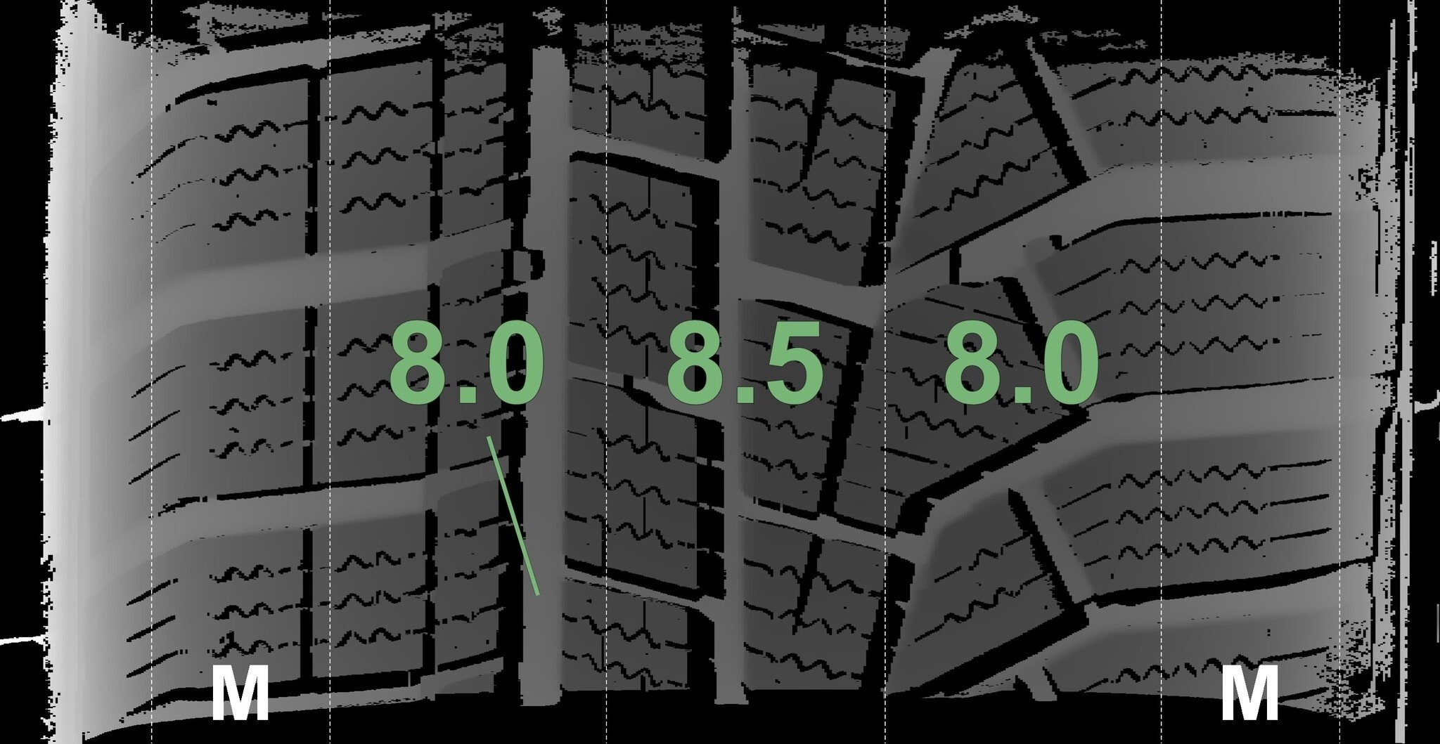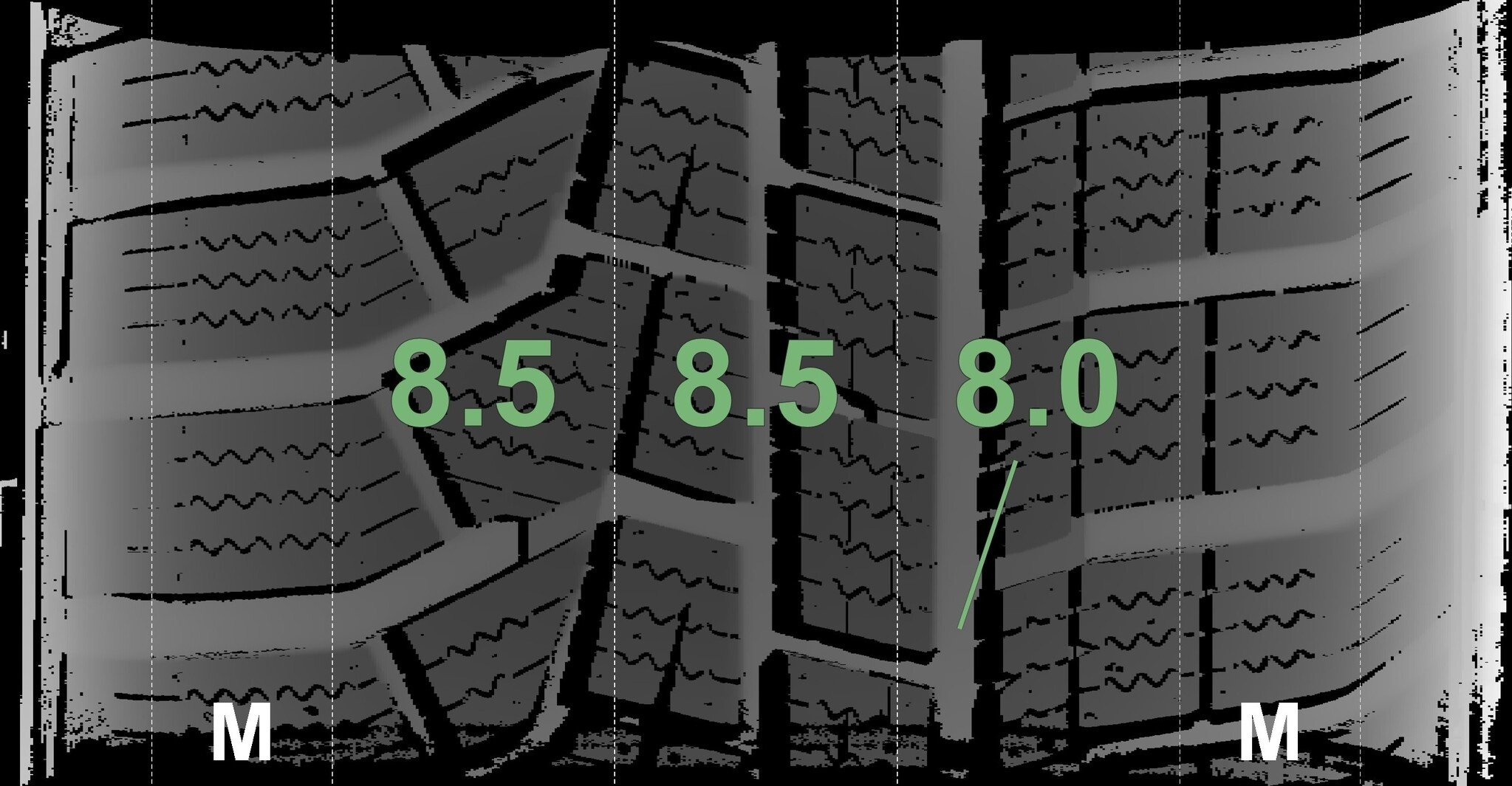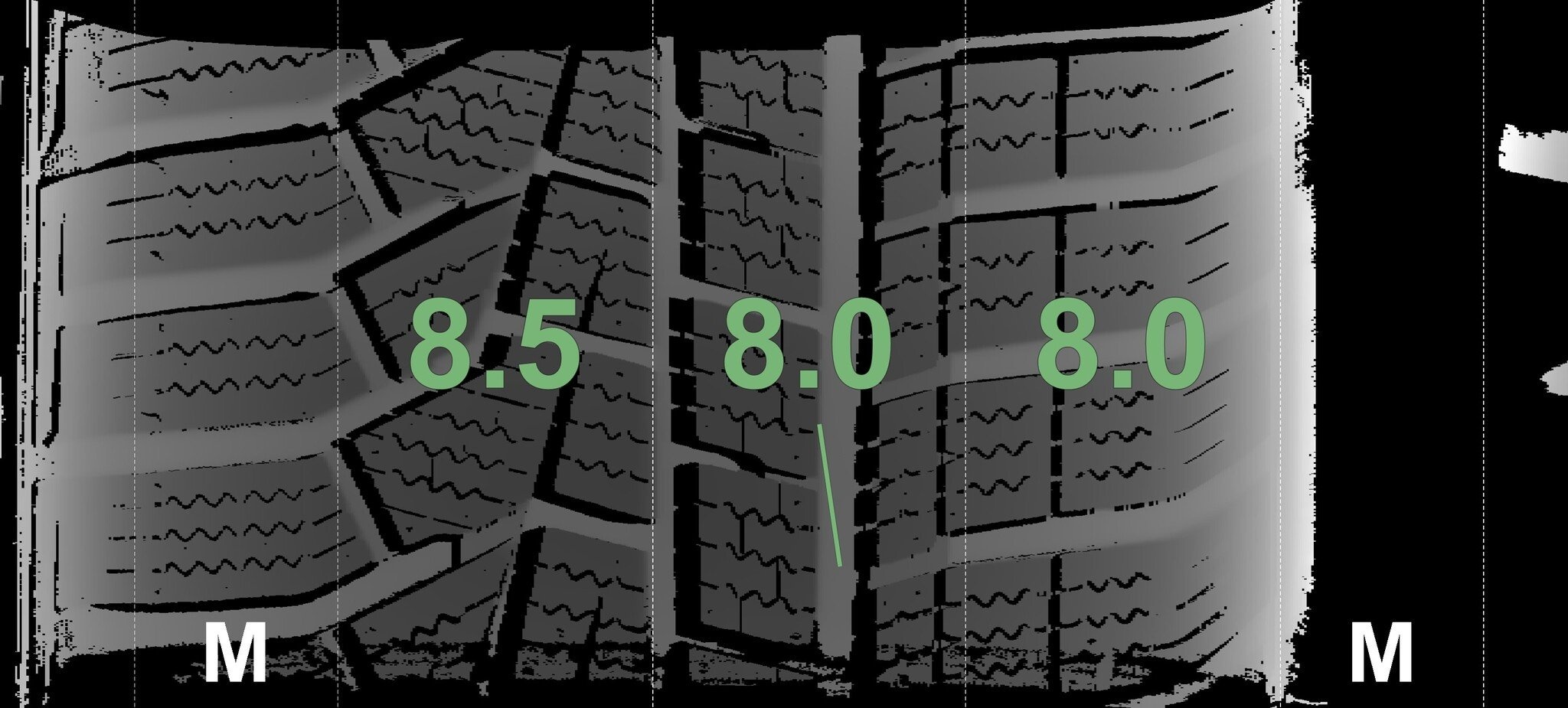 Die gemessenen Profiltiefen und die Details der Felgen sind oben aufgeführt.
