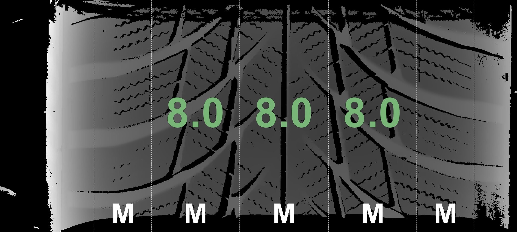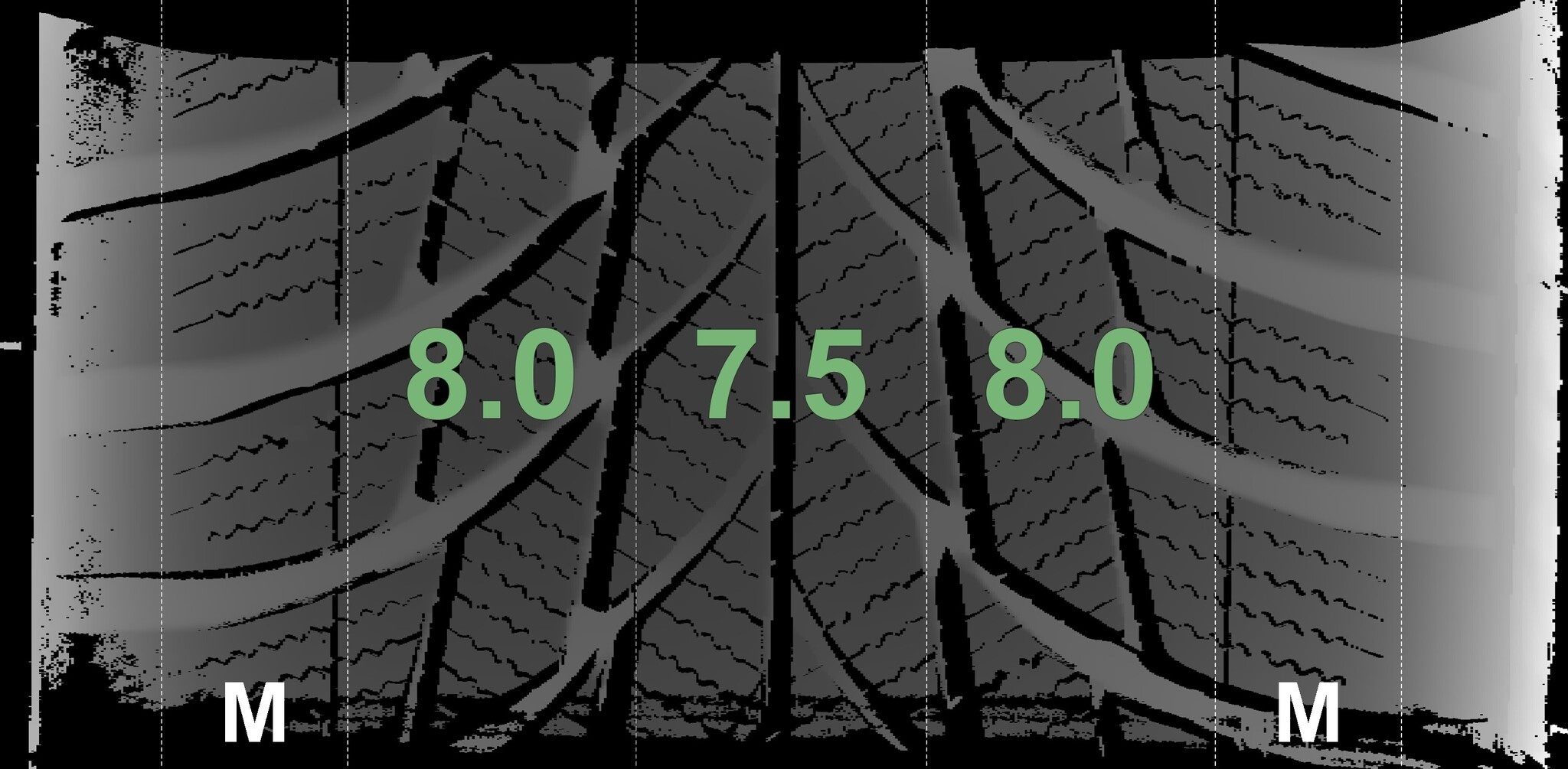 | Zustand | Profiltiefe | DOT | Vorderachse Links | Gebraucht | 8.0 mm | 4924 |