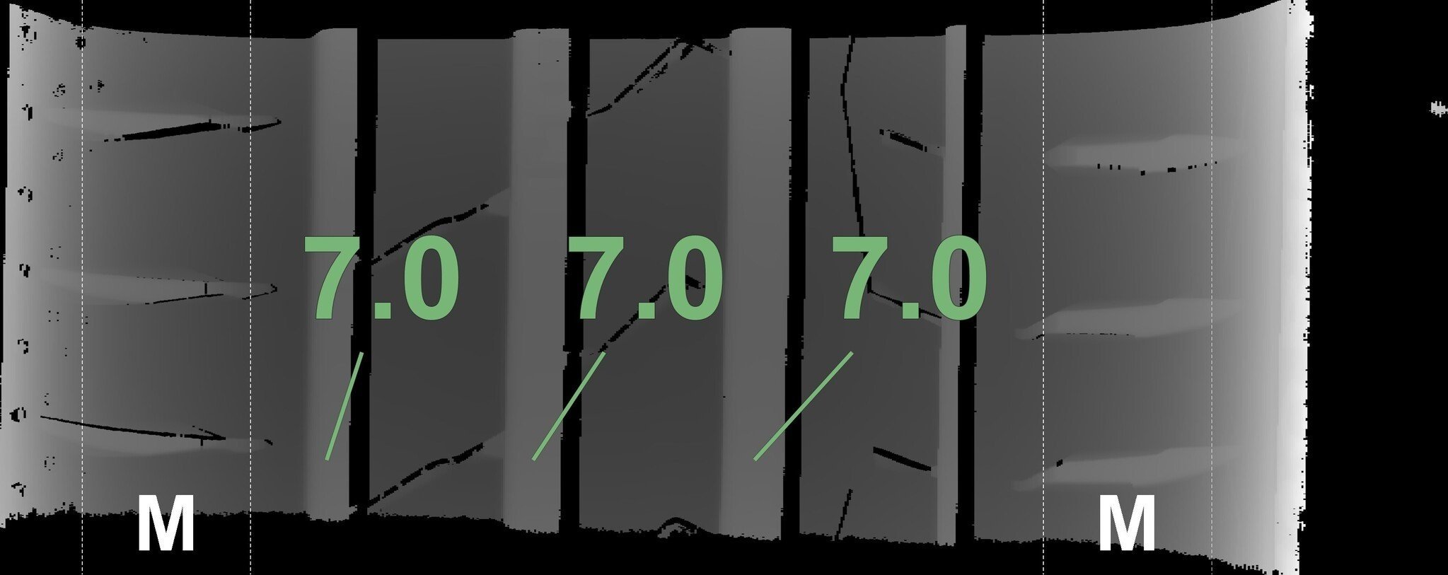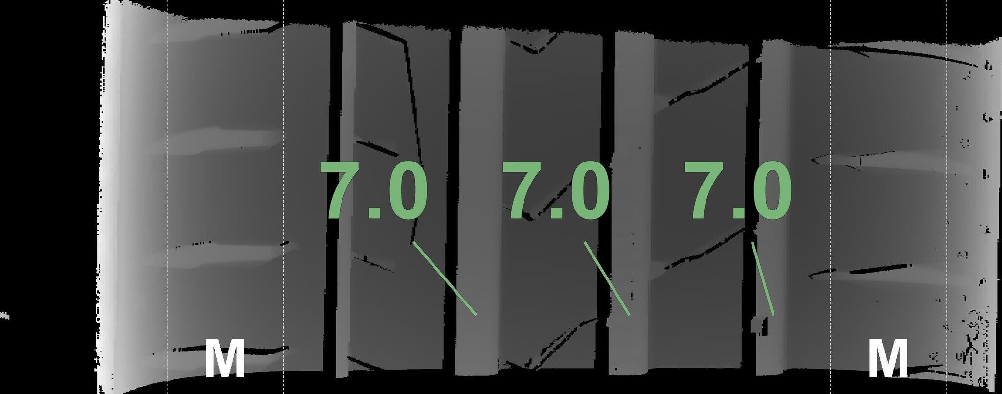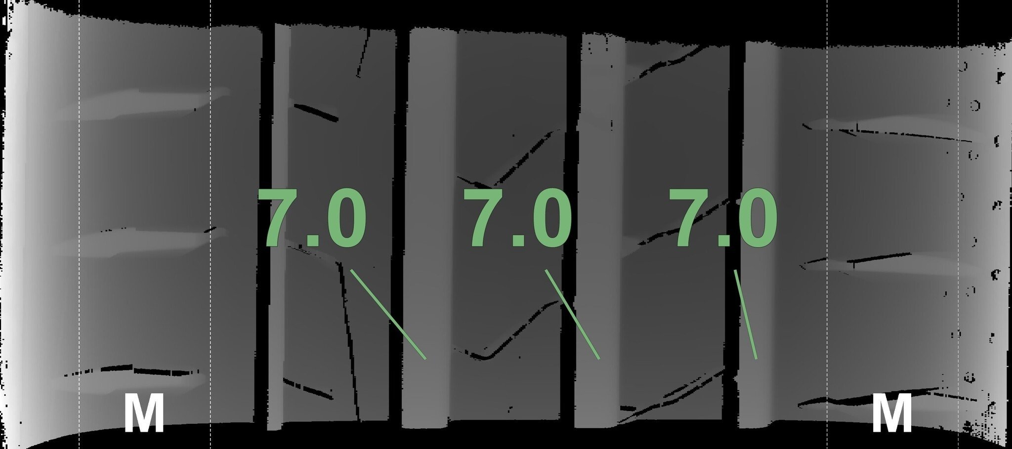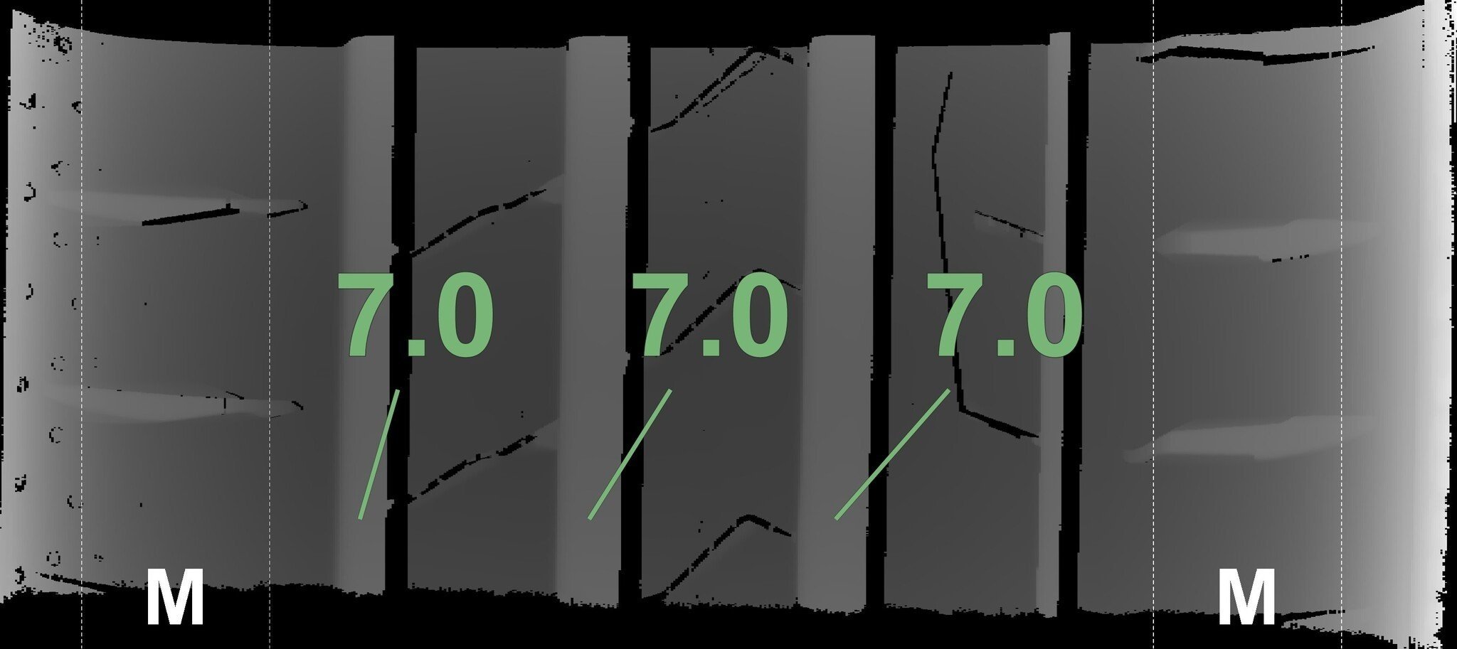 | Zustand | Profiltiefe | DOT | Vorderachse Links | Neu | 7.0 mm | 4625 |