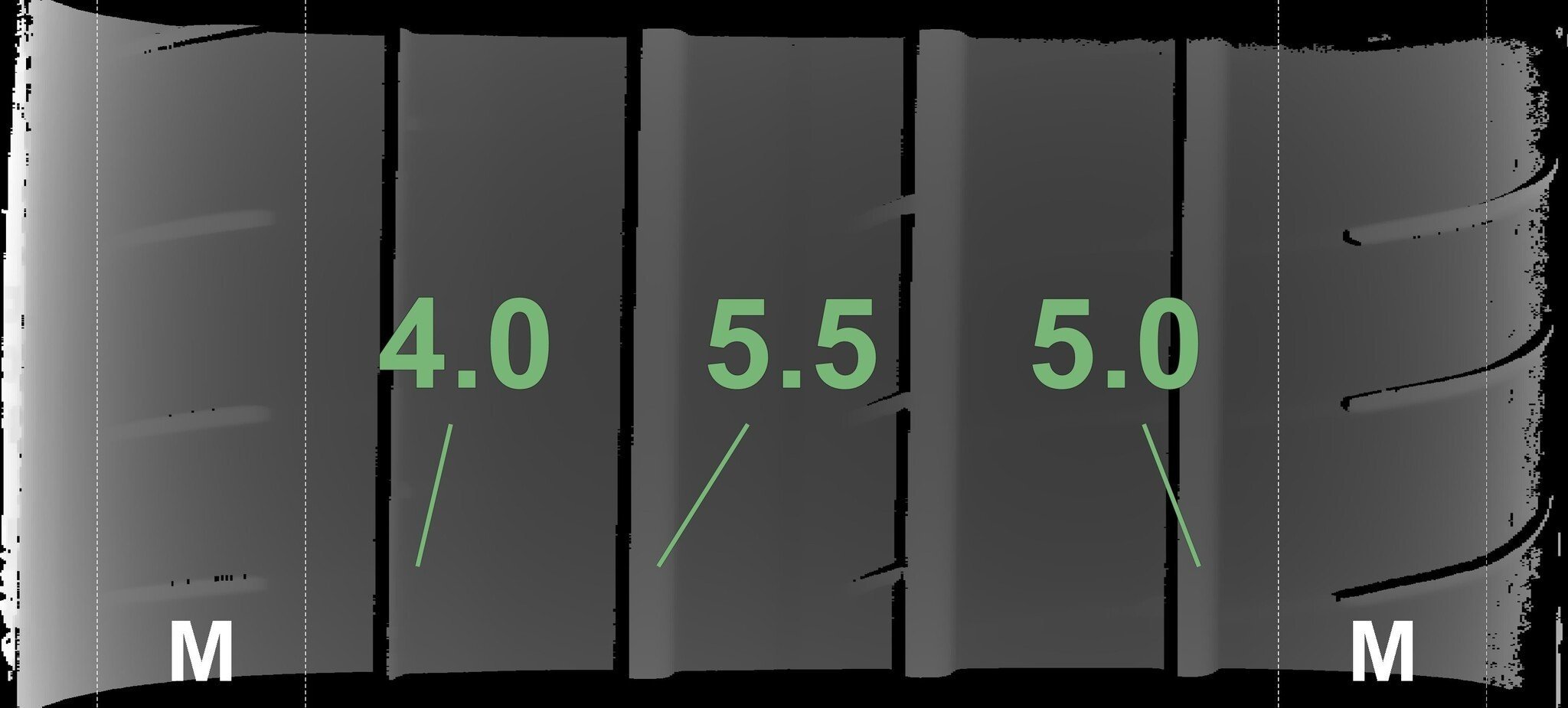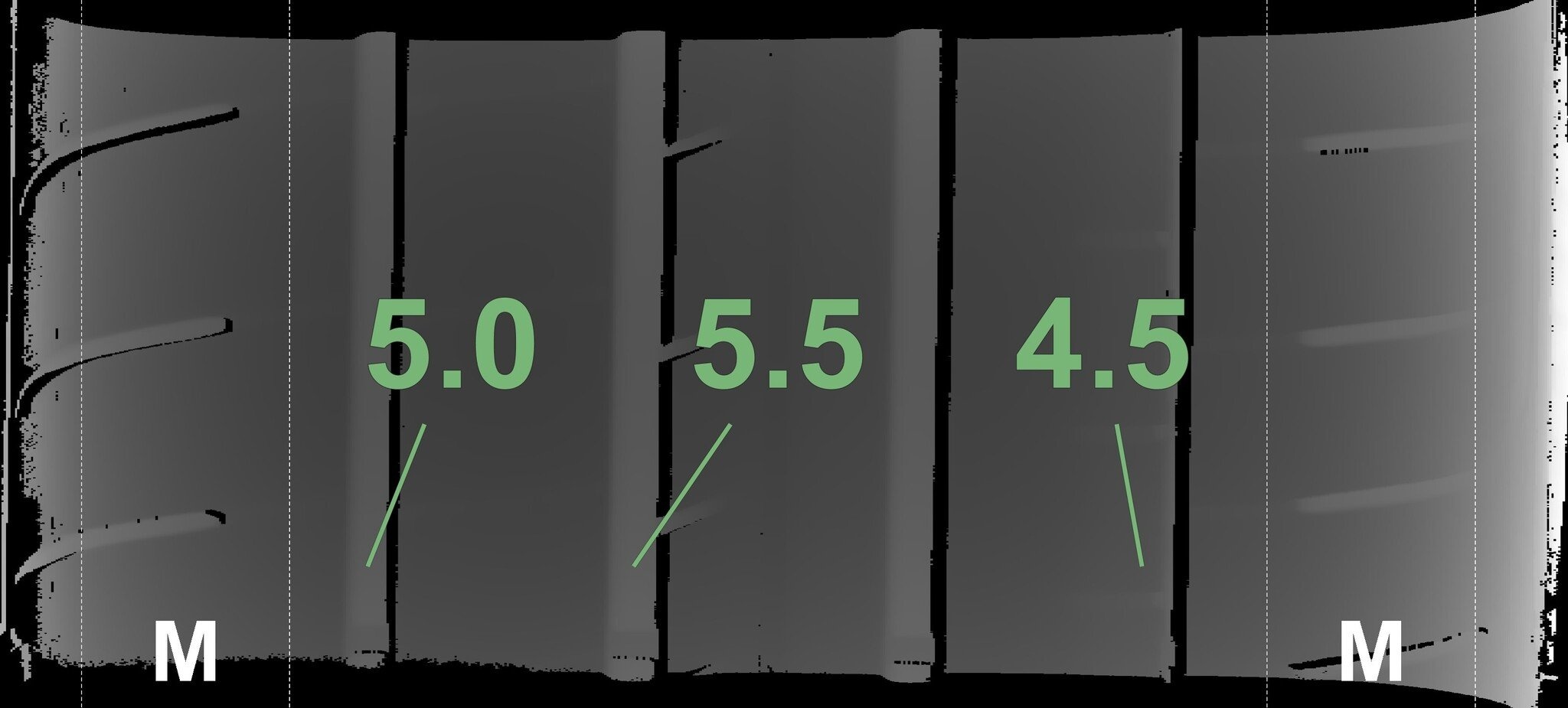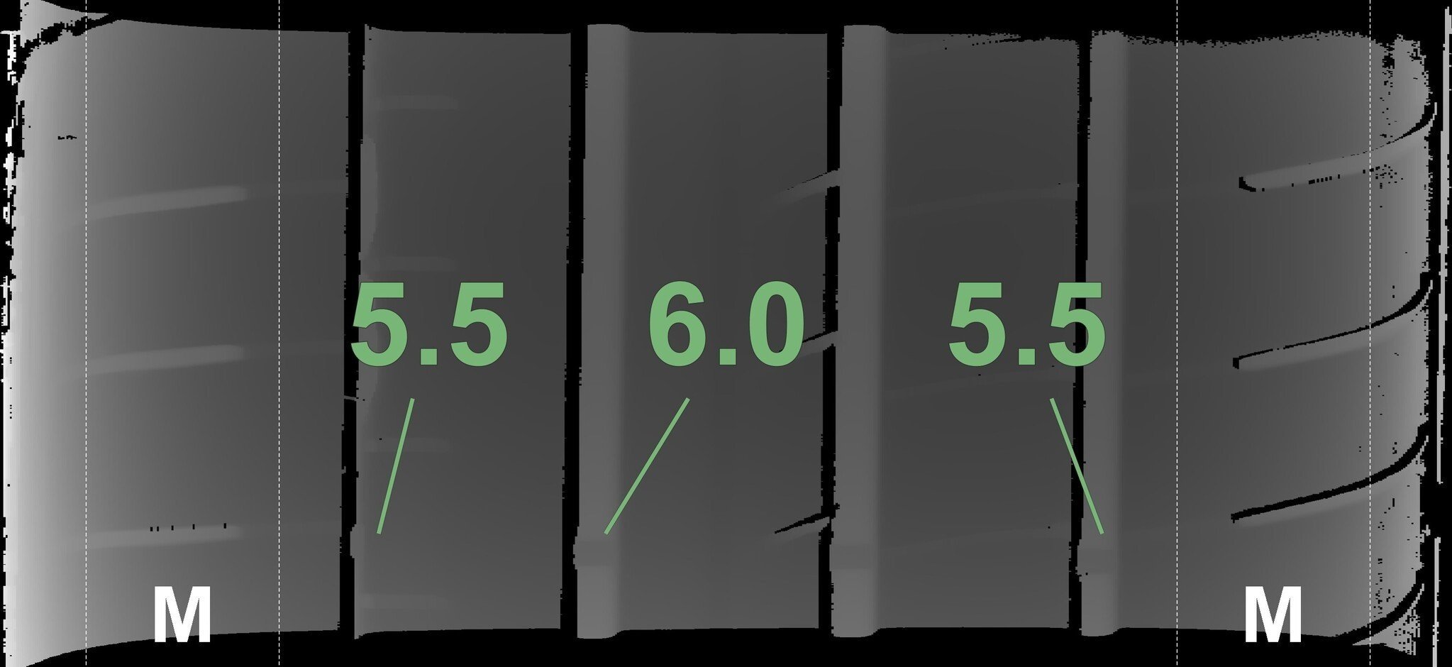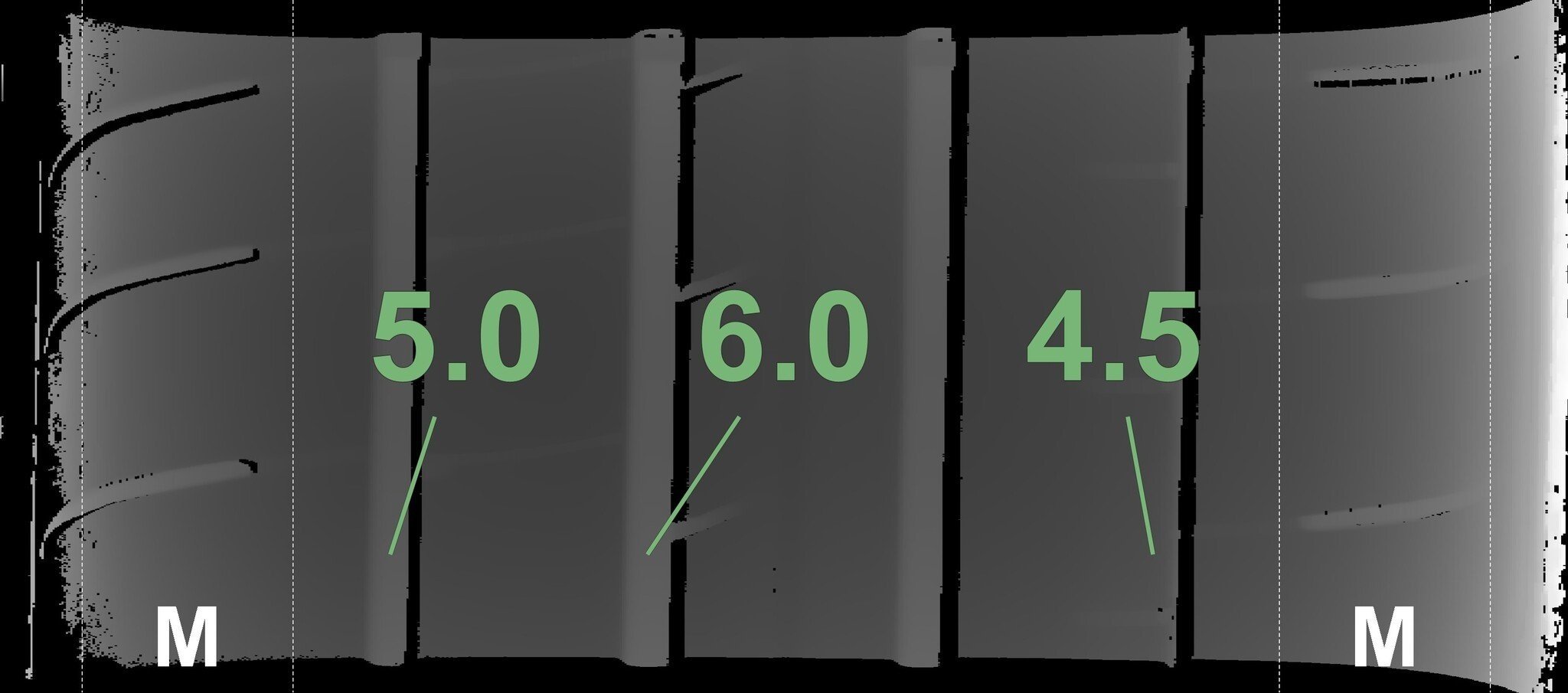 Die gemessenen Profiltiefen und die Details der Felgen sind oben dargestellt.