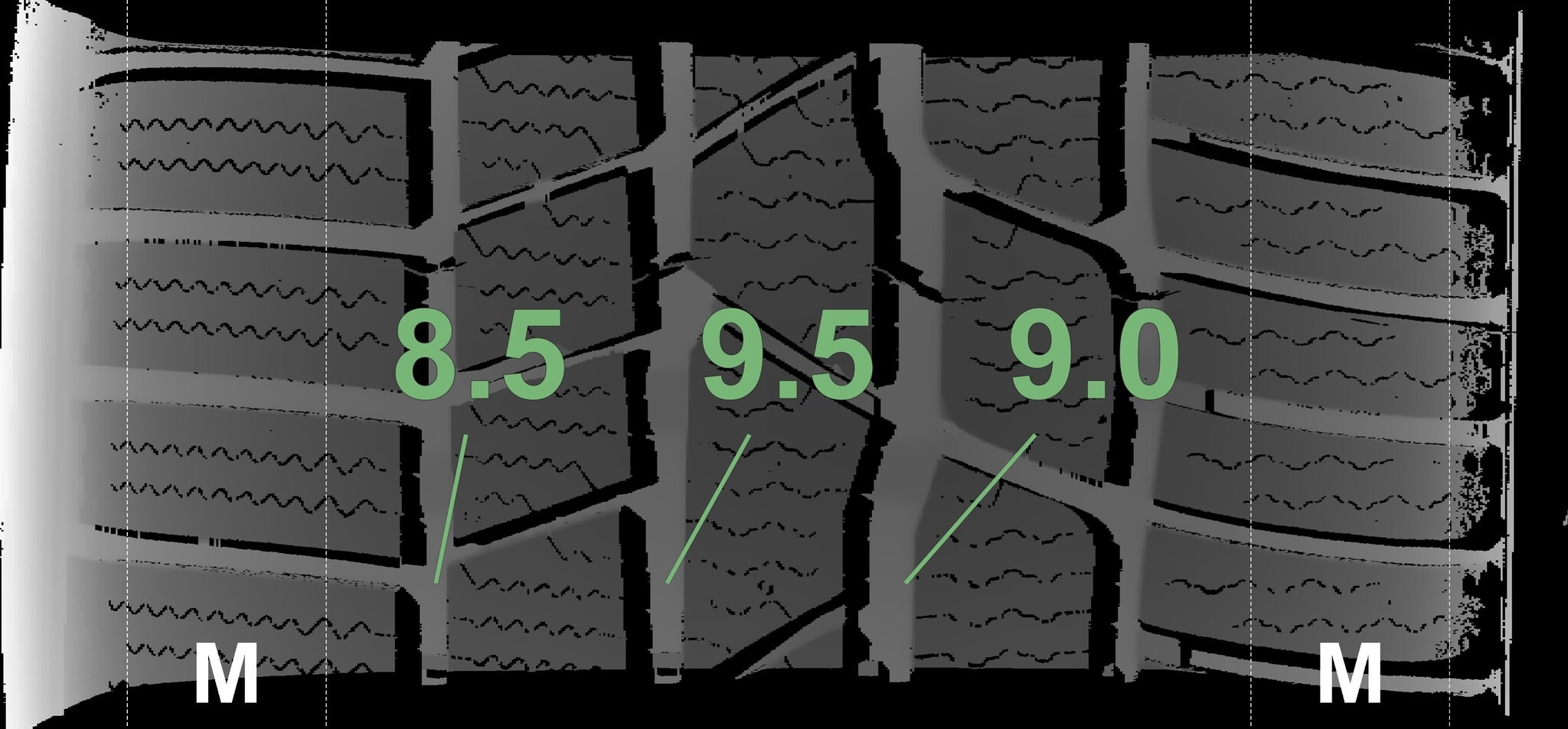 Die gemessenen Profiltiefen und die Details der Felgen sind oben dargestellt.
