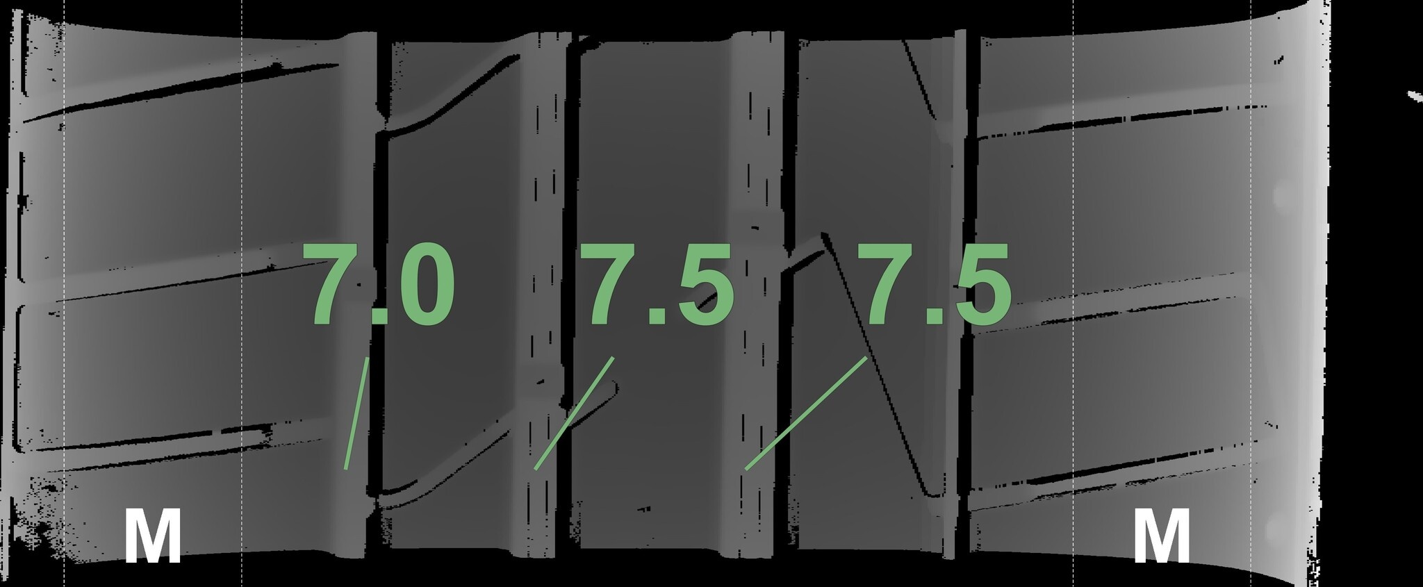 | Zustand | Profiltiefe | DOT | Vorderachse Rechts | Neu | 7.3 mm | 1021 |