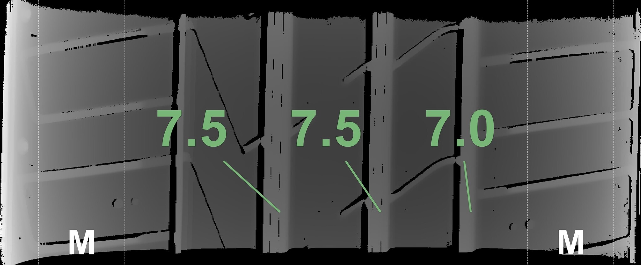 | Zustand | Profiltiefe | DOT | Vorderachse Links | Neu | 7.3 mm | 1021 |