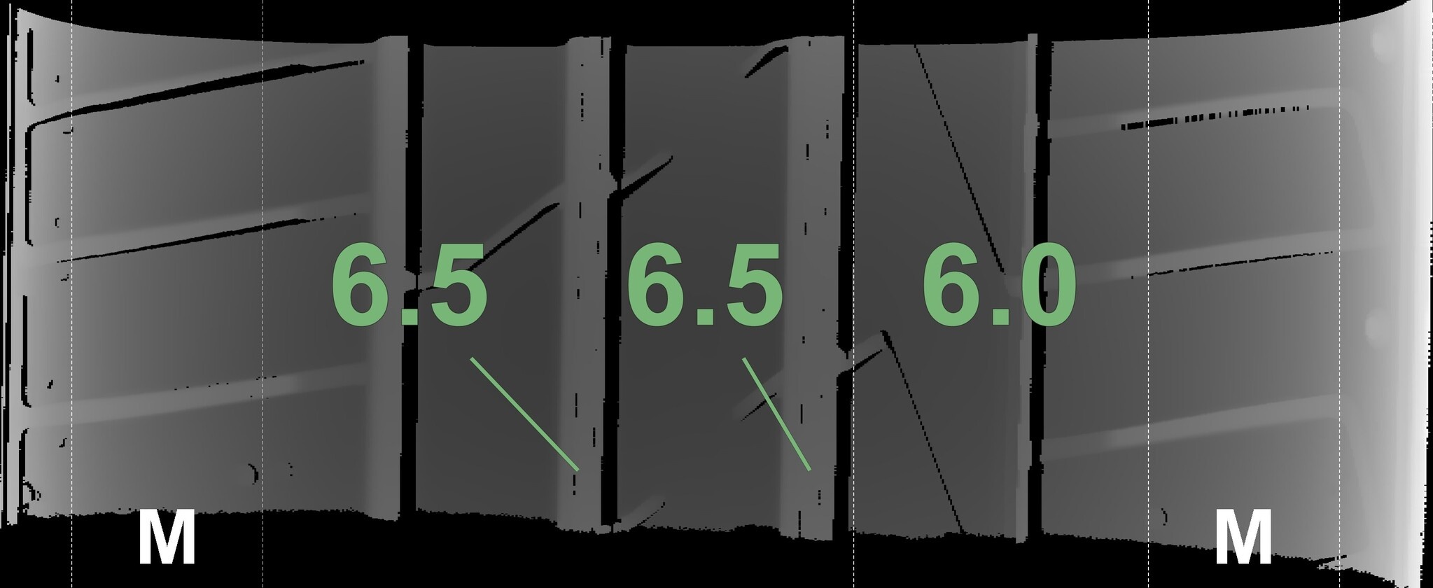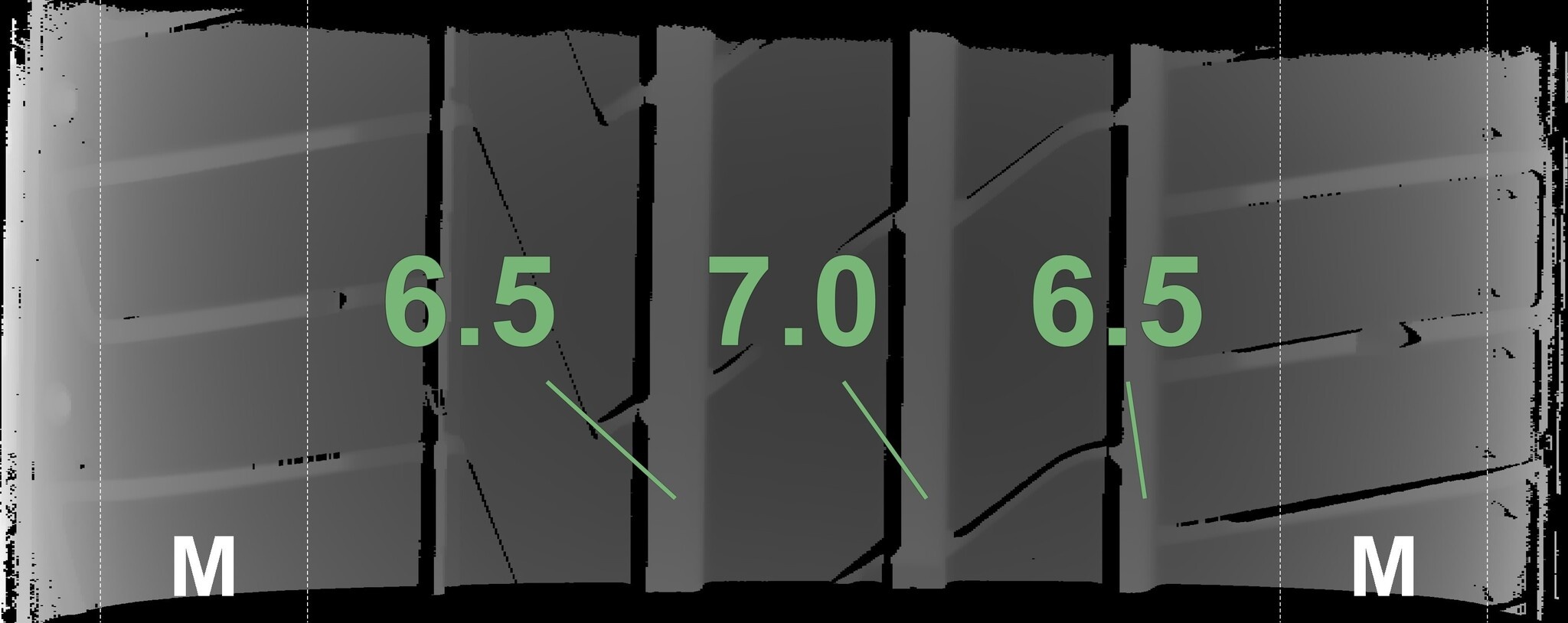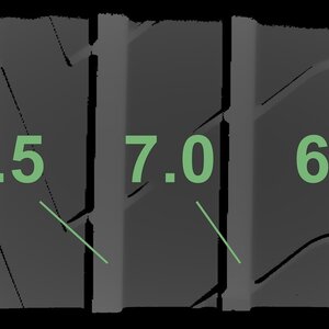 Die gemessenen Profiltiefen und die Details der Felgen sind oben dargestellt.