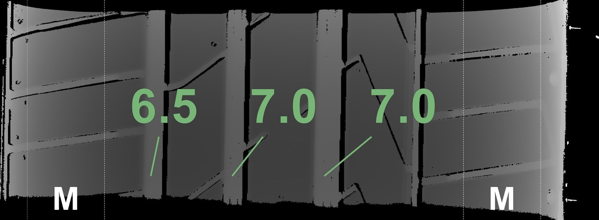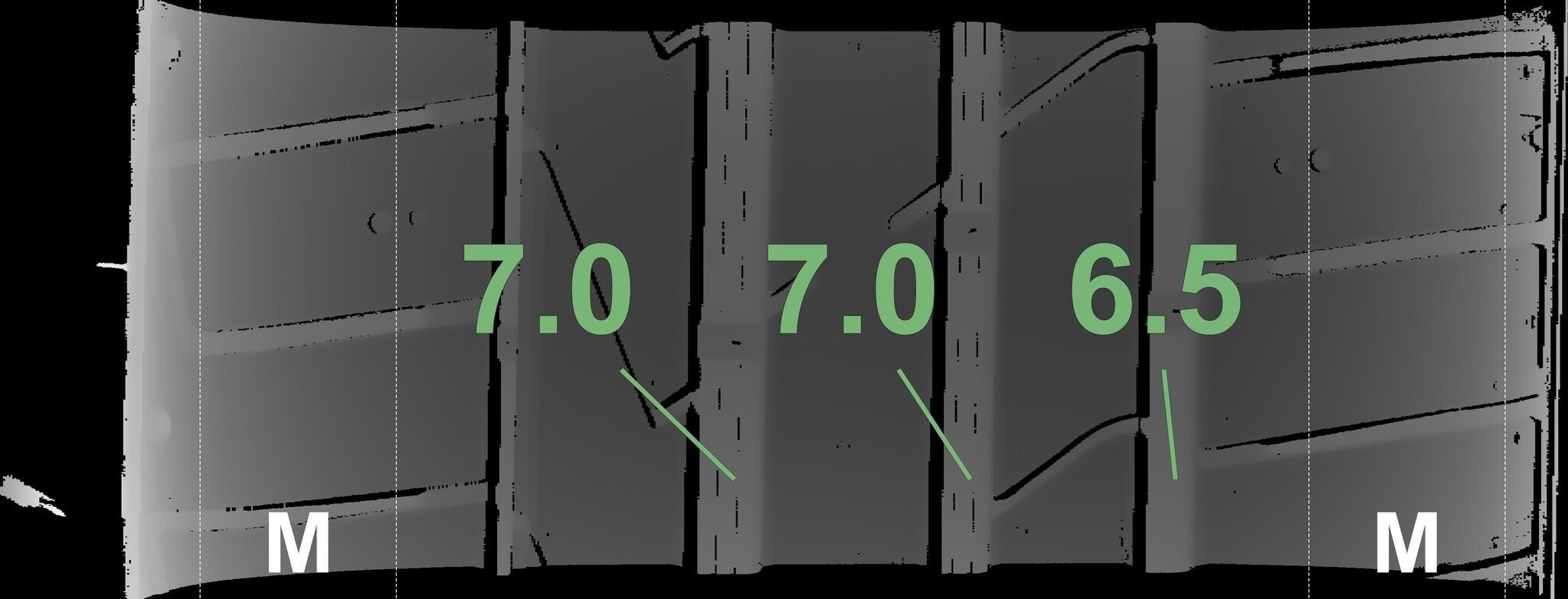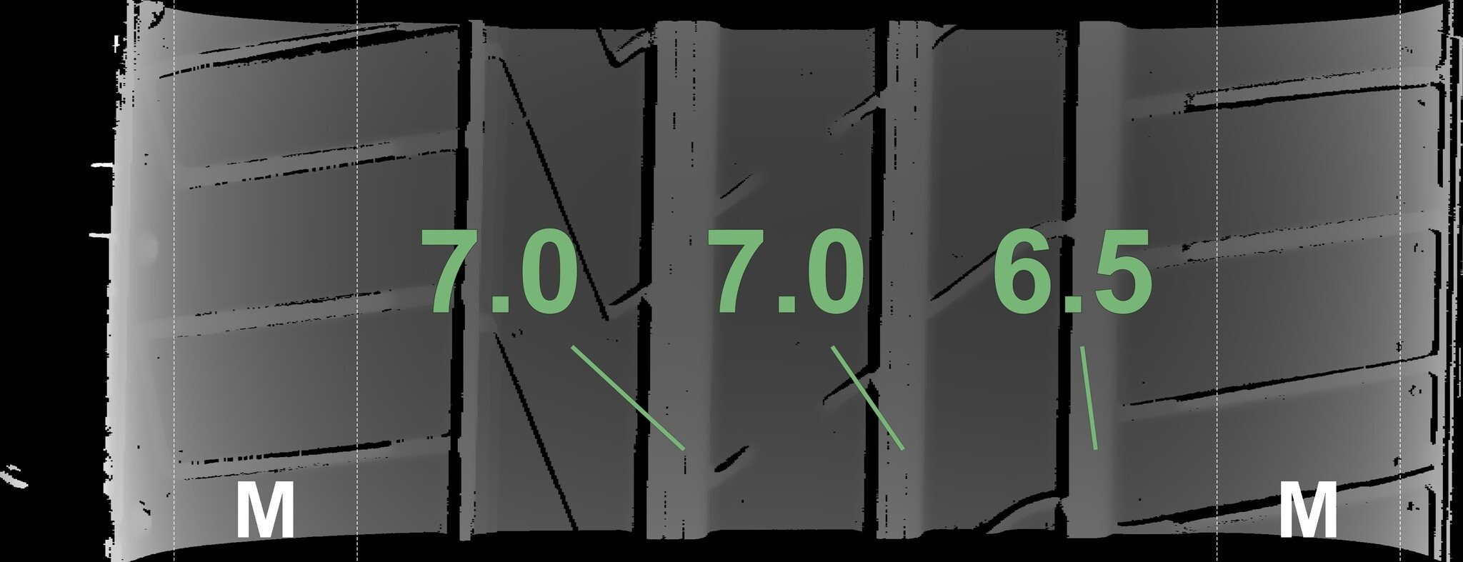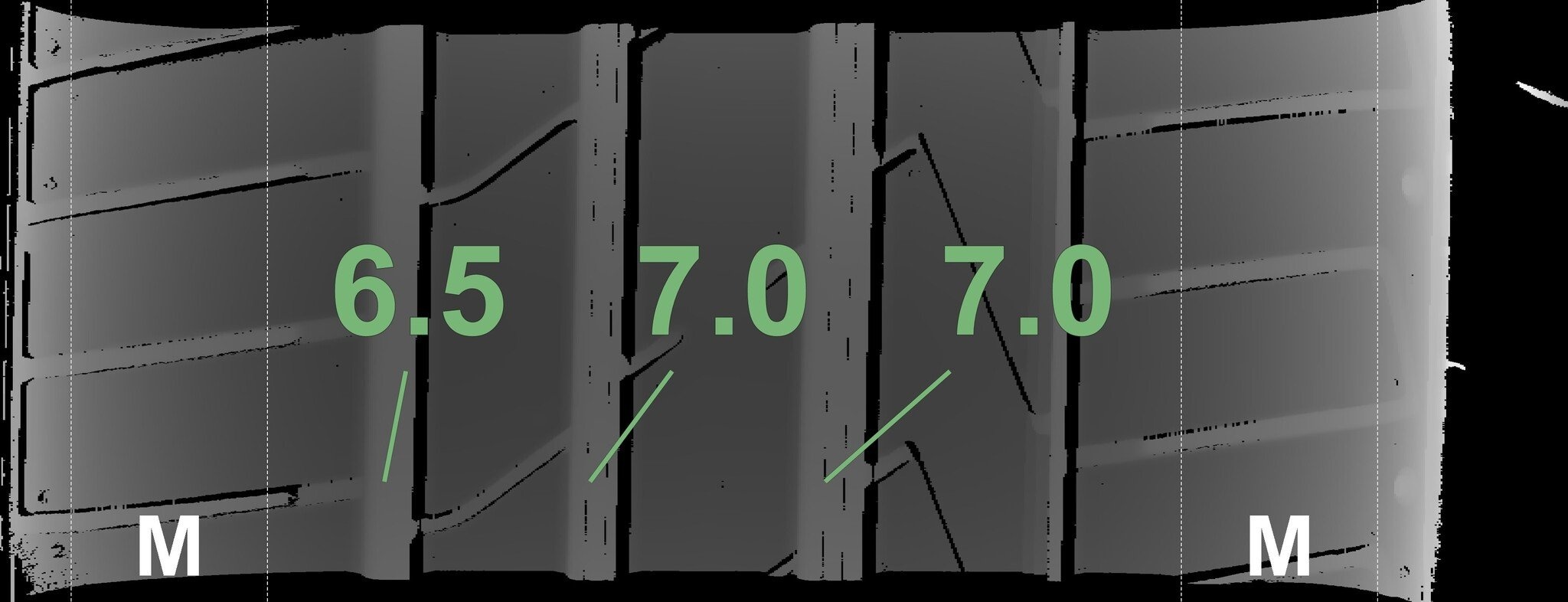 Die gemessenen Profiltiefen und die Details der Felgen sind oben dargestellt.