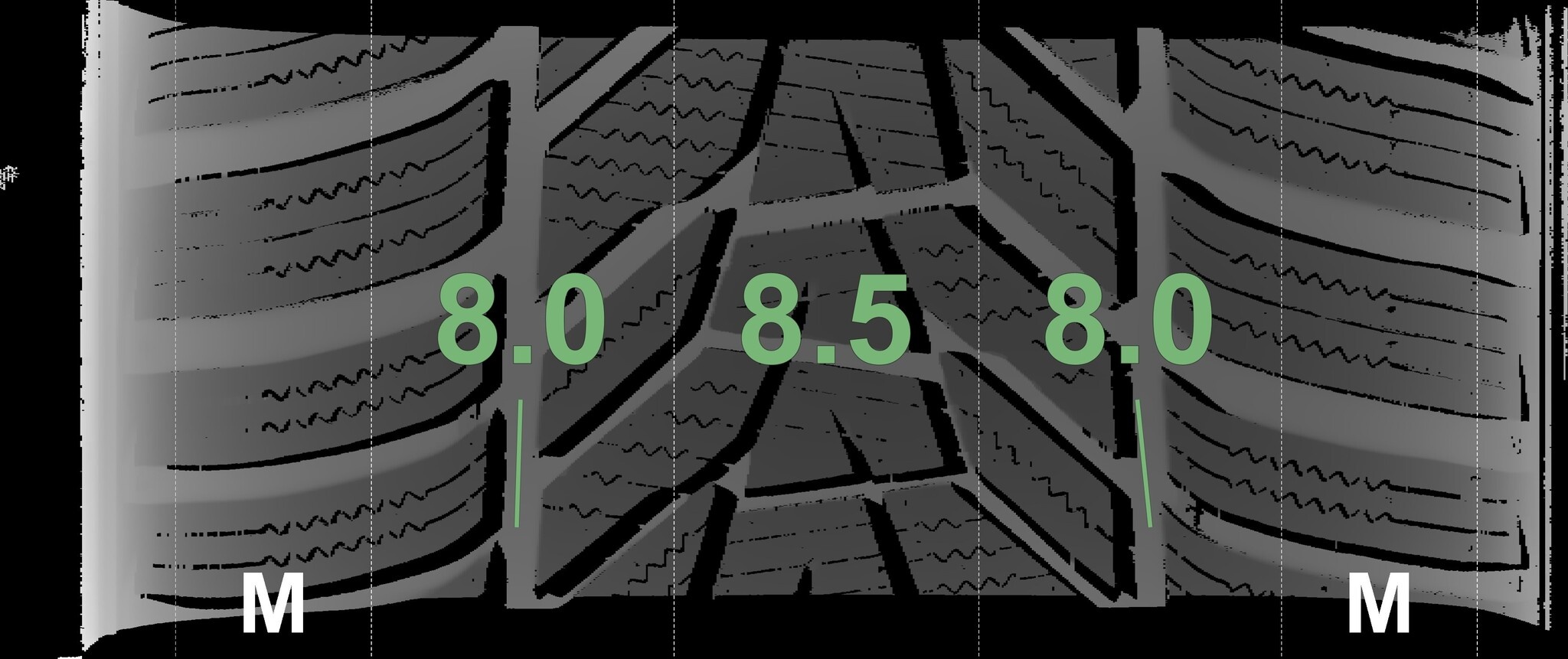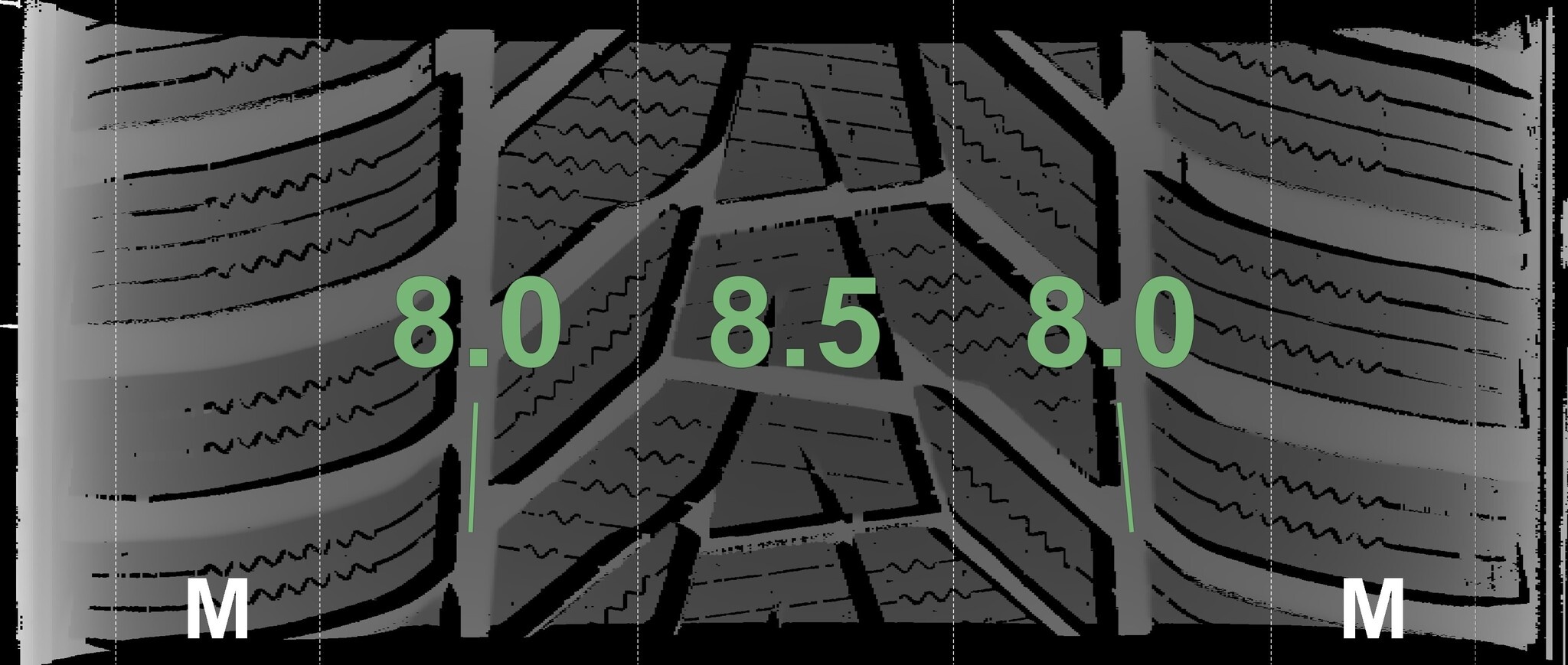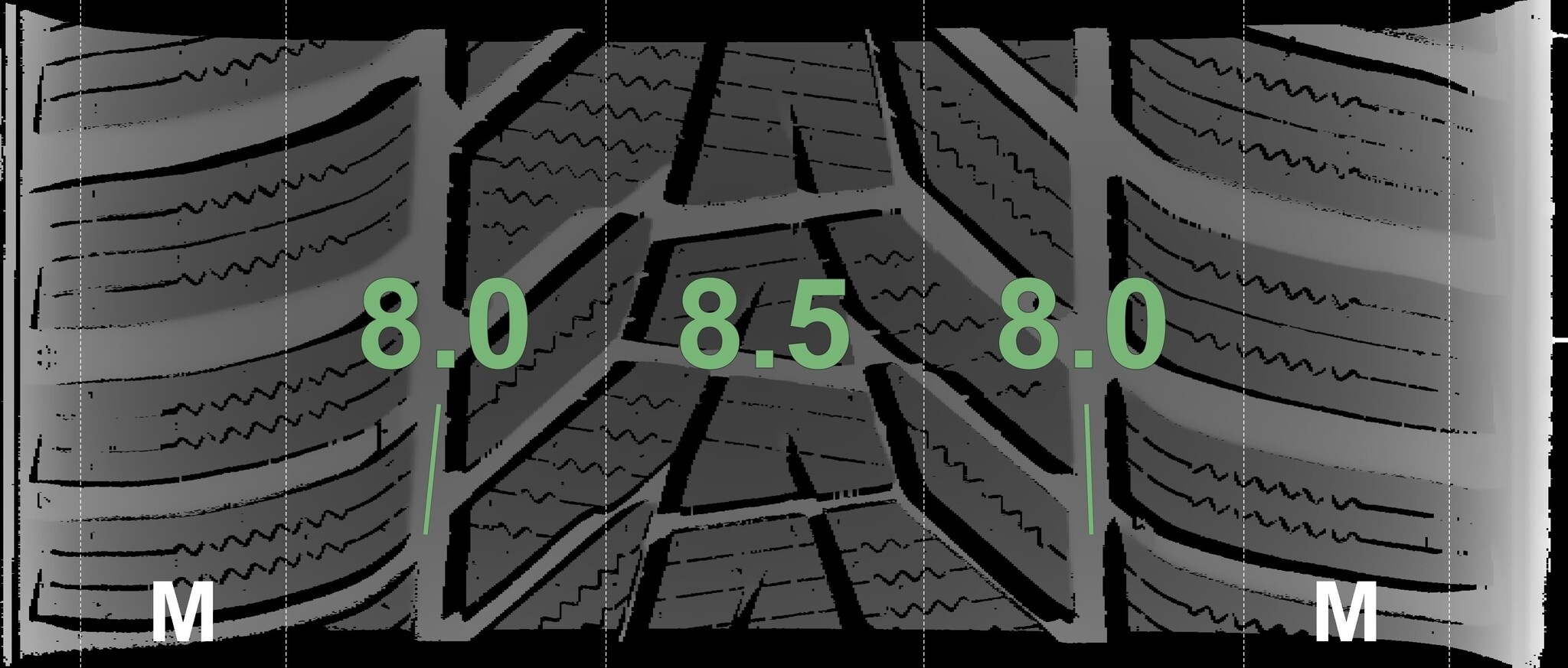 | Zustand | Profiltiefe | DOT | Vorderachse Links | Neu | 8,0 mm | 1625 |