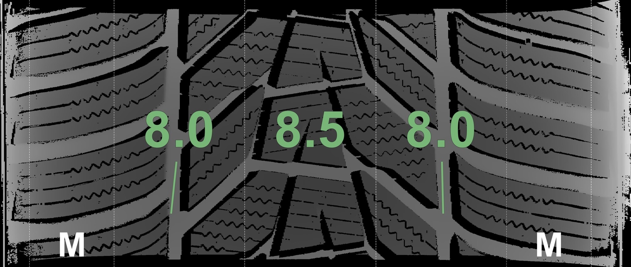 | Zustand | Profiltiefe | DOT | Vorderachse Links | Neu | 8,0 mm | 3224 |