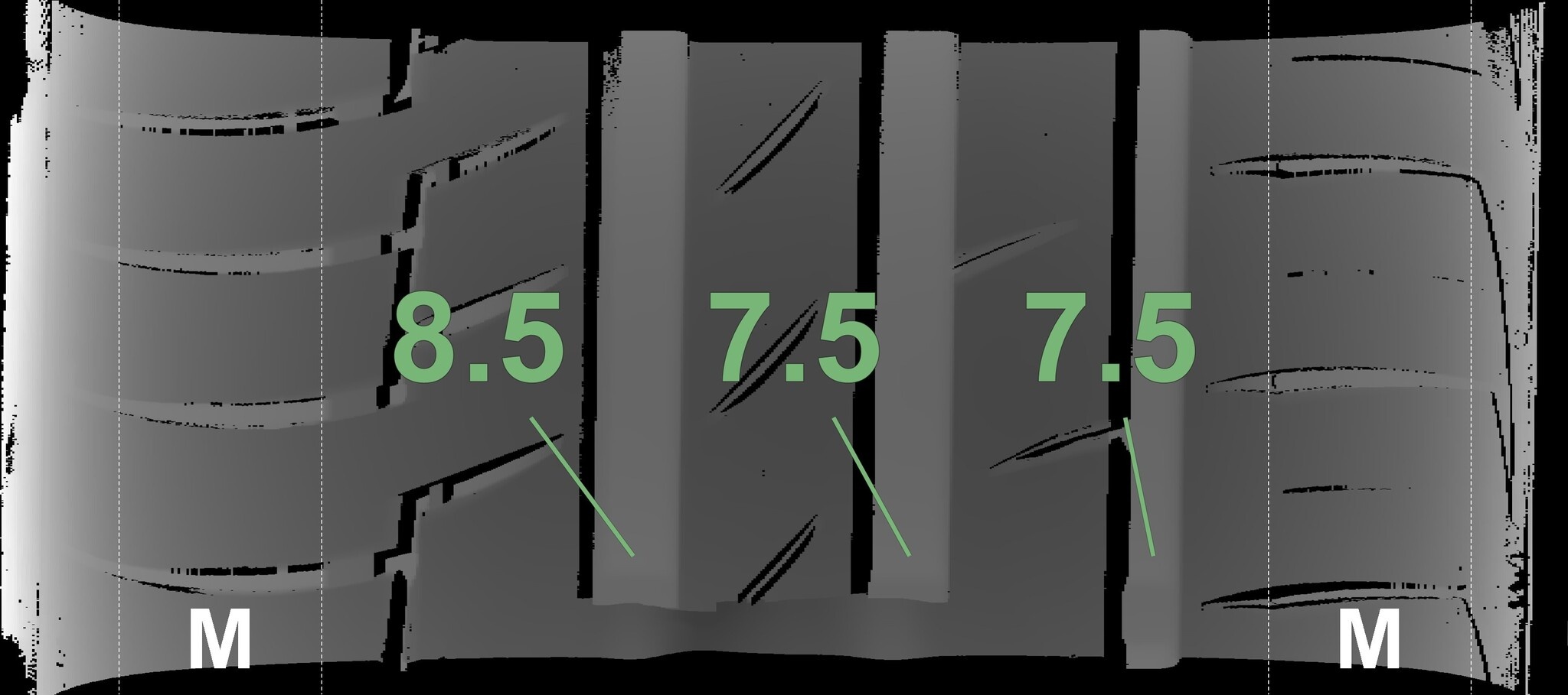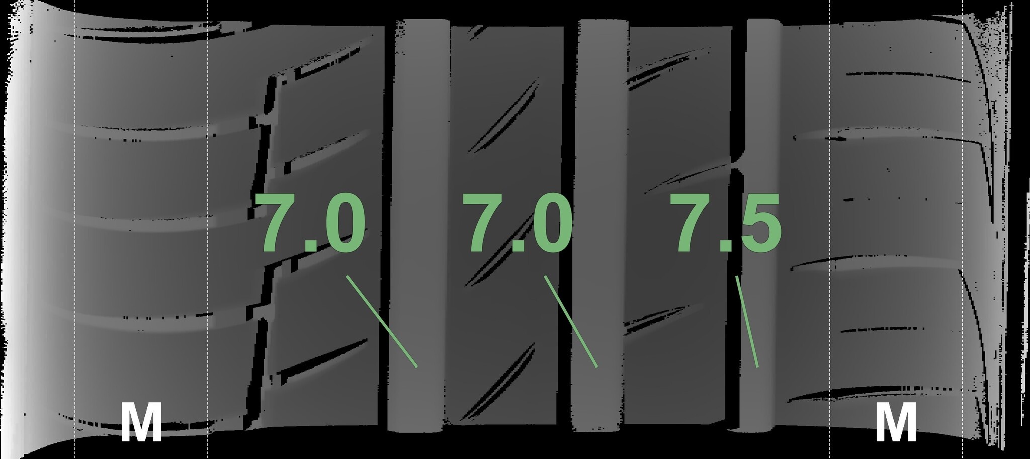 Die gemessenen Profiltiefen und die Details der Felgen sind oben dargestellt.
