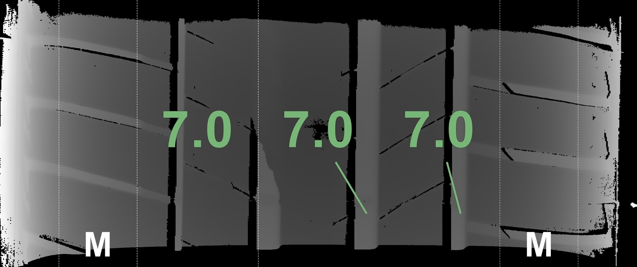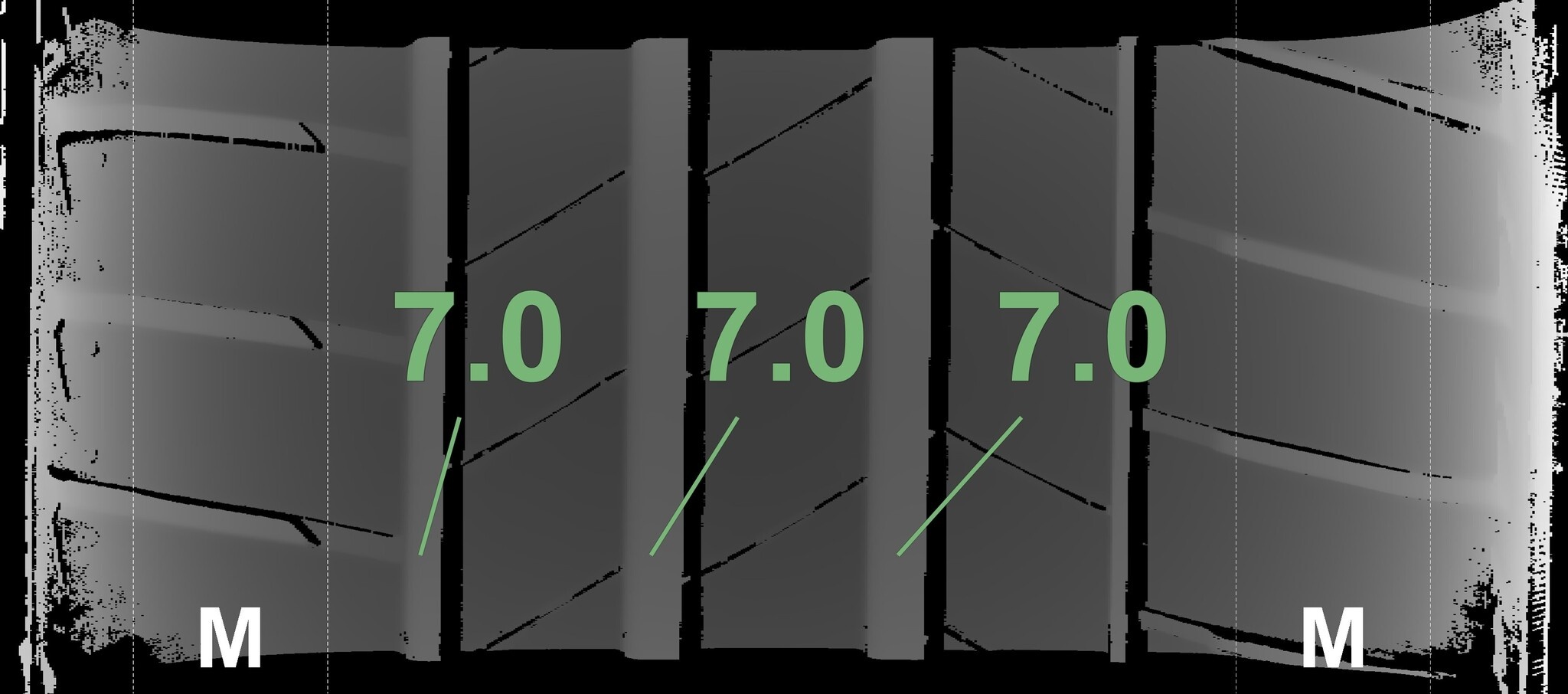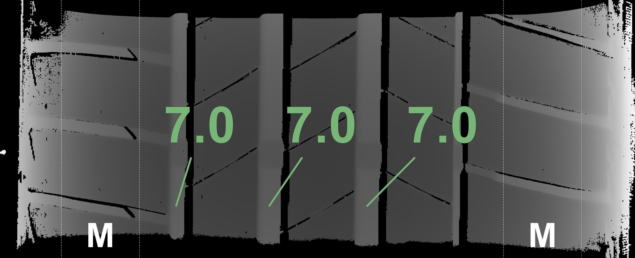 | Zustand | Profiltiefe | DOT | Vorderachse Rechts | Demo-Noppen noch zichtbaar | 7.0 mm | 1524 |