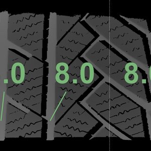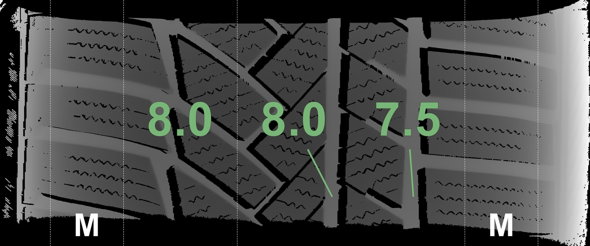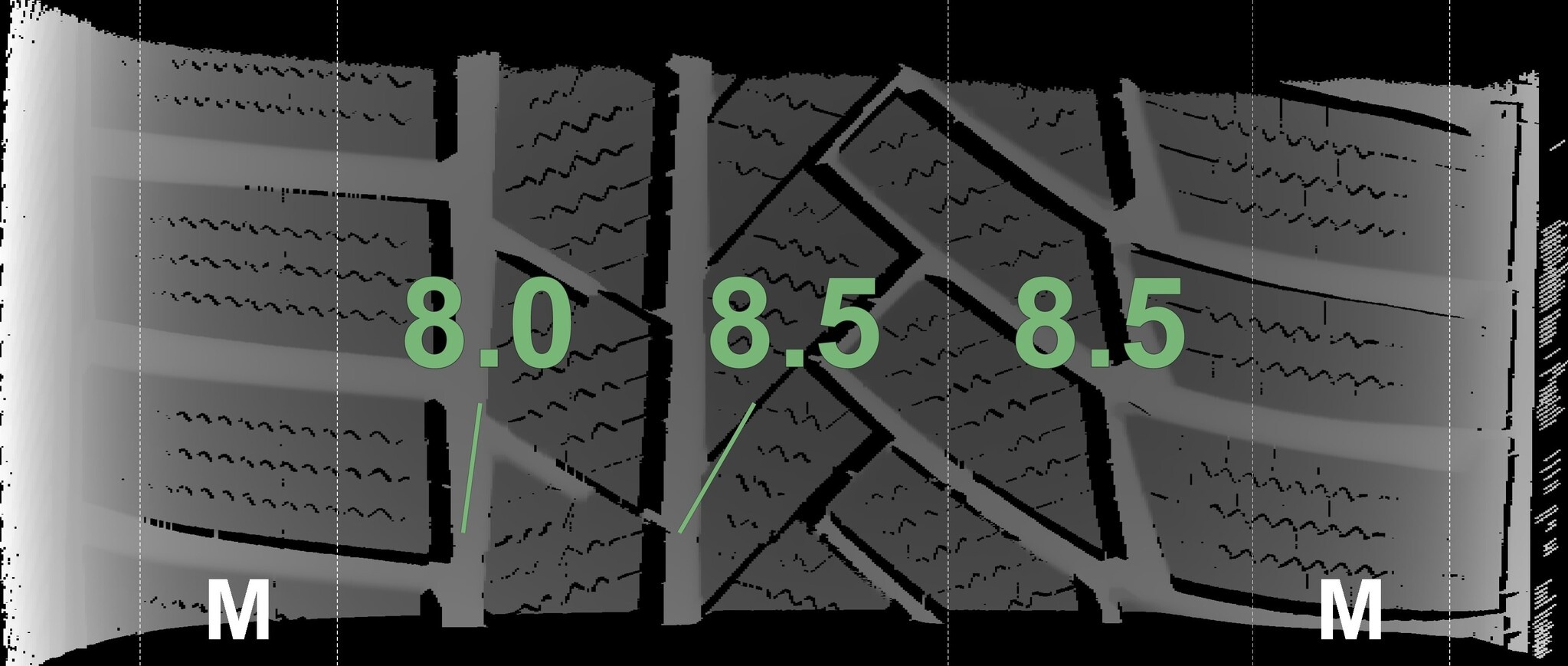 | Zustand | Profiltiefe | DOT | Vorderachse Rechts | Demo Noppen noch sichtbar | 8.0 mm | 3323 |