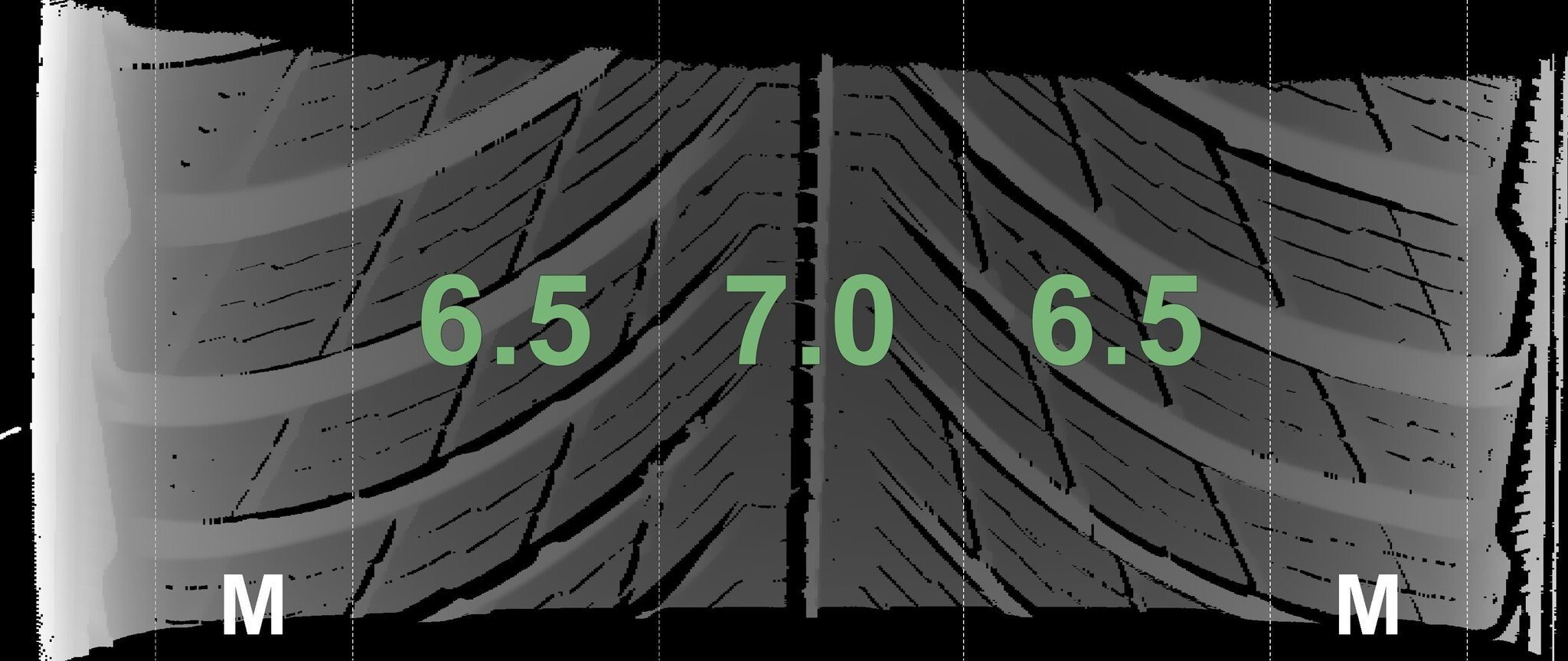 Die gemessenen Profiltiefen und die Details der Felgen sind oben dargestellt.