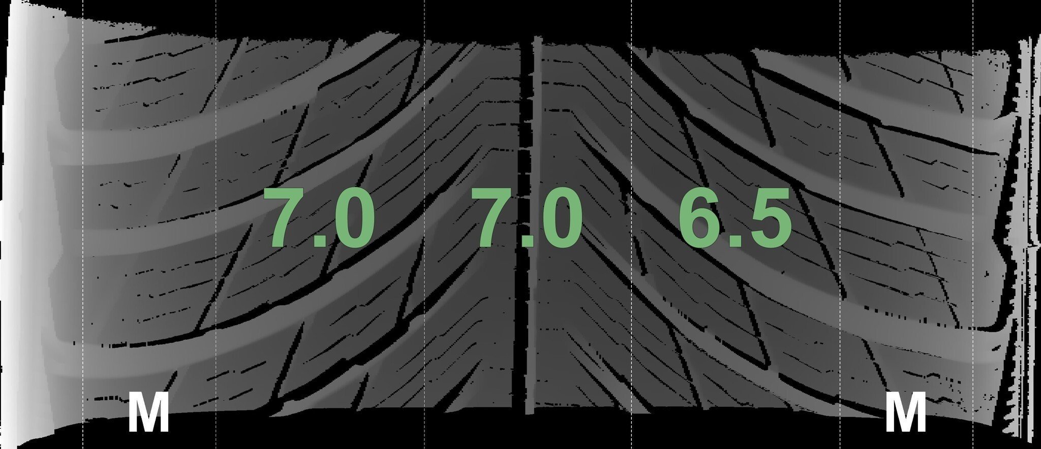 | Zustand | Profiltiefe | DOT | Vorderachse Links | Gebraucht | 6.8 mm | 3320 |