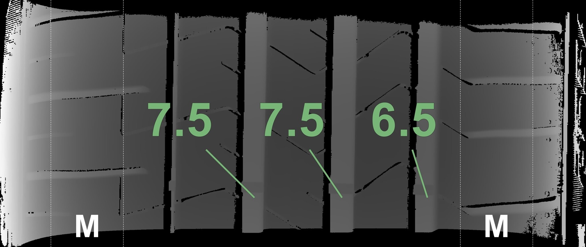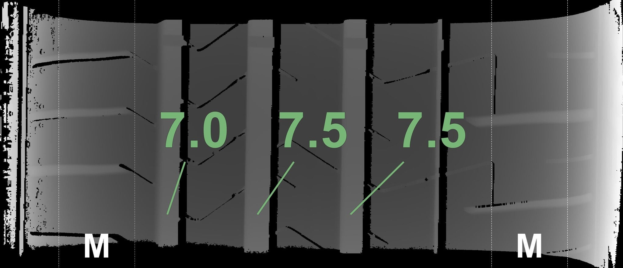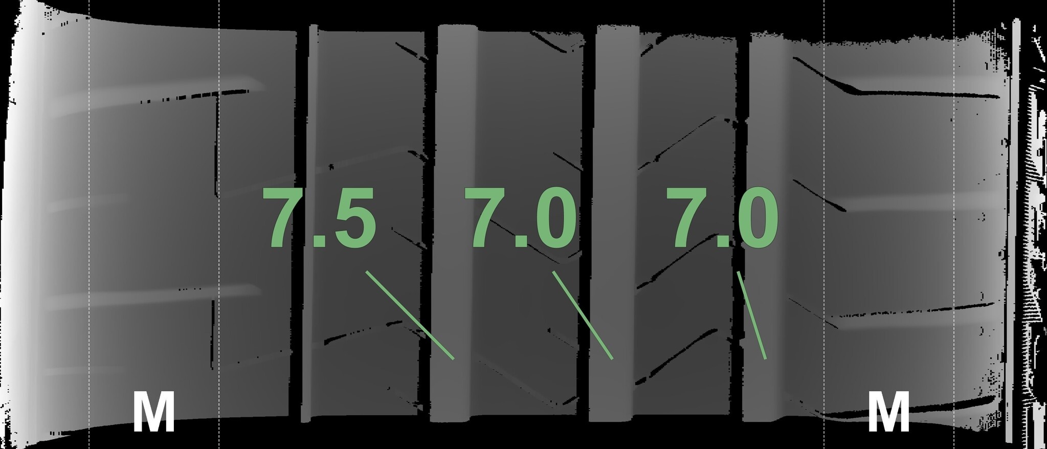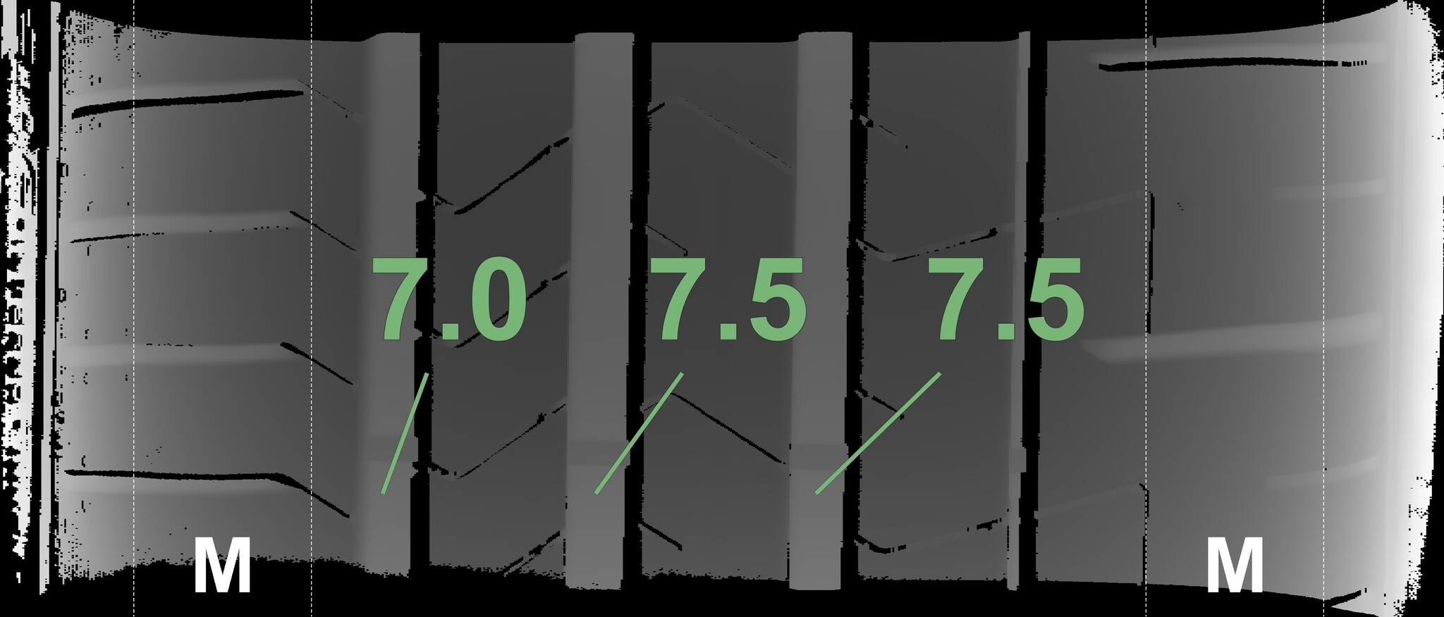 | Zustand | Profiltiefe | DOT | Vorderachse Rechts | Demo-Noppen noch sichtbar | 7.3 mm | 4720 |