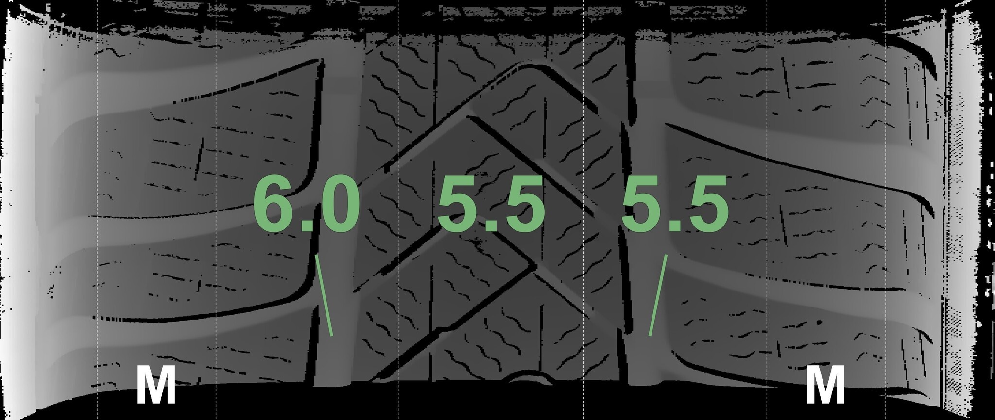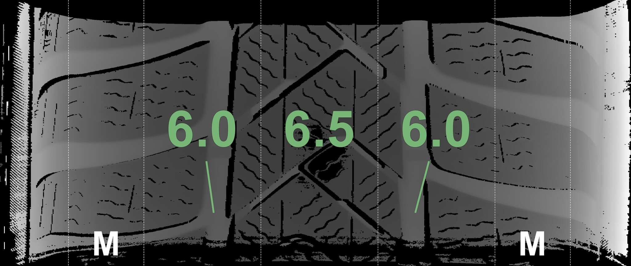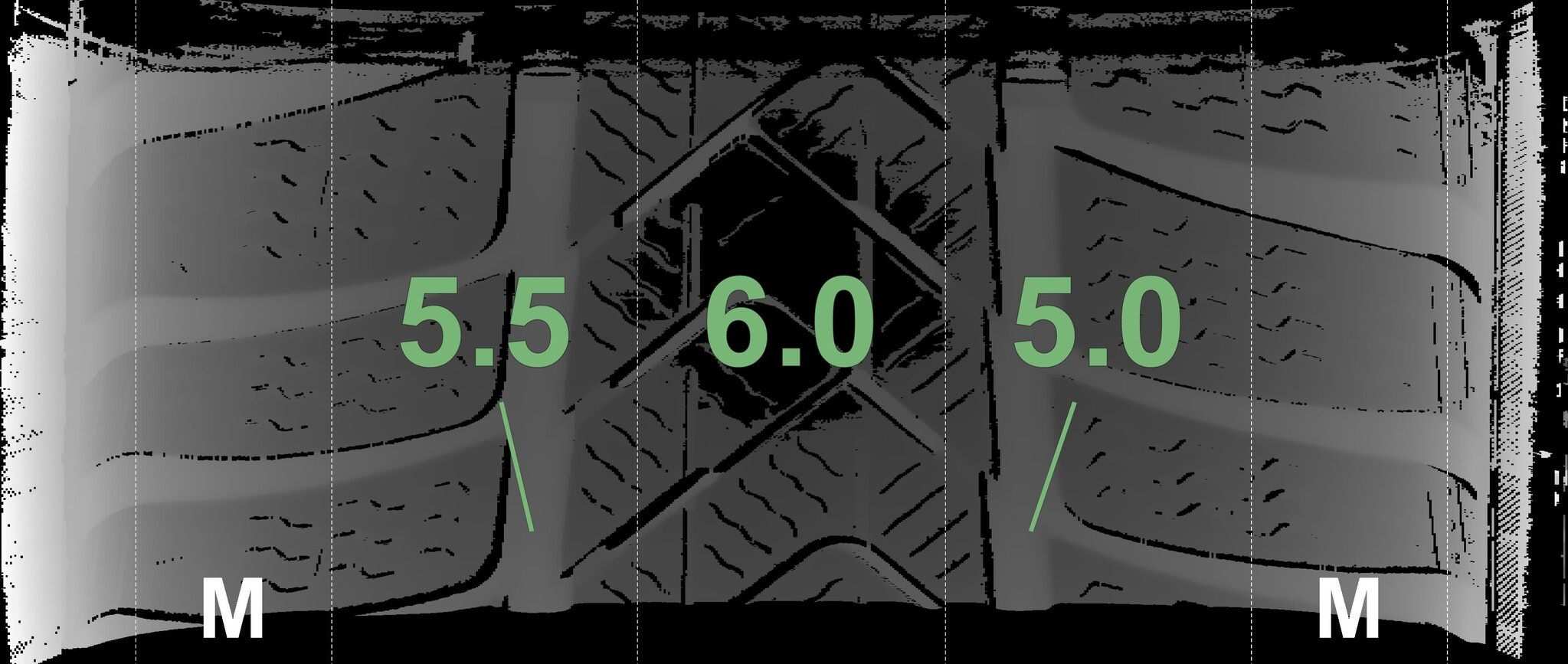 Die gemessenen Profiltiefen und die Details der Felgen sind oben dargestellt.
