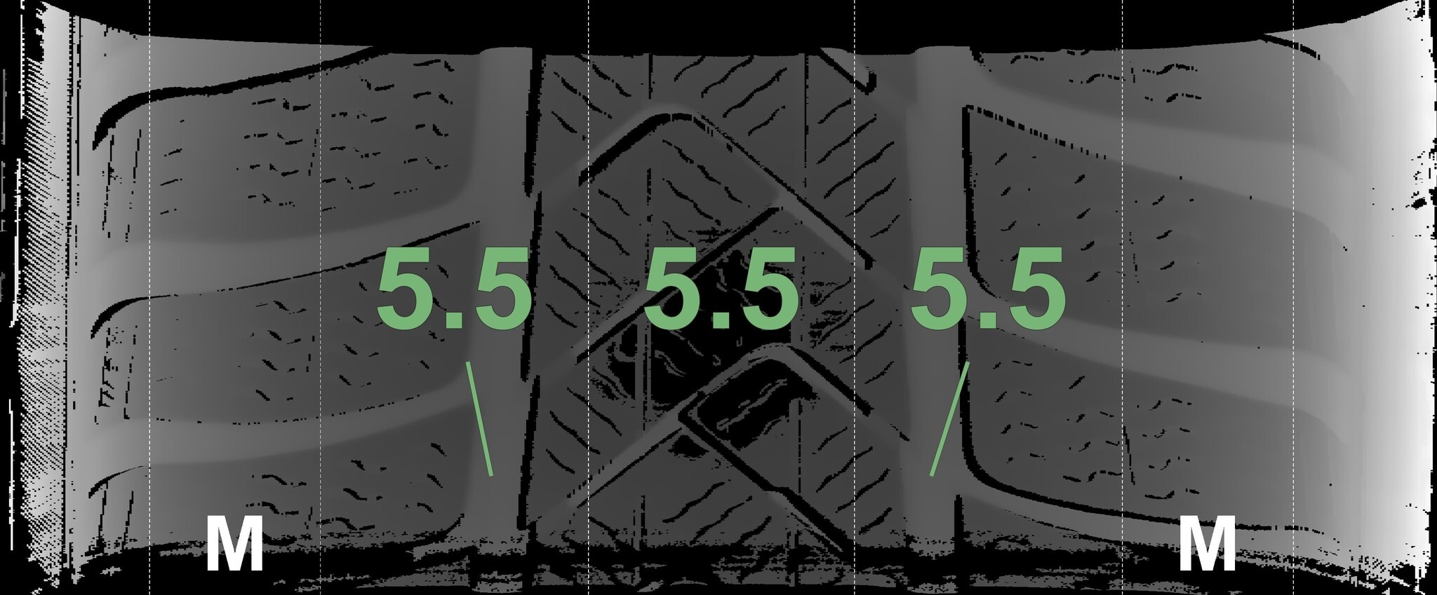 Die auf diesem Radsatz montierten Winterreifen sind mit dem in Deutschland und Österreich vorgeschriebenen Schneeflockensymbol versehen und tragen außerdem die M+S Kennzeichnung.