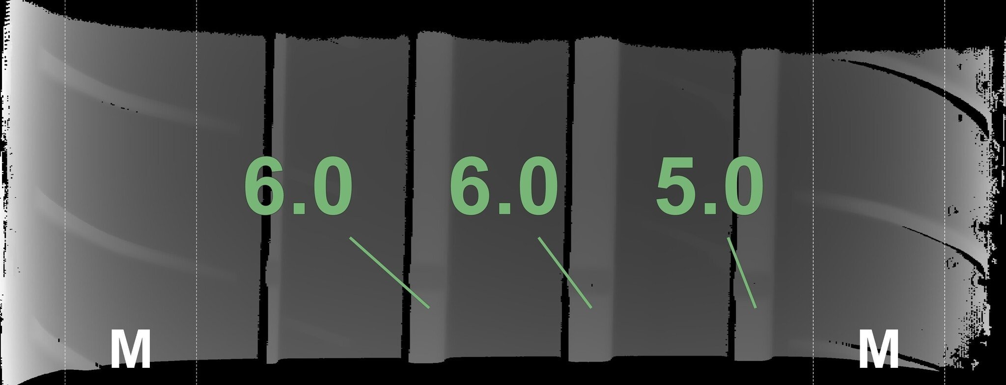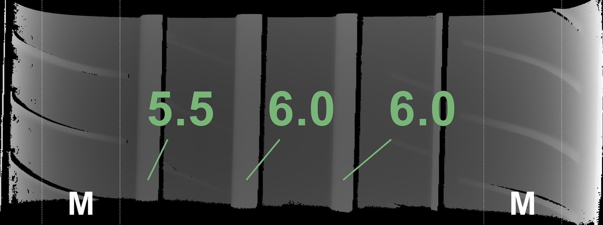 Die gemessenen Profiltiefen und die Details der Felgen sind oben aufgeführt.