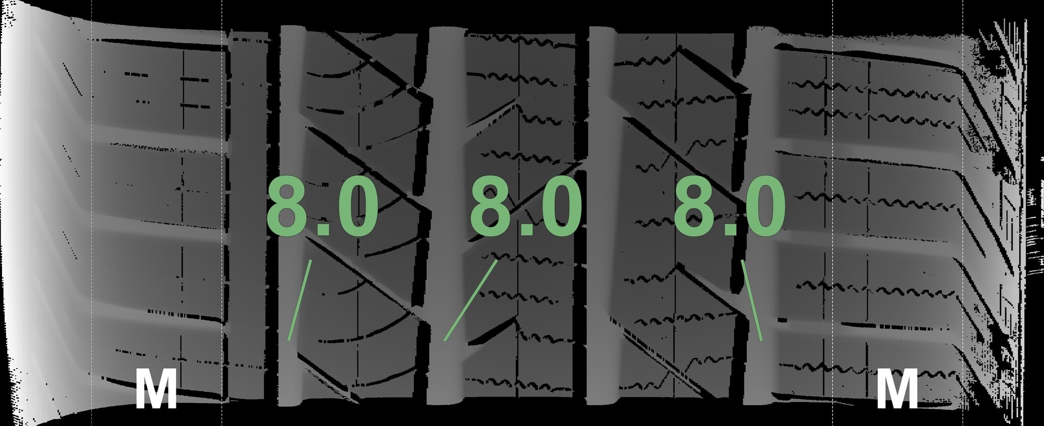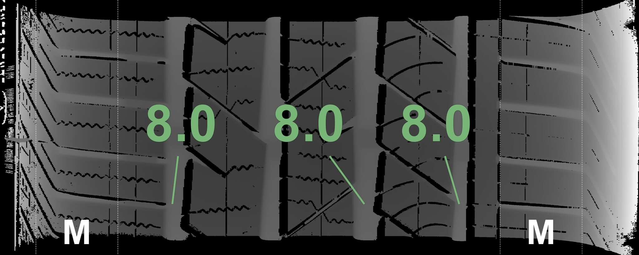 Zustand | Profiltiefe | DOT | Vorderachse Links | Demobolzen noch sichtbar | 8,0 mm | 4622 |