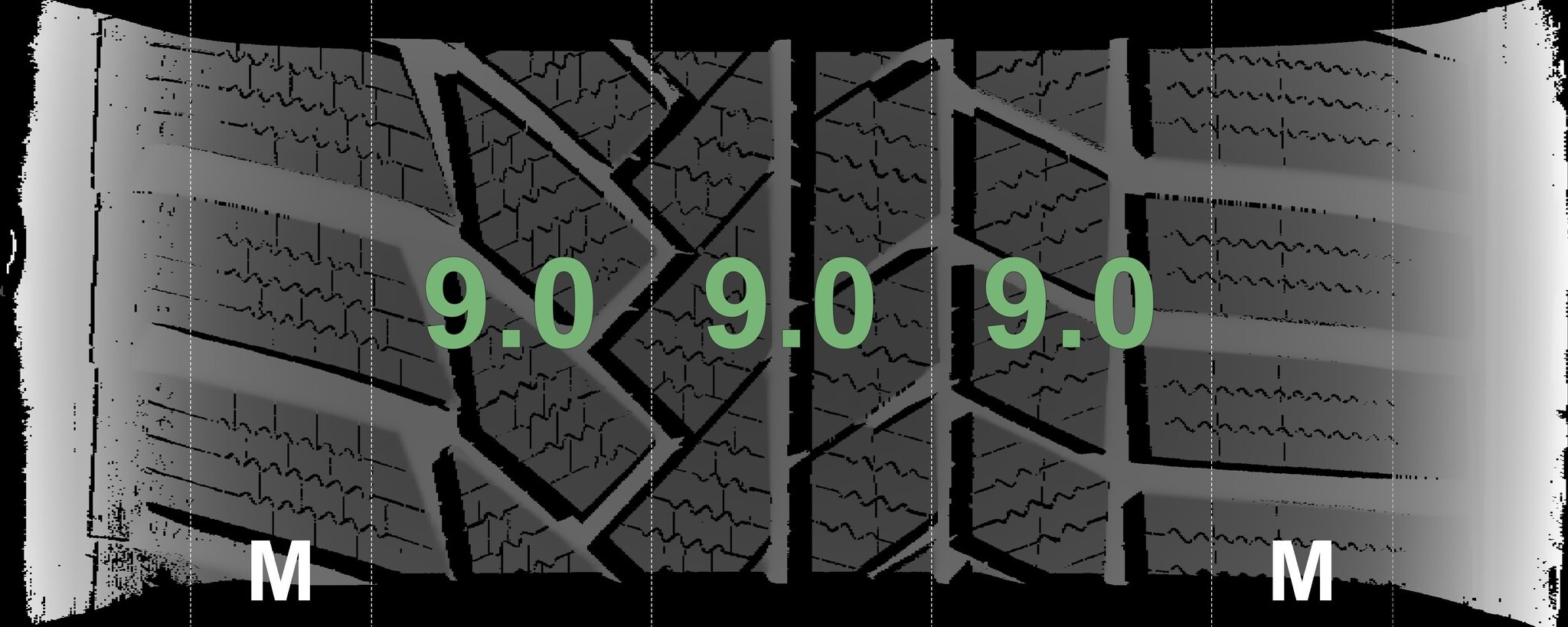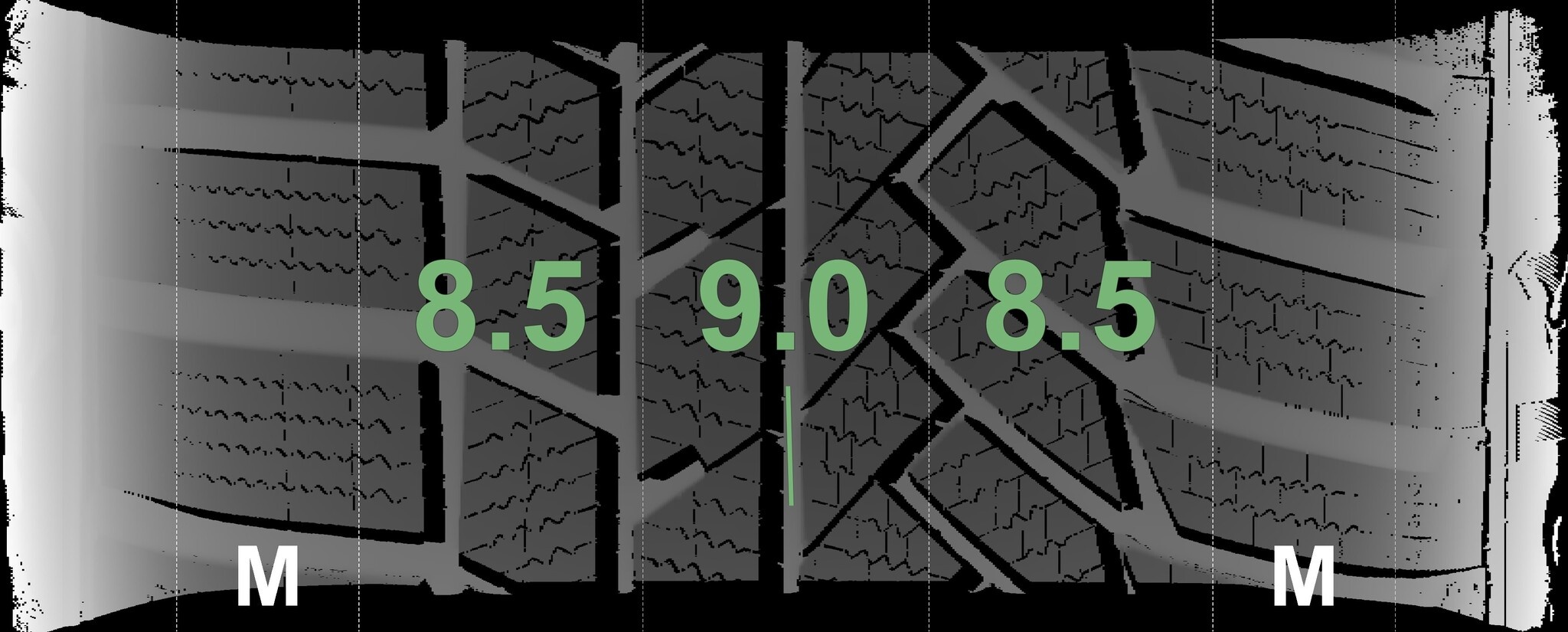 Zustand | Profiltiefe | DOT | Hinterachse Rechts | Neu | 9,0 mm | 0420 |