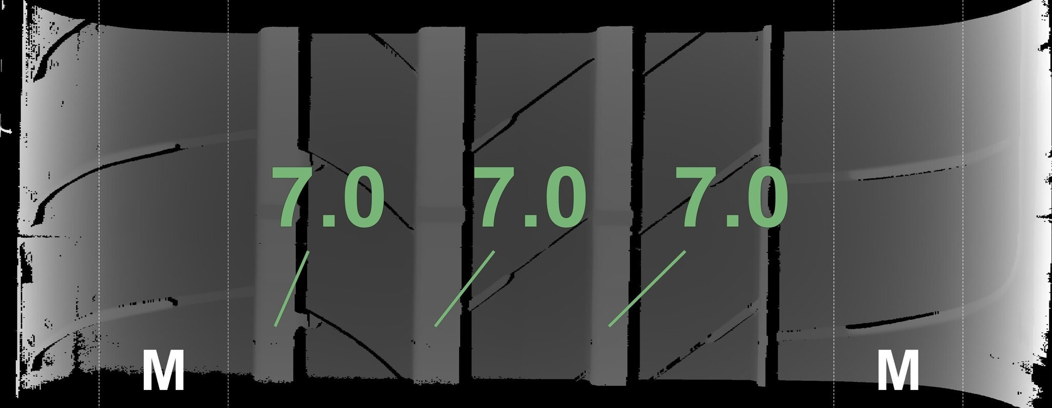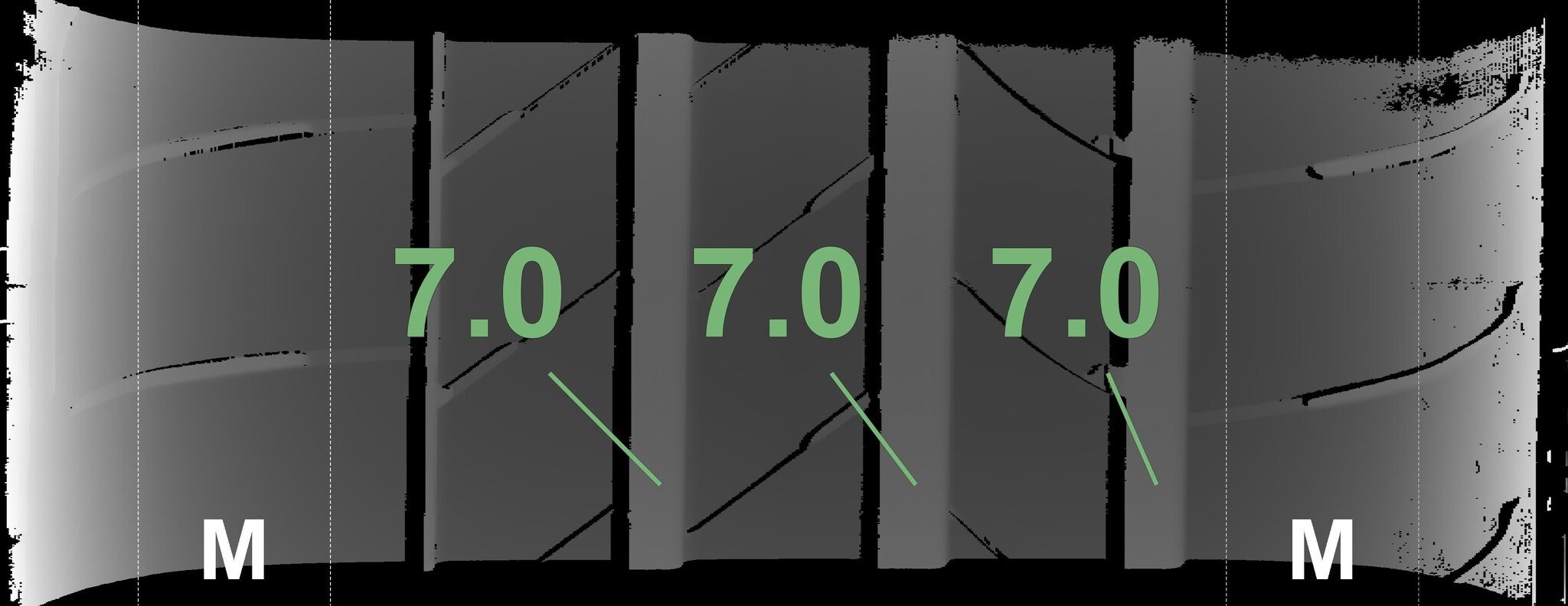 | Zustand | Profiltiefe | DOT | Vorderachse Links | Demo-Noppen noch sichtbar | 7,0 mm | 2918 |