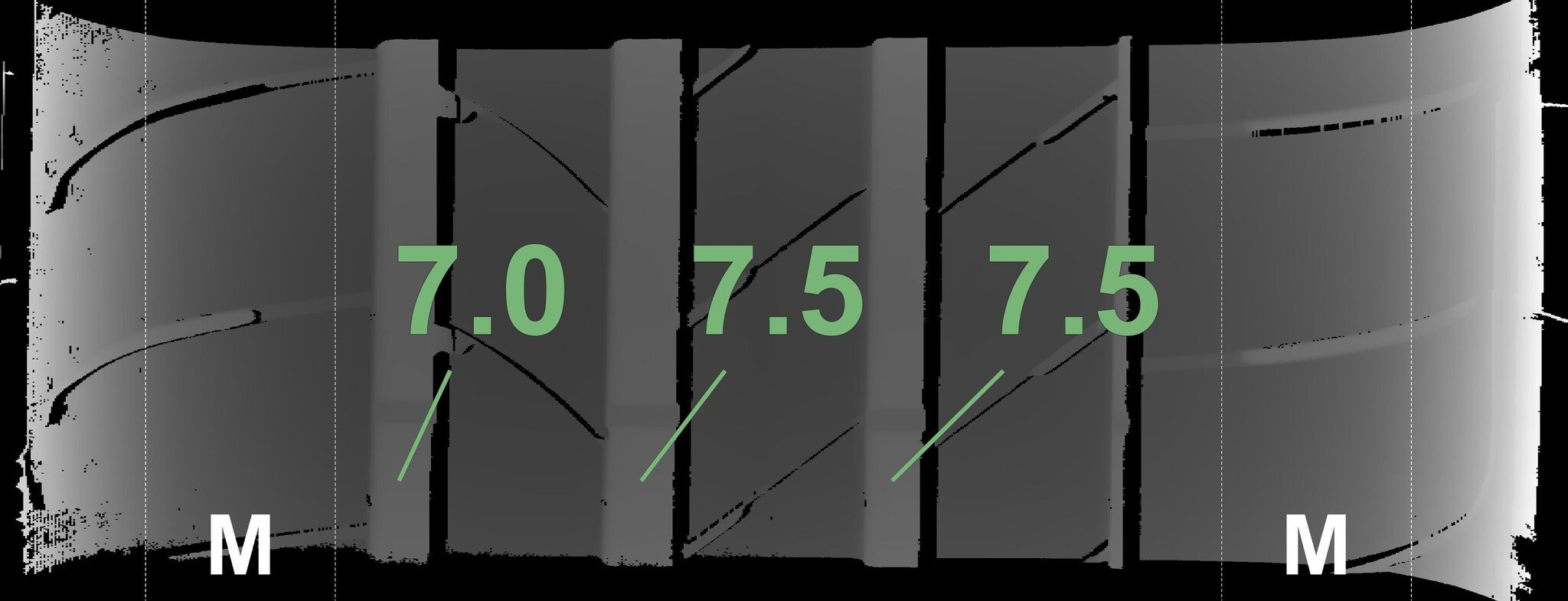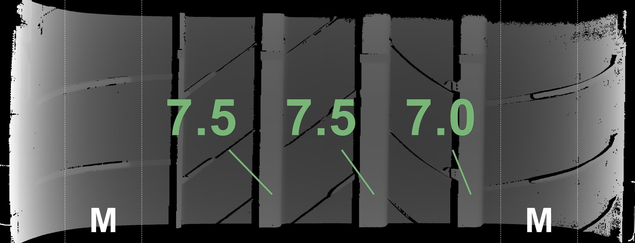 | Zustand | Profiltiefe | DOT | Vorderachse Rechts | Demo-Noppen noch sichtbar | 7,0 mm | 2918 |