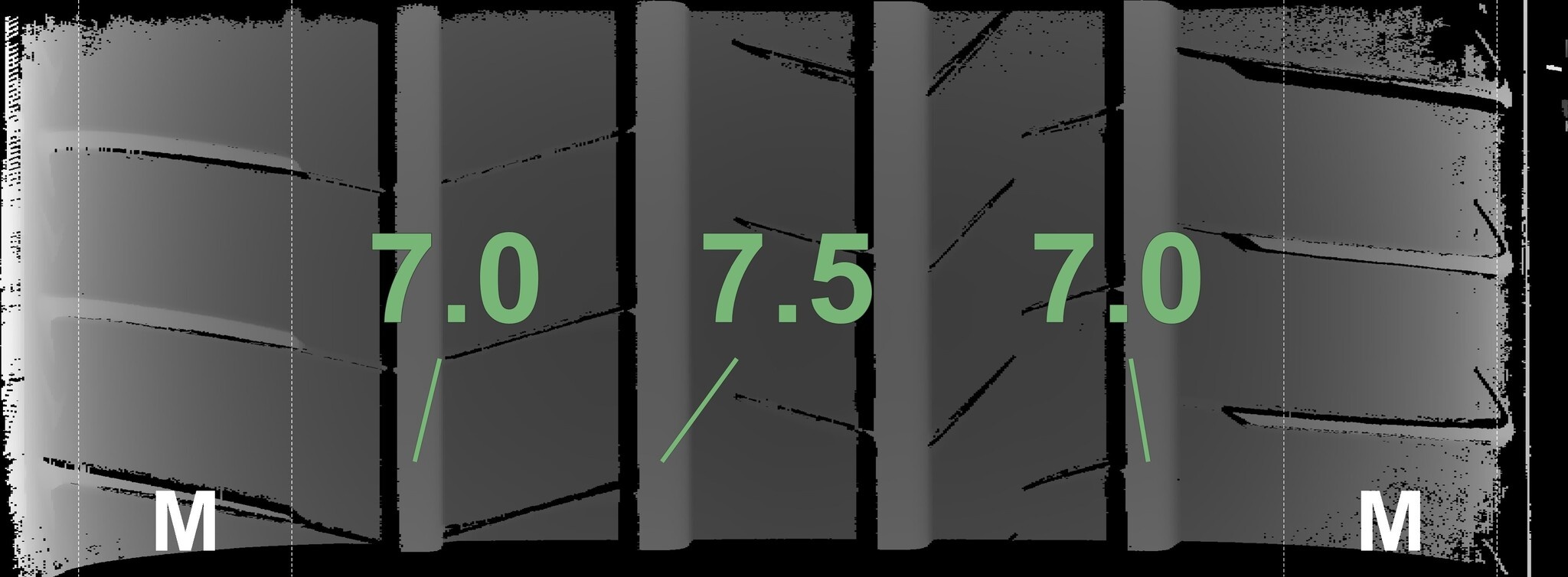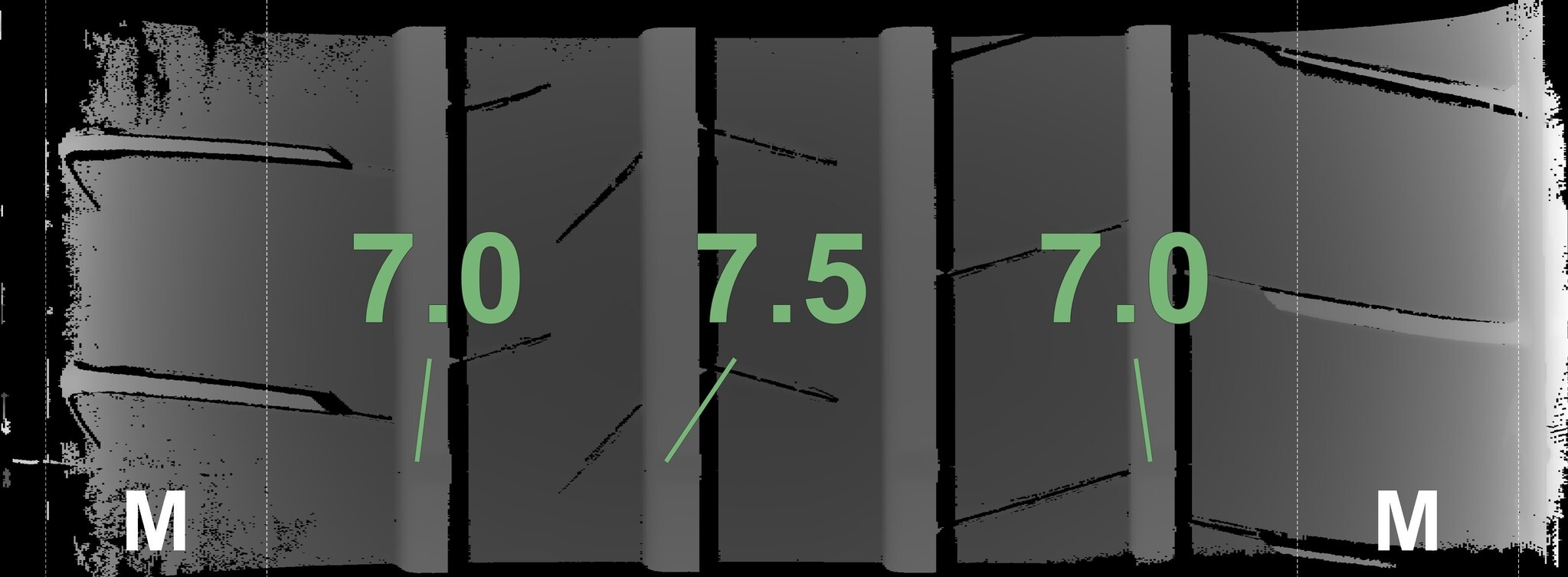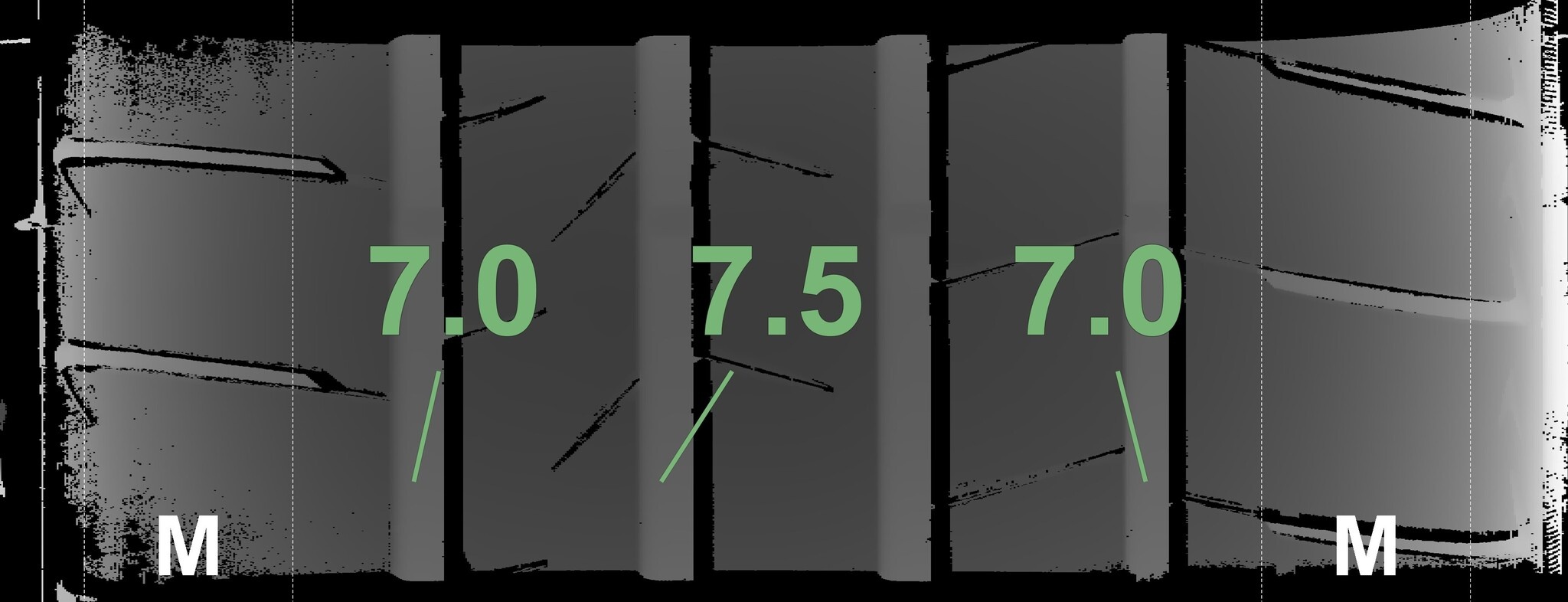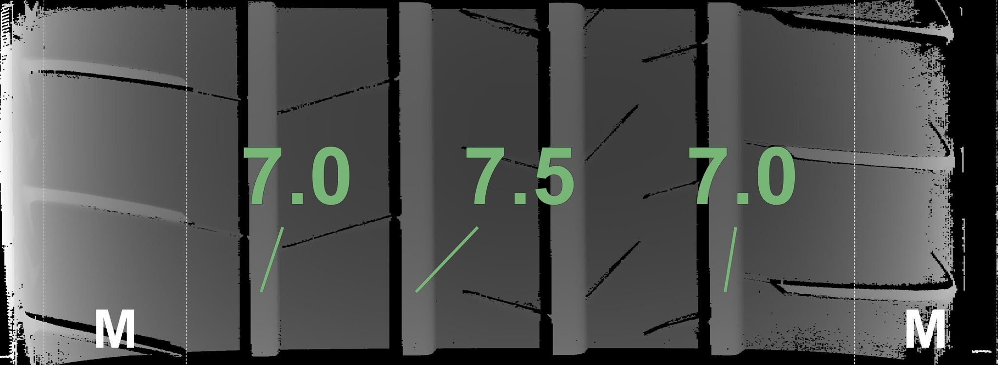 Die gemessenen Profiltiefen und Details der Felgen sind oben dargestellt.