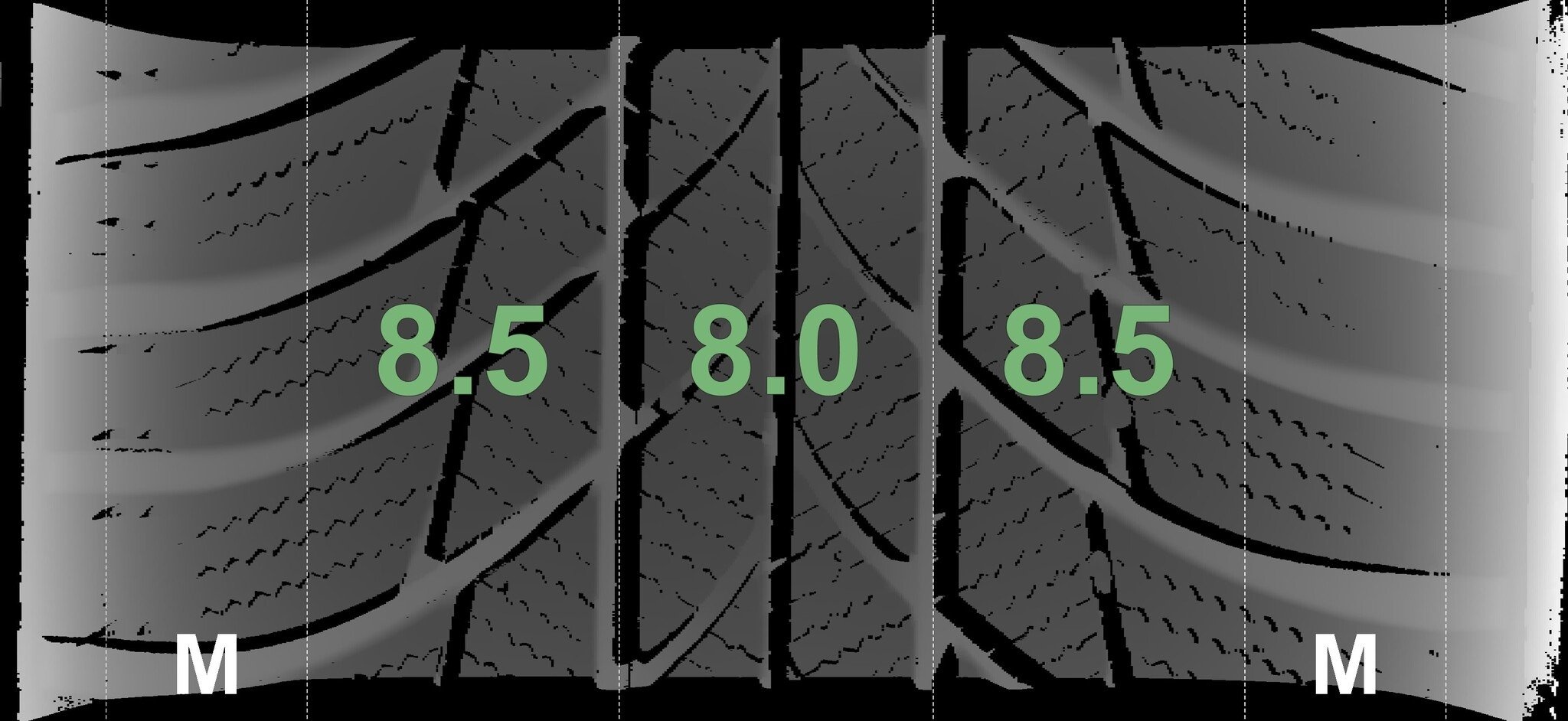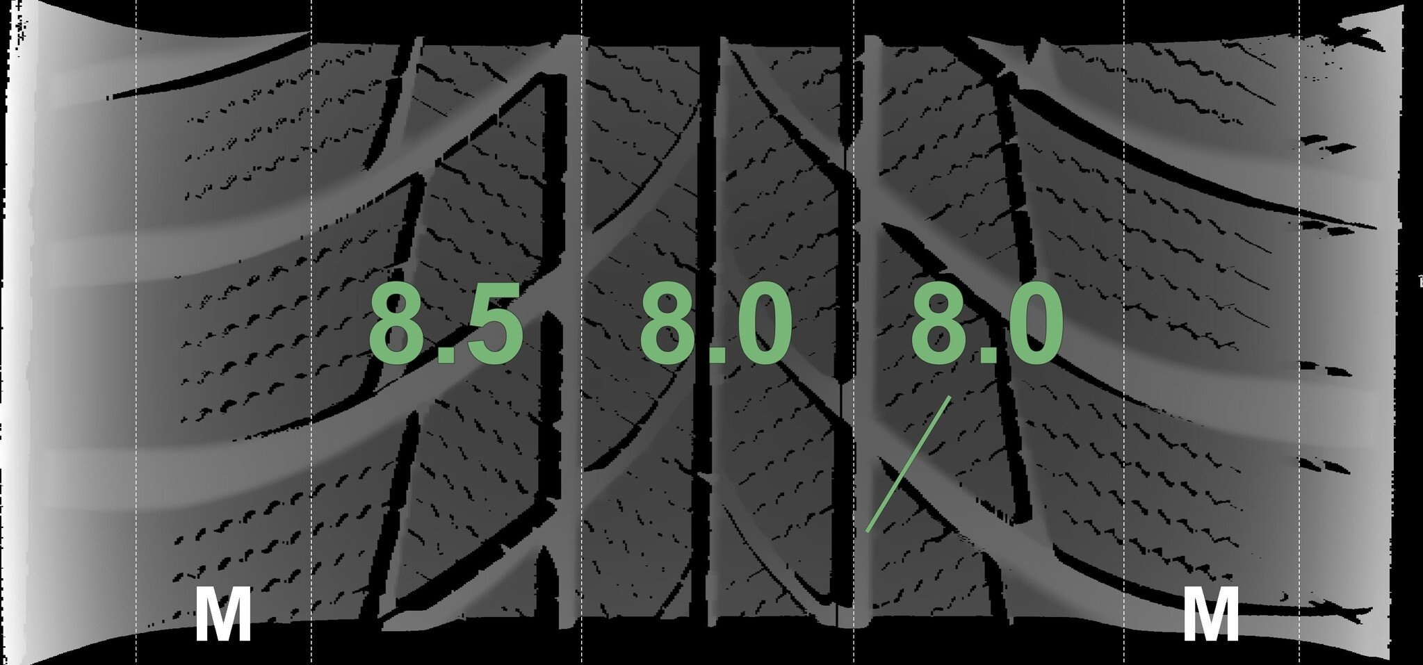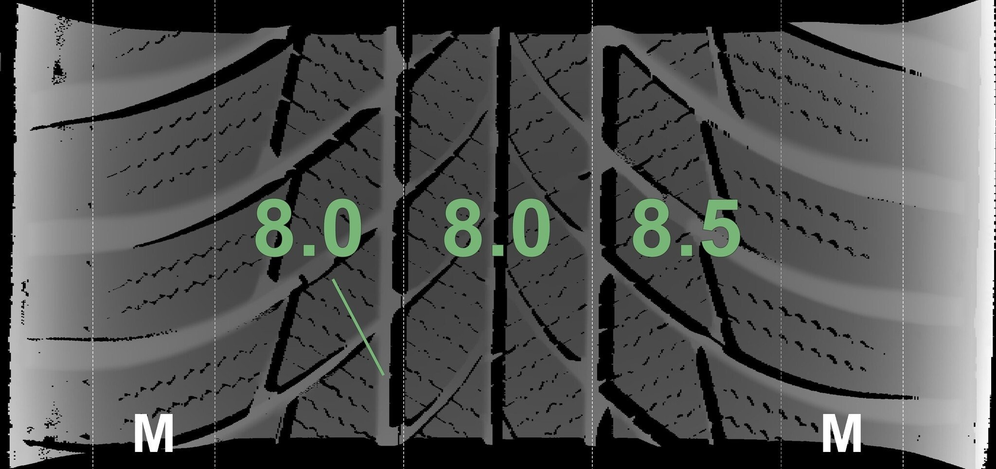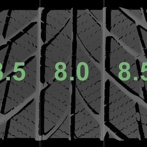 Die gemessenen Profiltiefen und die Details der Felgen sind oben angegeben.