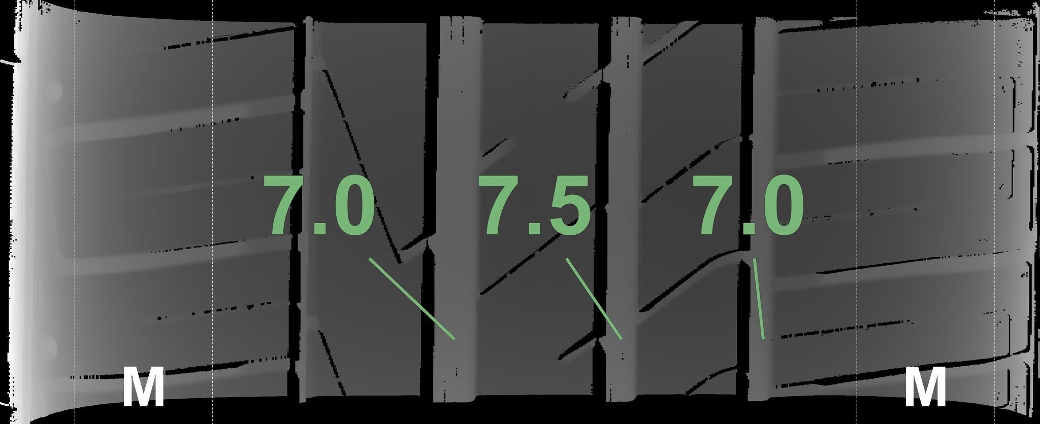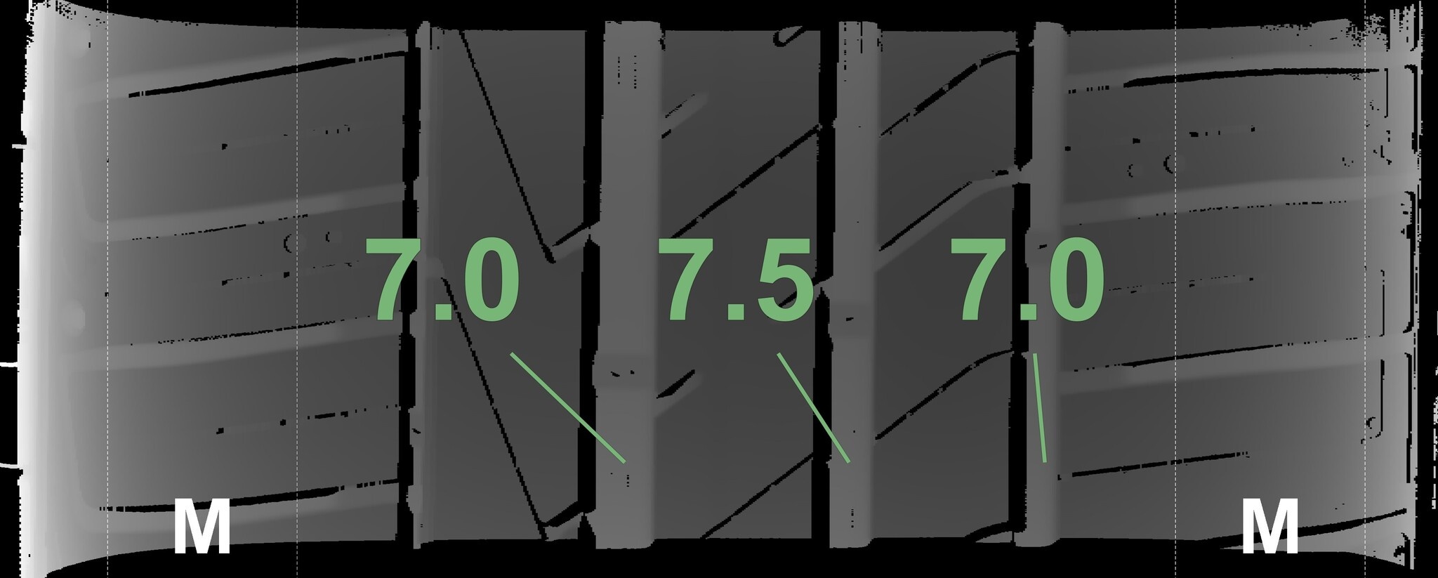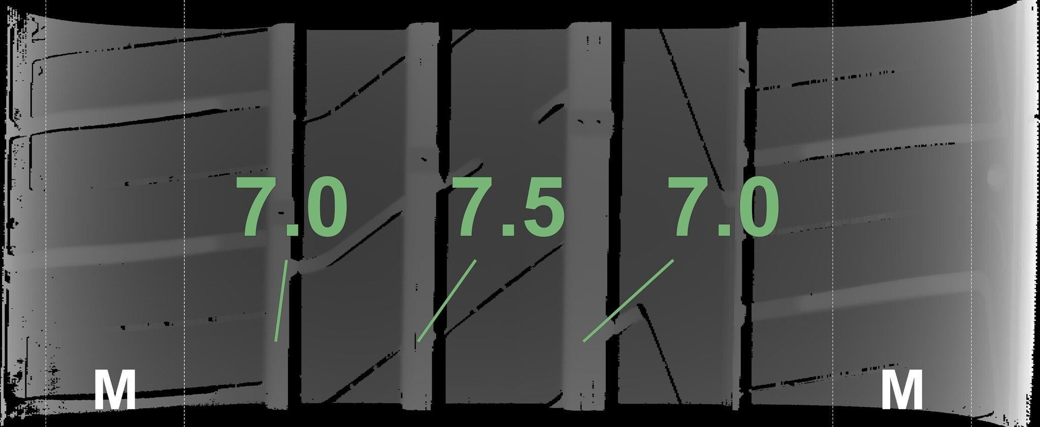 Die gemessenen Profiltiefen und die Details der Felgen sind oben dargestellt.