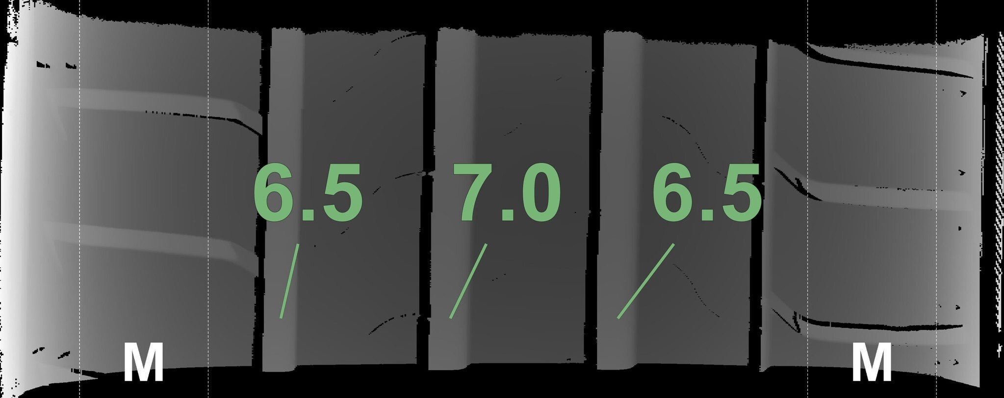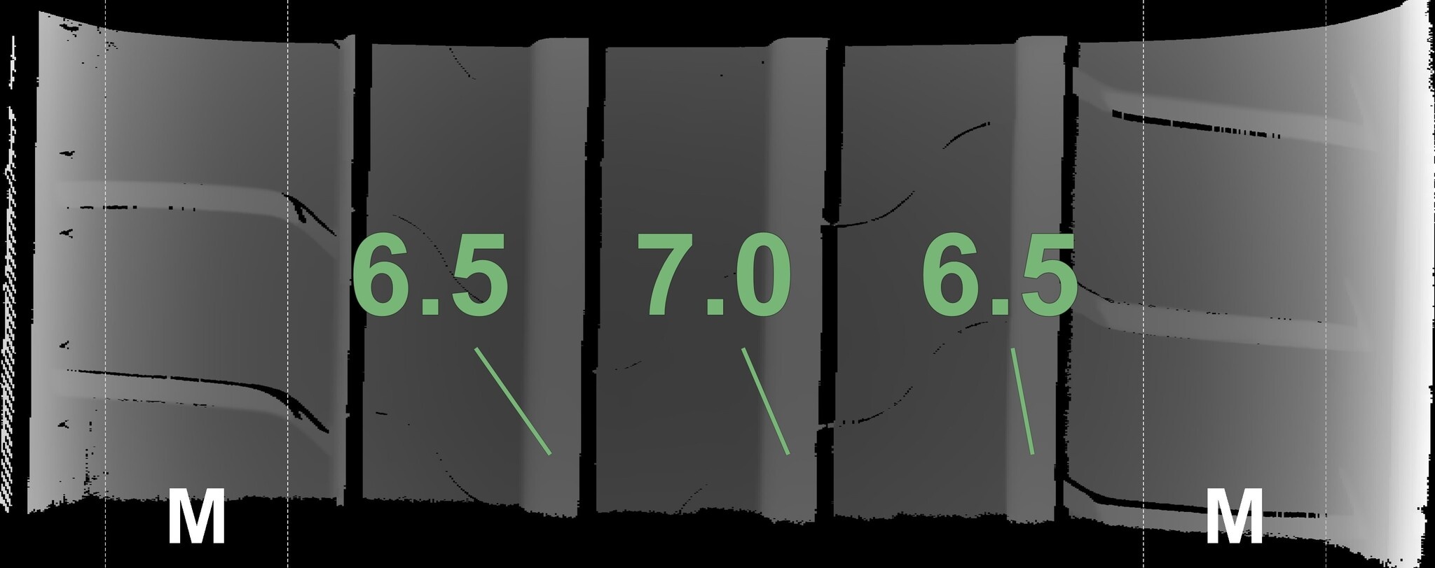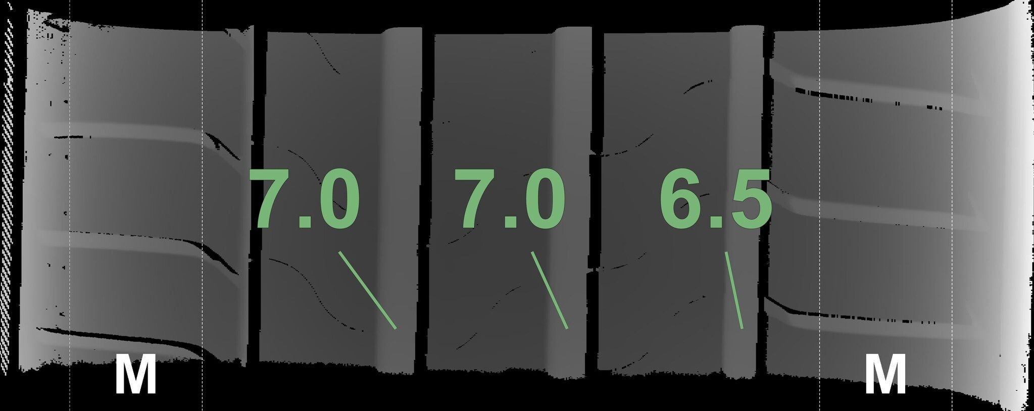 Die gemessenen Profiltiefen und die Details der Felgen sind oben dargestellt.