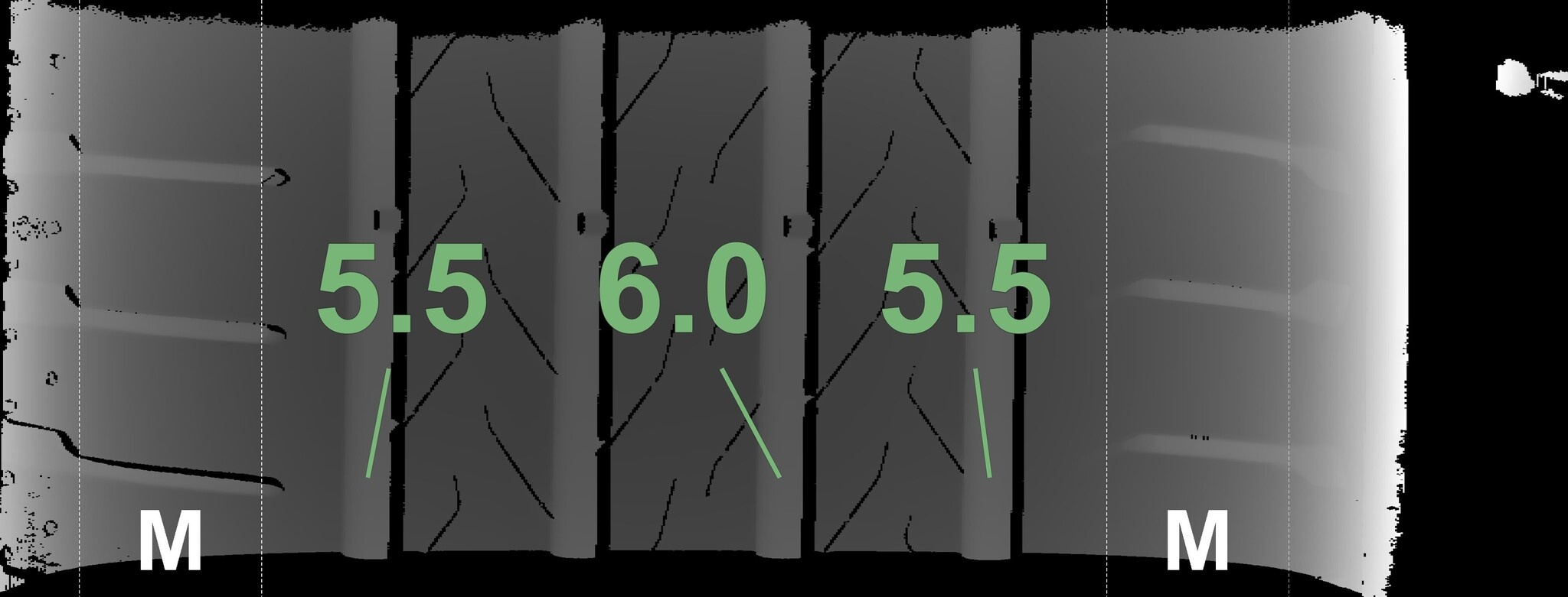 Die gemessenen Profiltiefen und die Details der Felgen sind oben dargestellt.