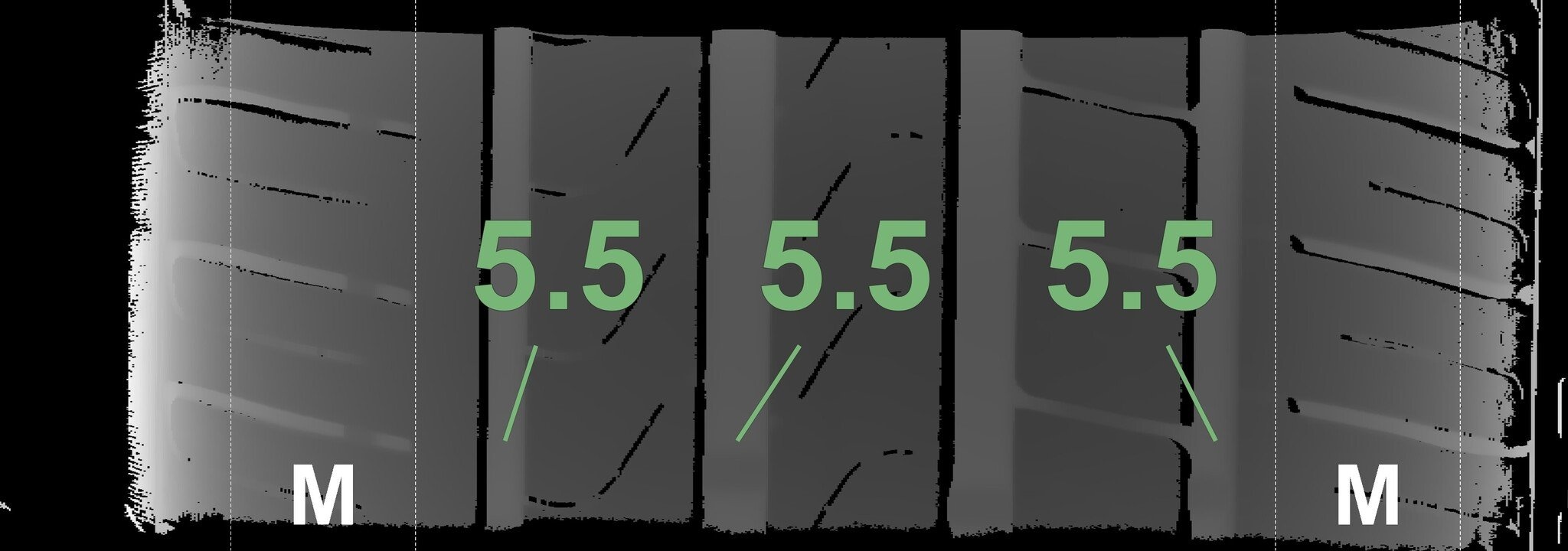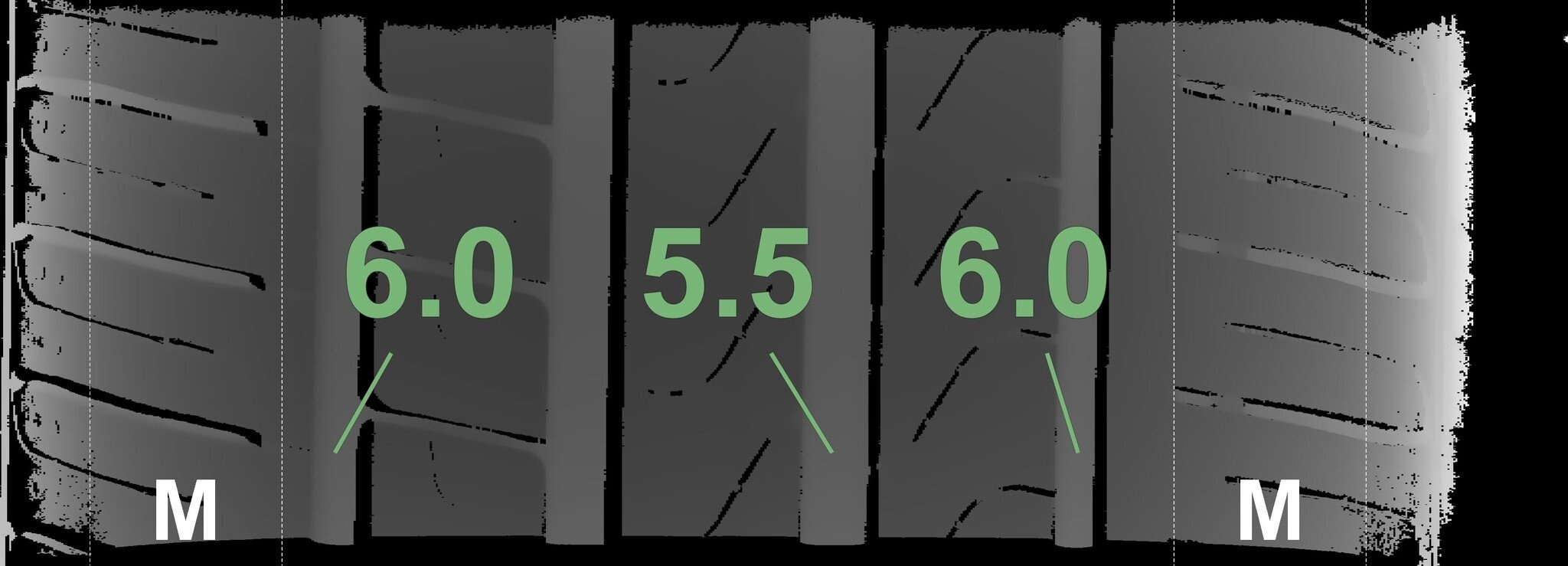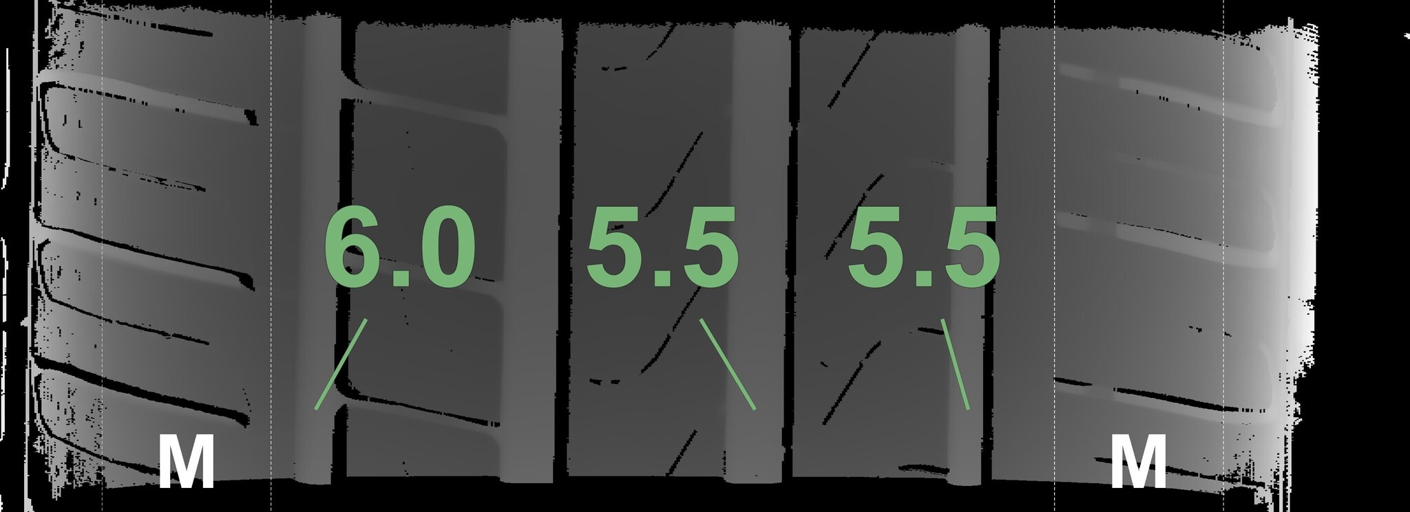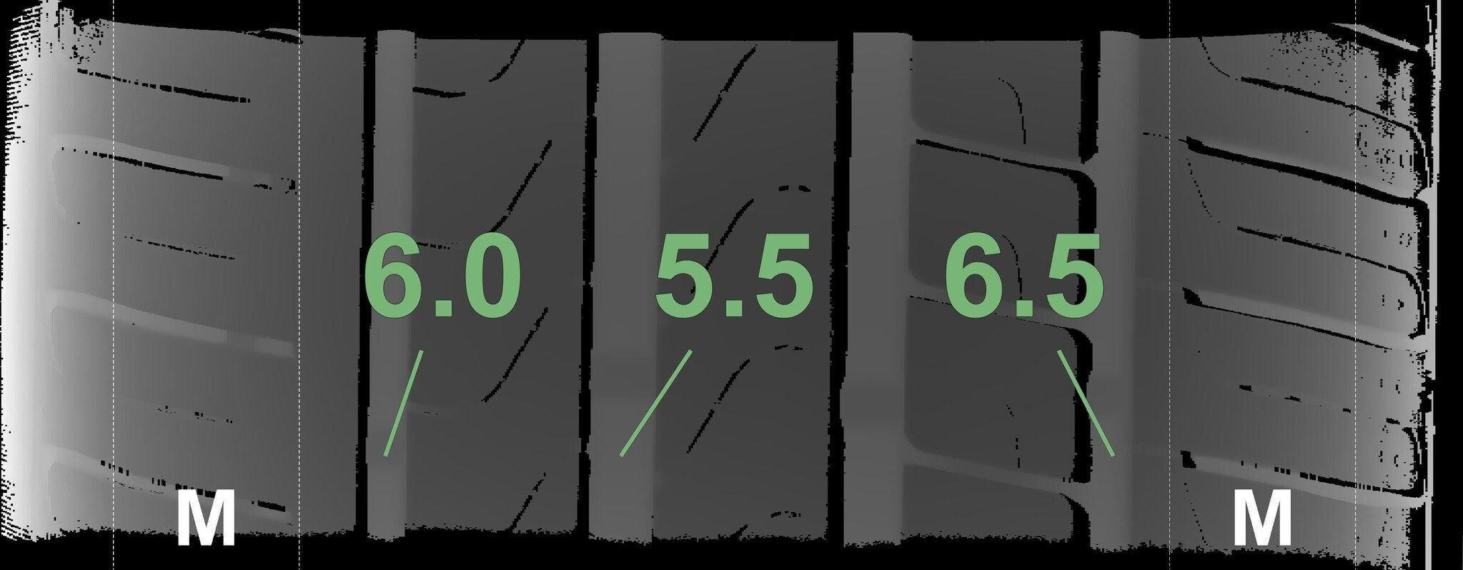 Die gemessenen Profiltiefen und die Details der Felgen sind oben dargestellt.