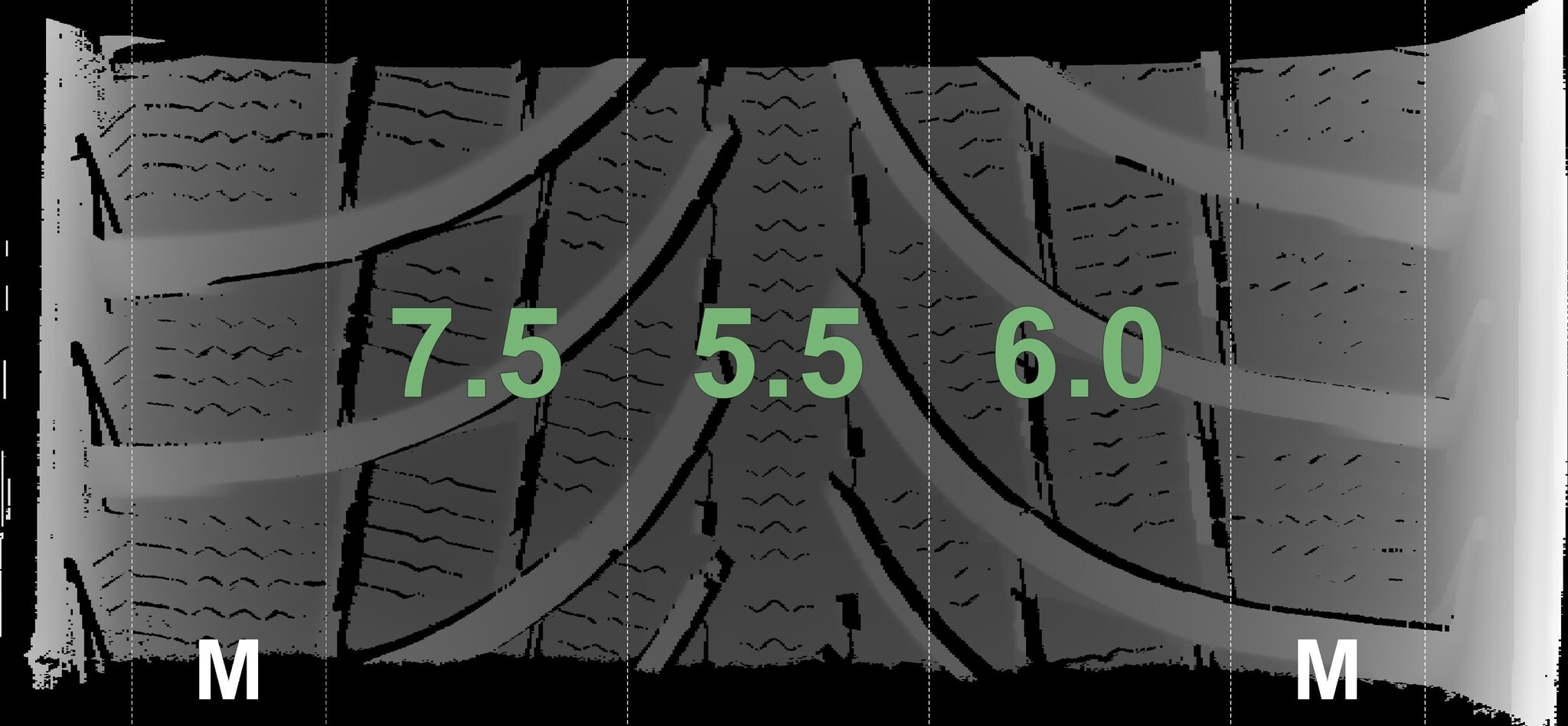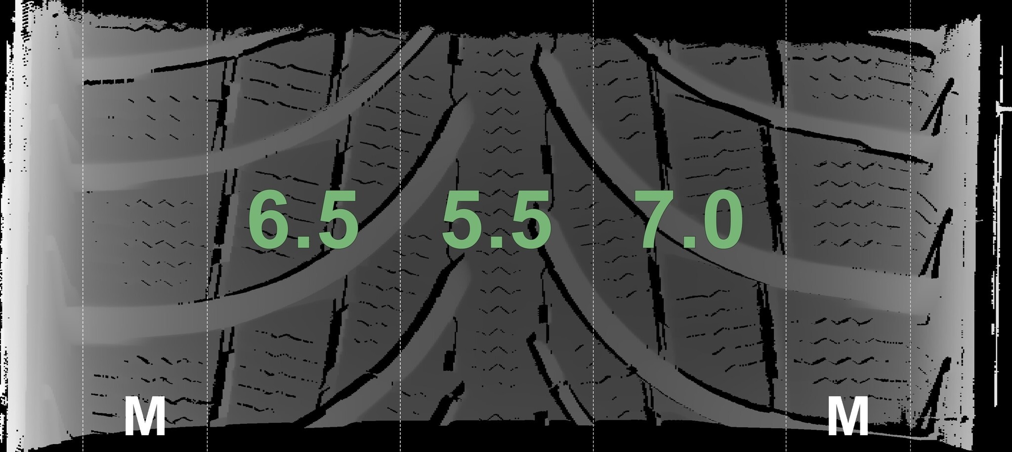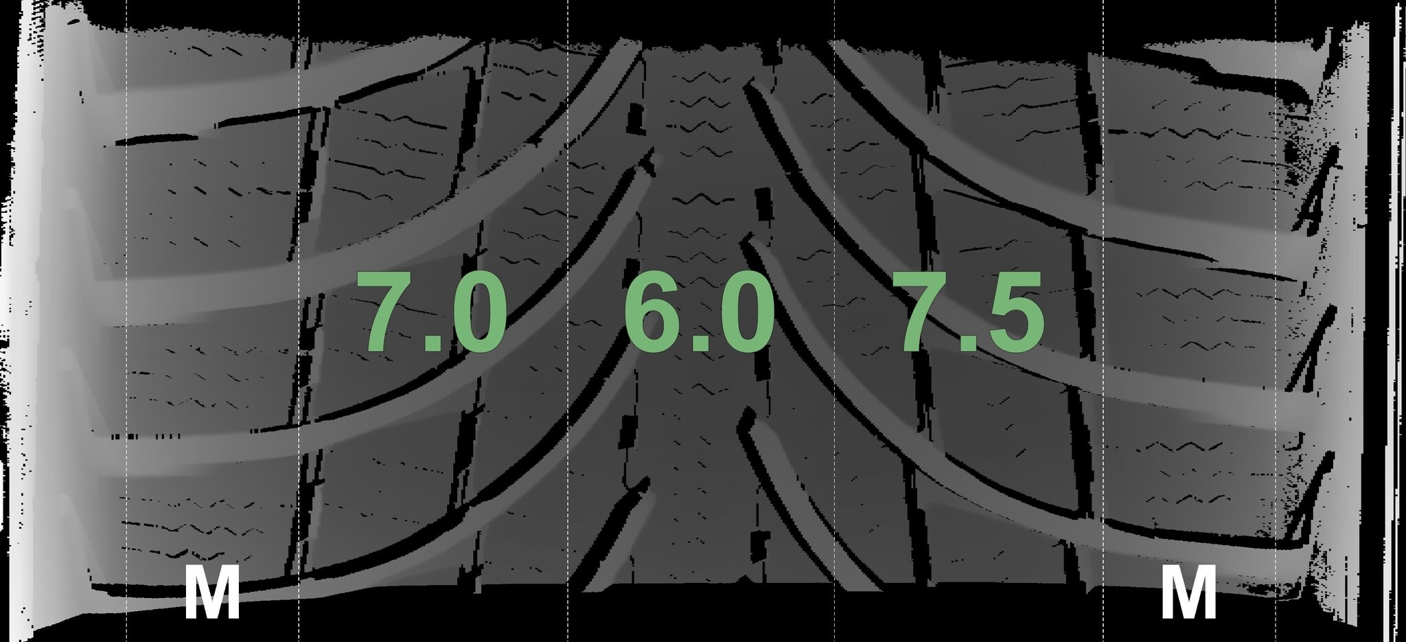 Die gemessenen Profiltiefen und die Details der Felgen sind oben dargestellt.
