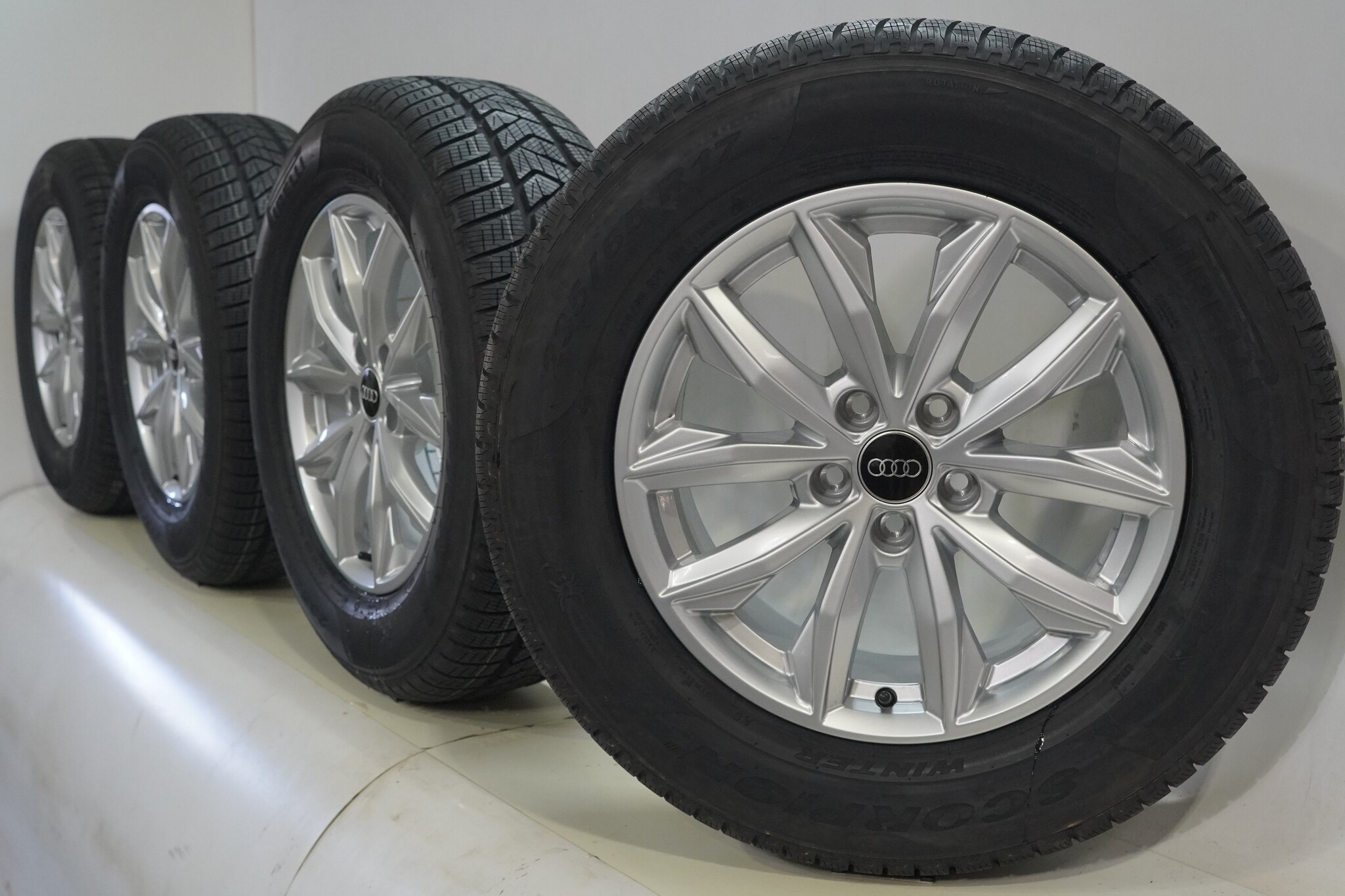 Originaler Radsatz von Audi, 17 Zoll Felgen mit Pirelli Scorpion Winter Winterkompletträdern. Diese Felgen sind Originalfelgen der Marke Audi und geeignet für: Audi Q5 SQ5 80A.
