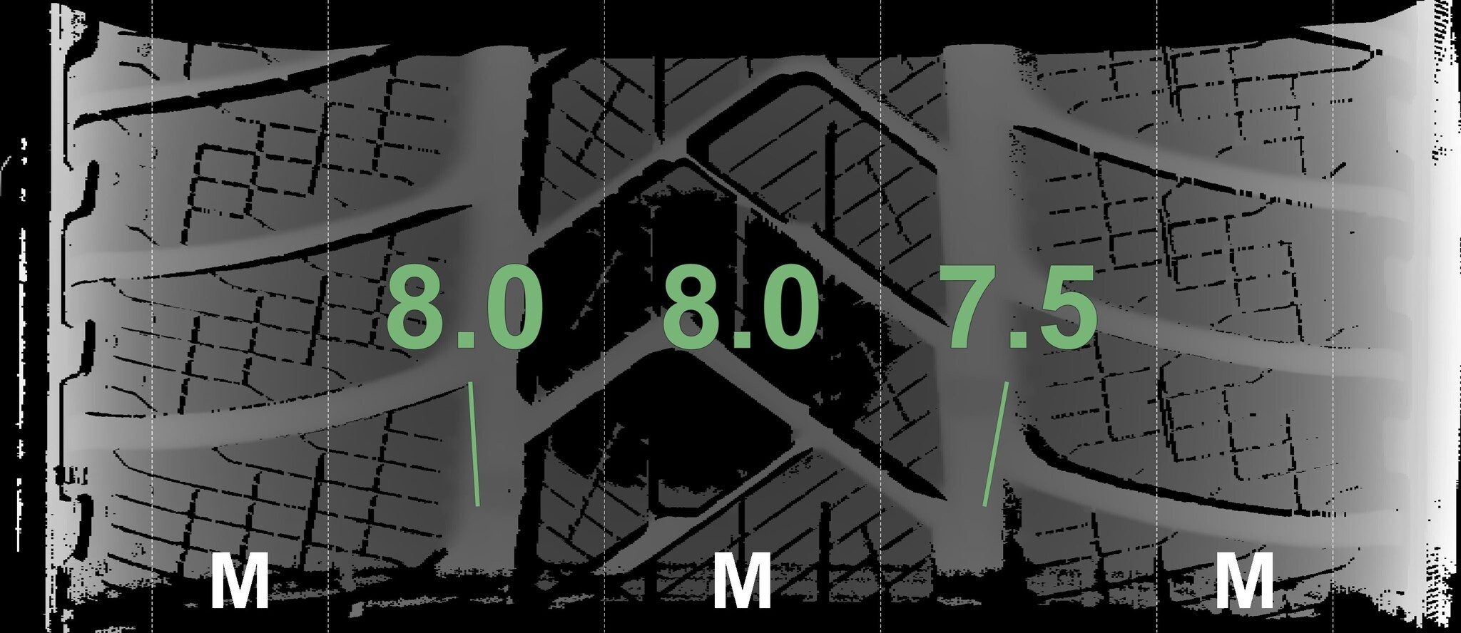 Die gemessenen Profiltiefen und die Details der Felgen sind oben angegeben.