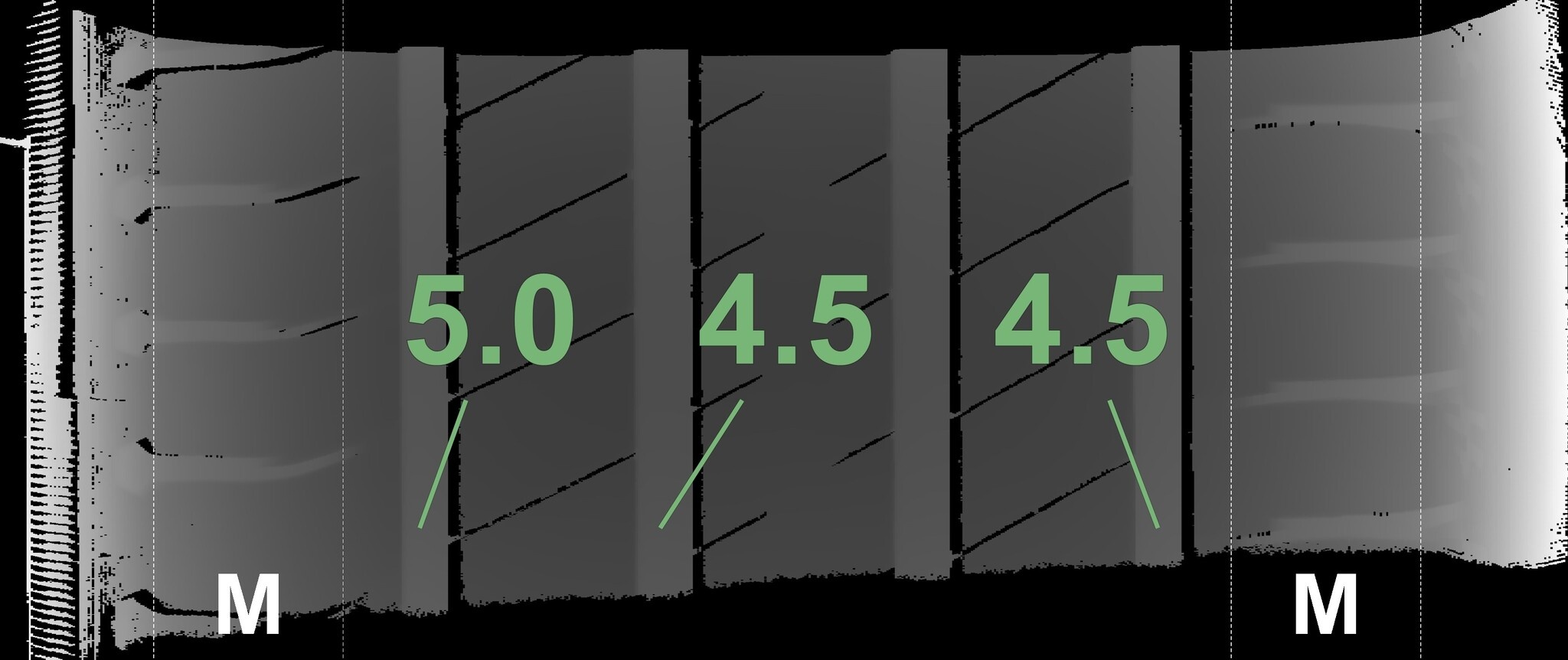 Die gemessenen Profiltiefen und Details zu den Felgen sind oben dargestellt.