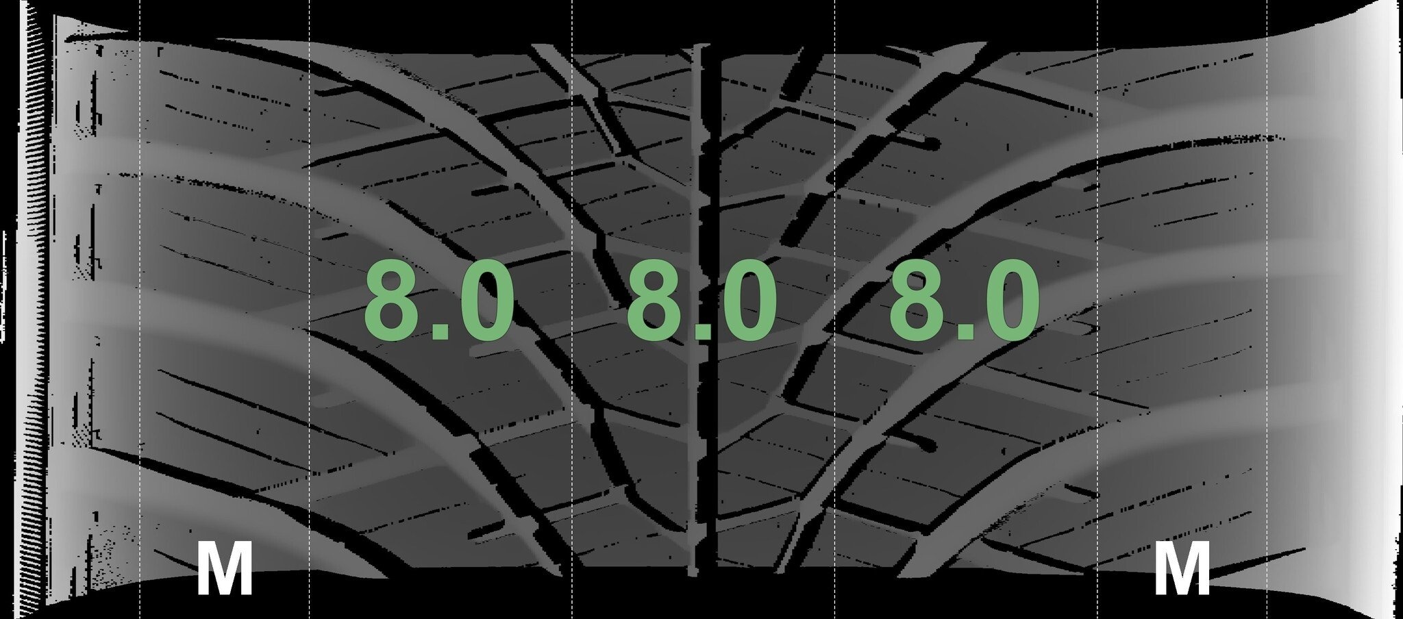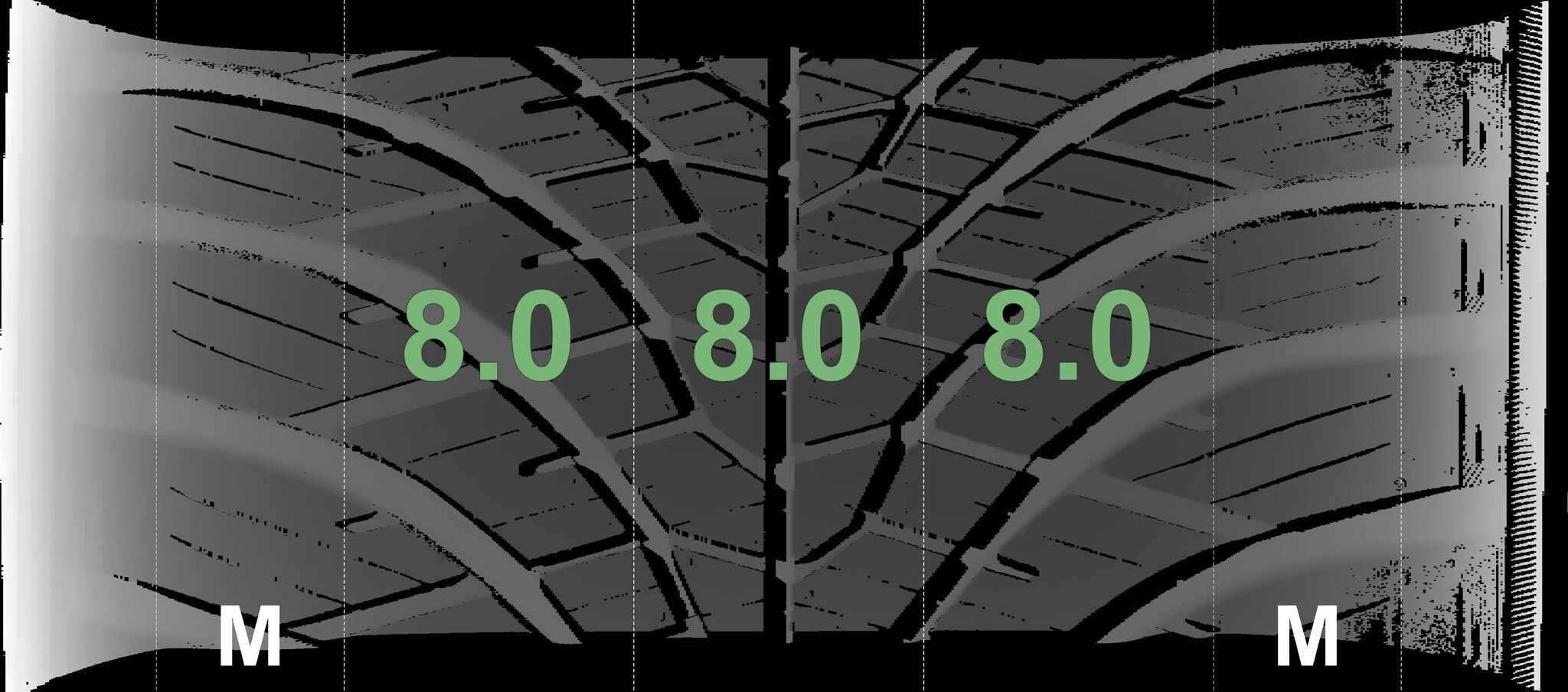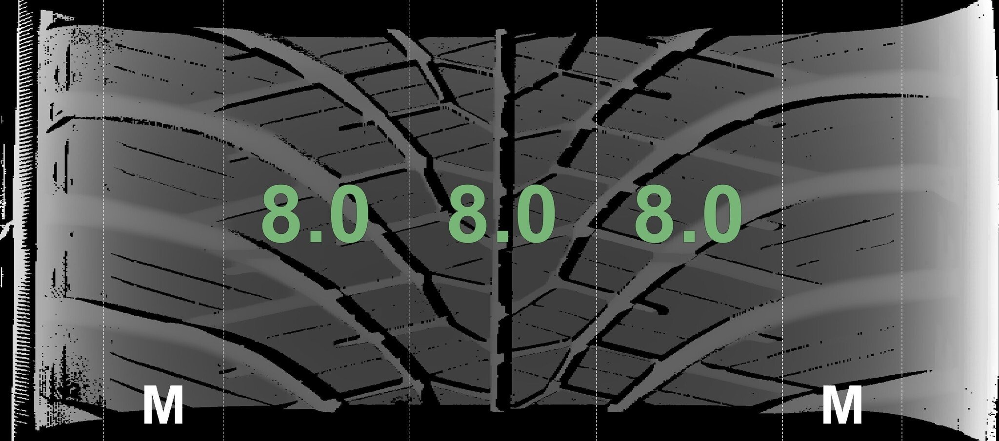 Zustand | Profiltiefe | DOT | Hinterachse Links | Neu | 8,0 mm | 4624 |