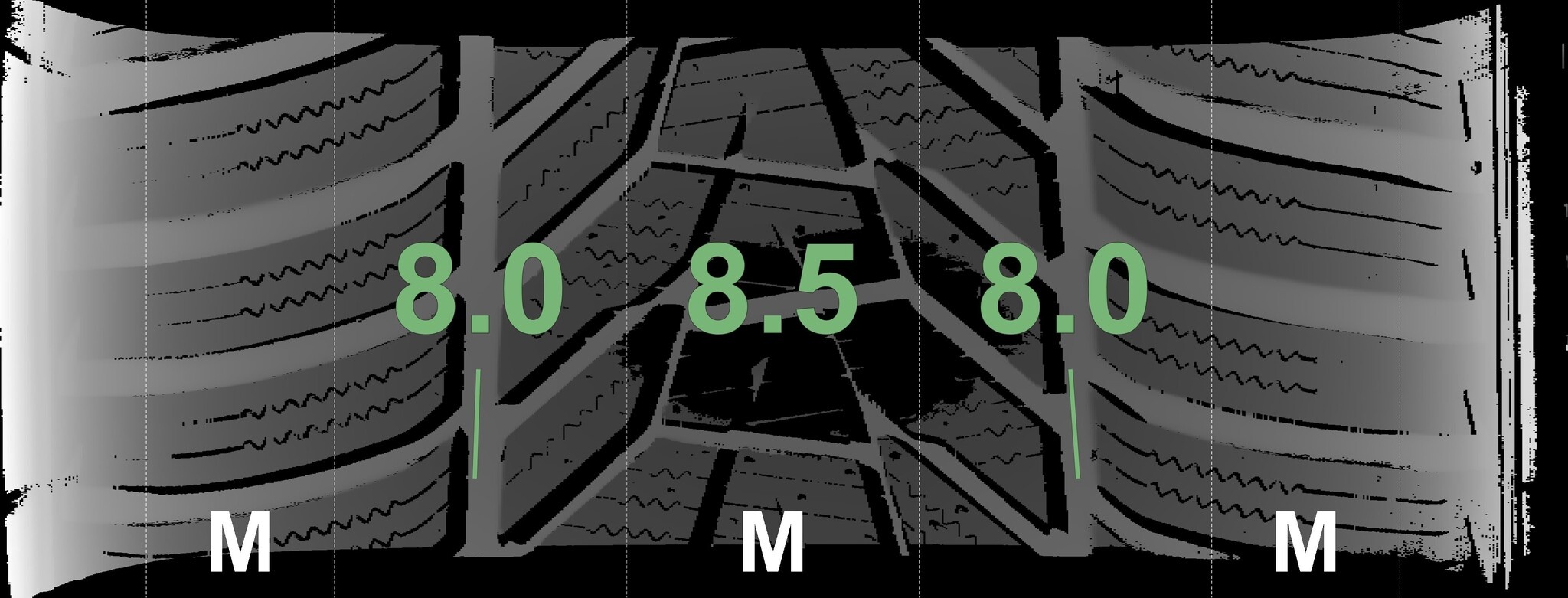 Zustand | Profiltiefe | DOT | Vorderachse Links | Neu | 8,0 mm | 2724 |