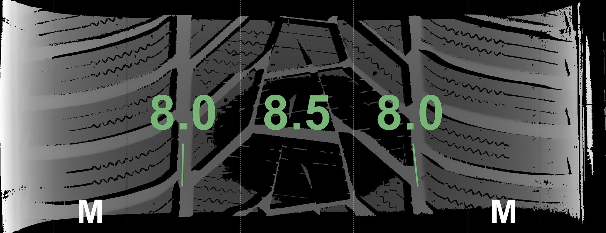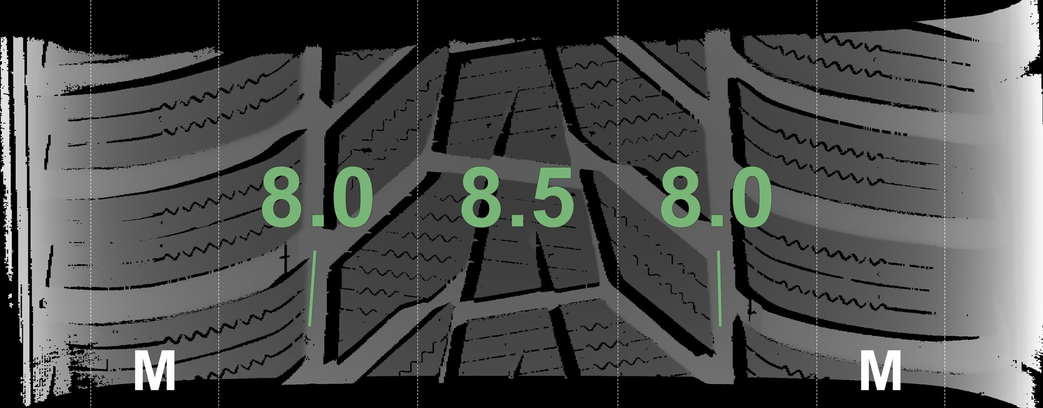 Zustand | Profiltiefe | DOT | Hinterachse Rechts | Neu | 8,0 mm | 2724 |