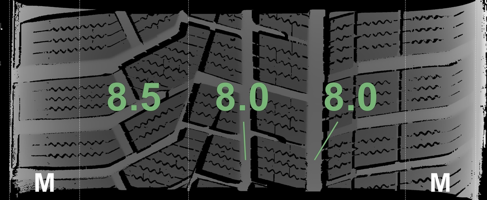 | Zustand | Profiltiefe | DOT | Vorderachse Links | Neu | 8,0 mm | 2822 |