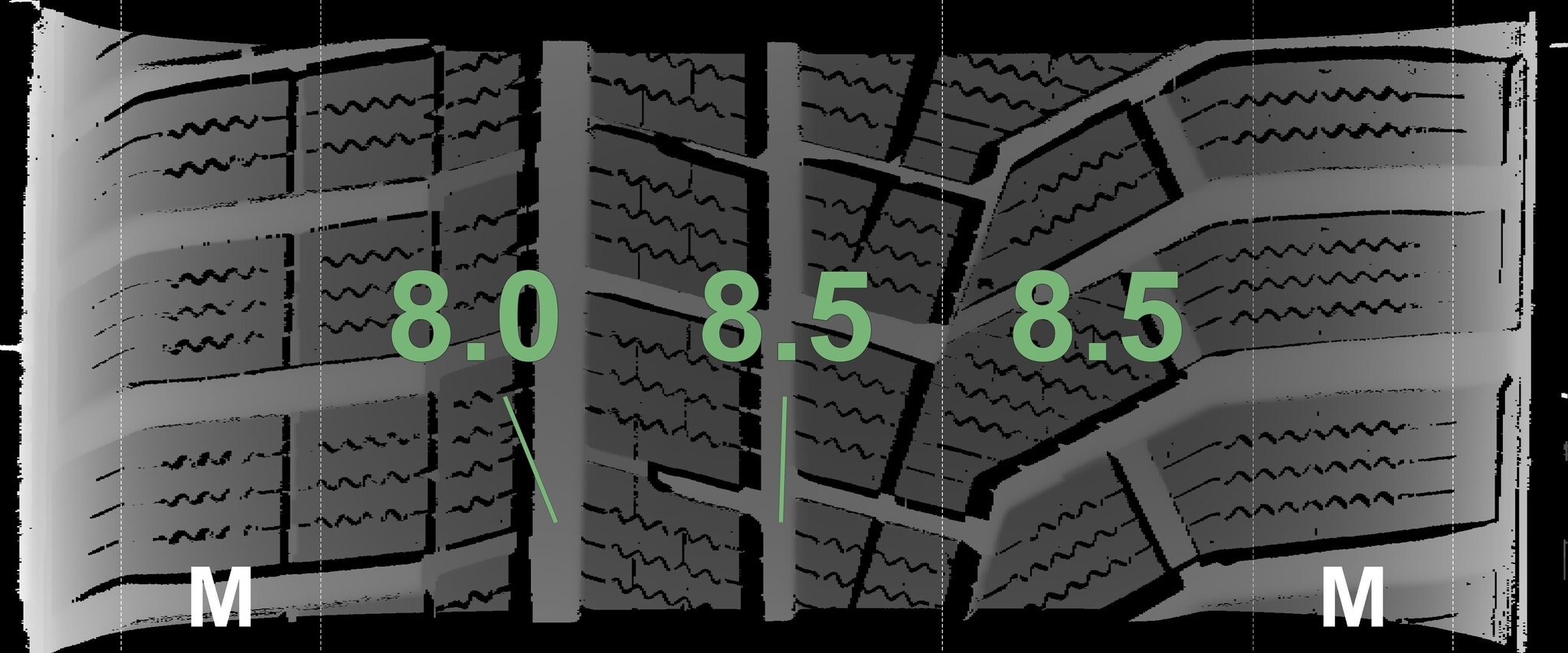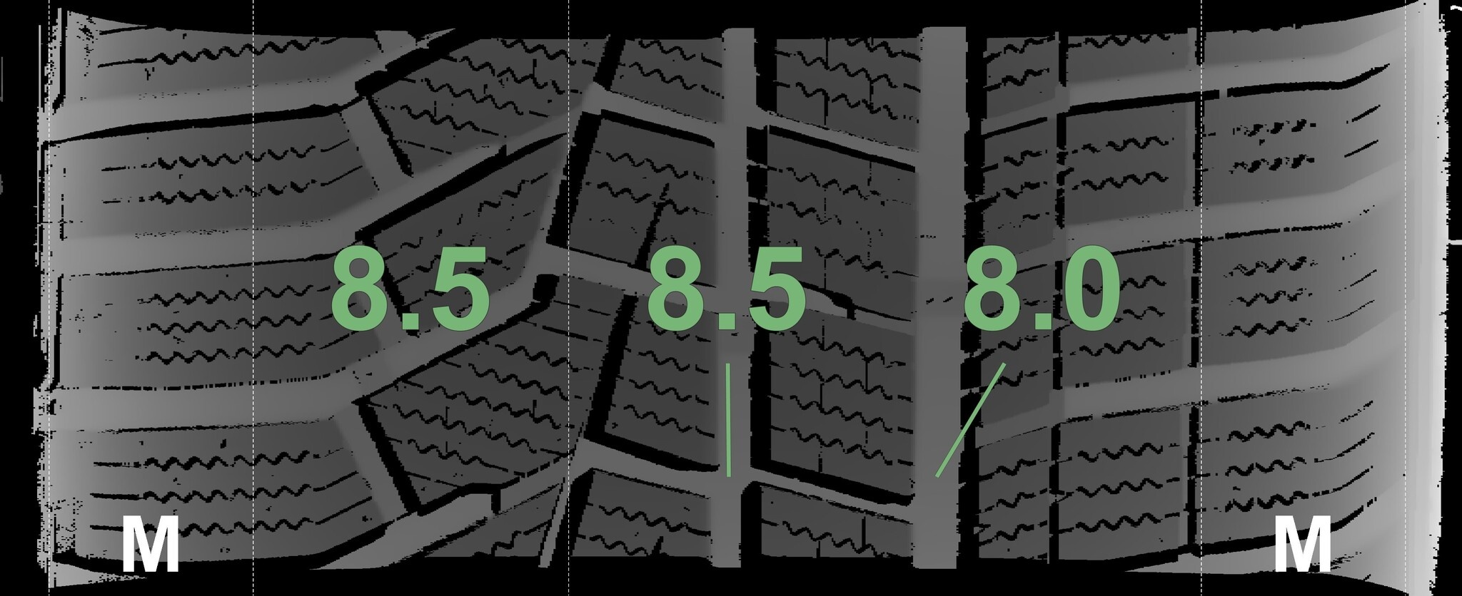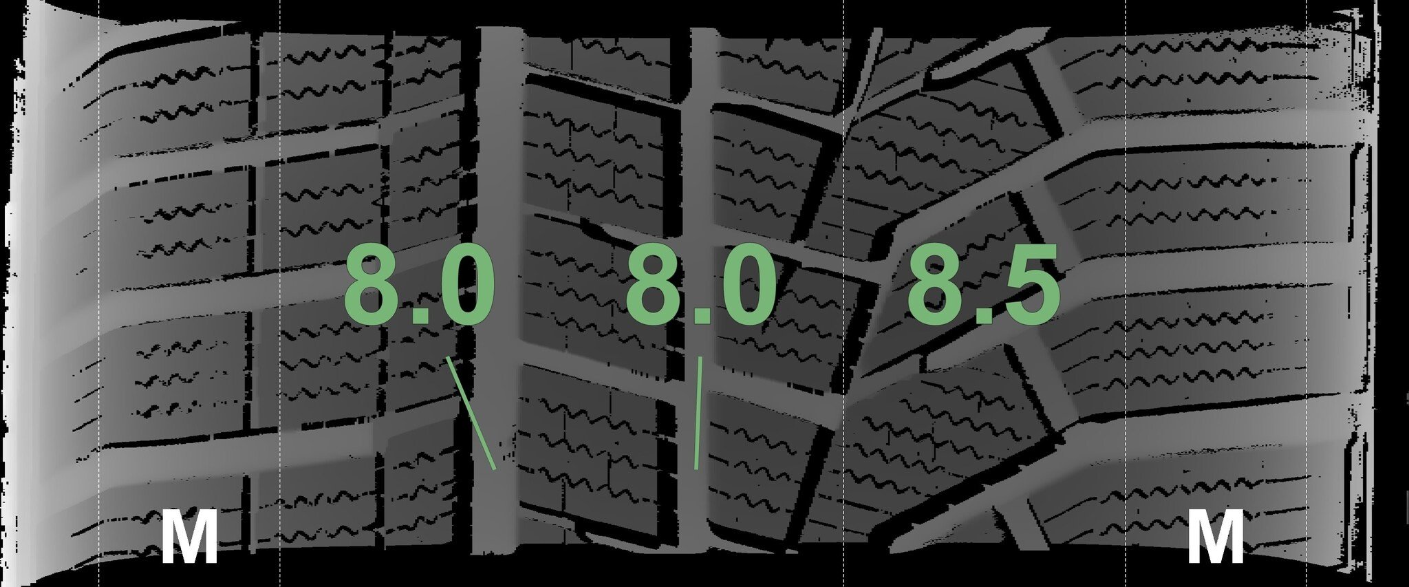 Die gemessenen Profiltiefen und Details der Felgen sind oben abgebildet.