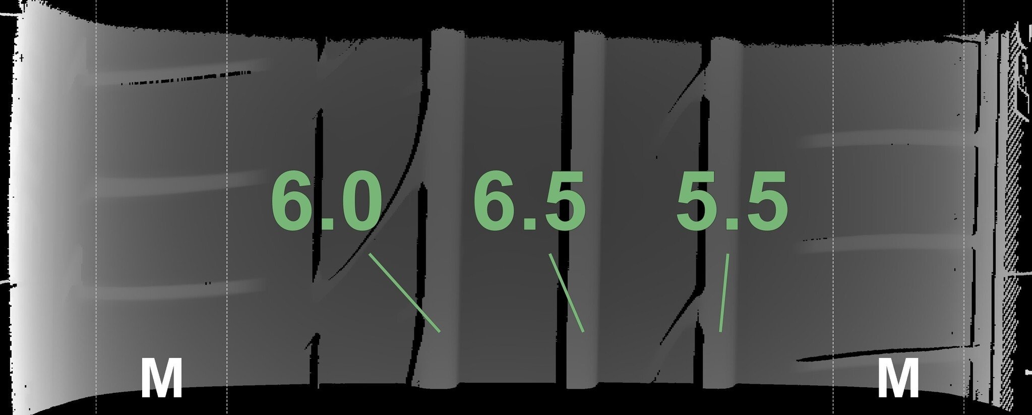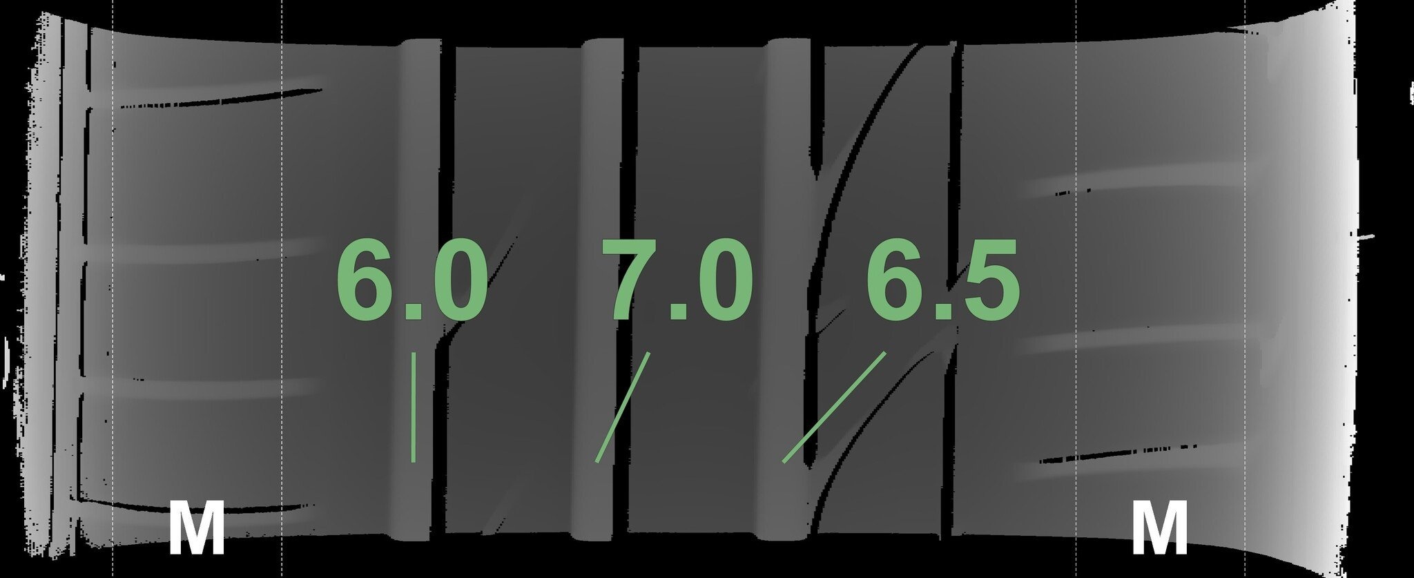 Die gemessenen Profiltiefen und die Details der Felgen sind oben aufgeführt.