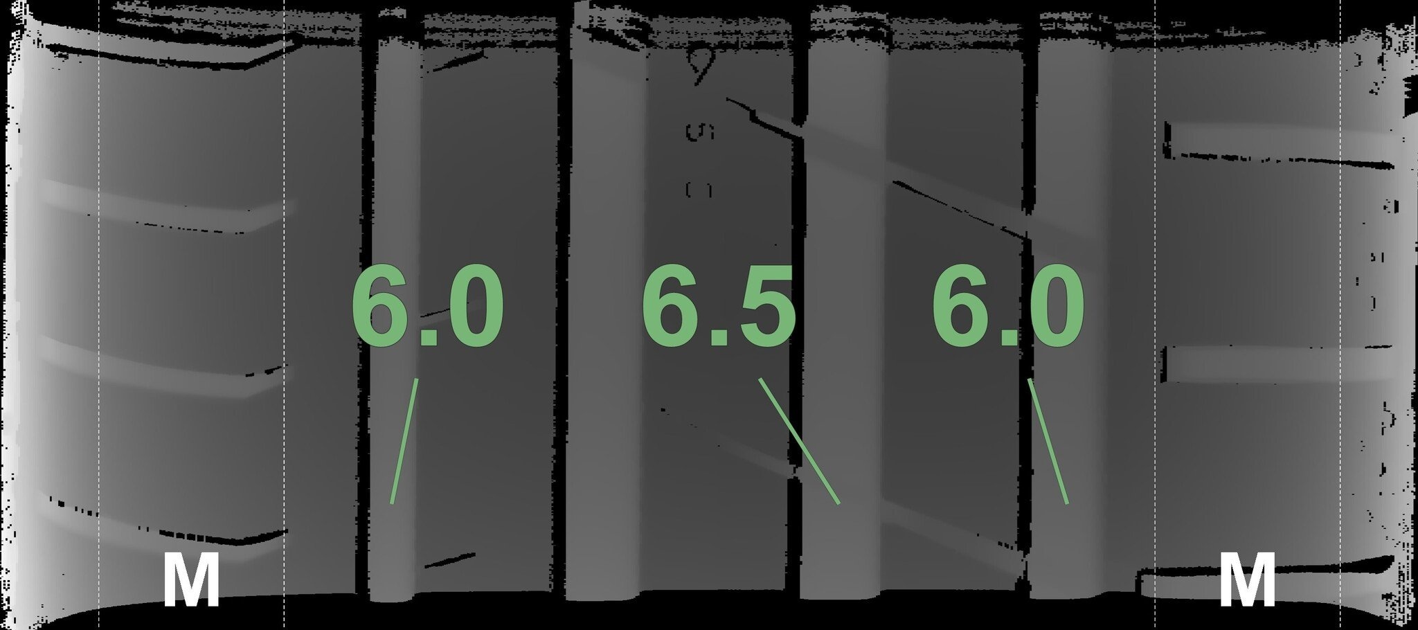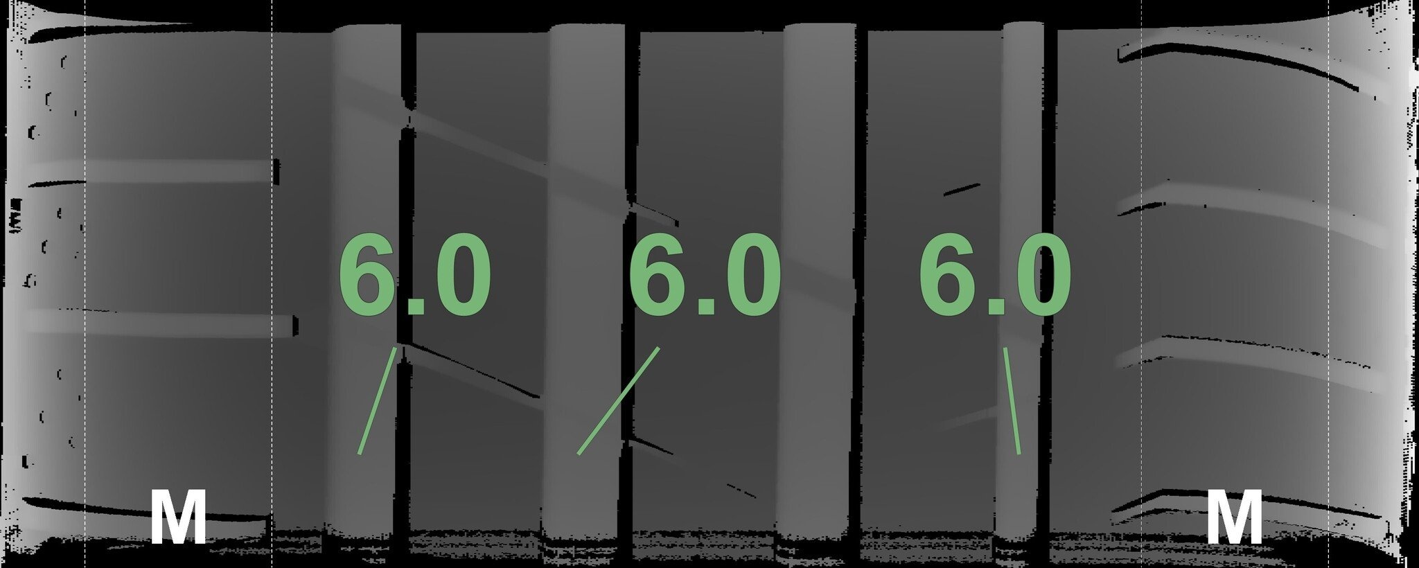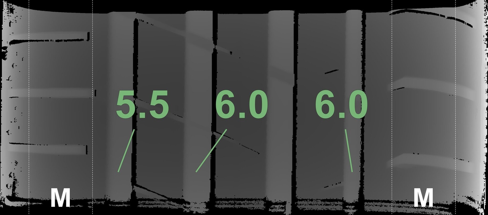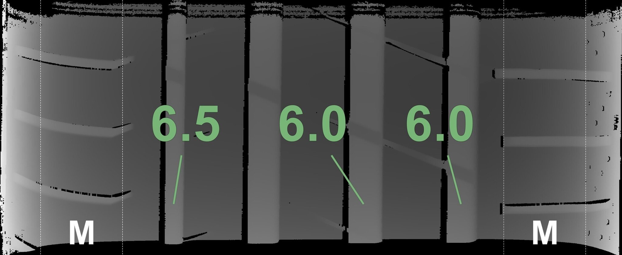 Die gemessenen Profiltiefen und die Details der Felgen sind oben dargestellt.