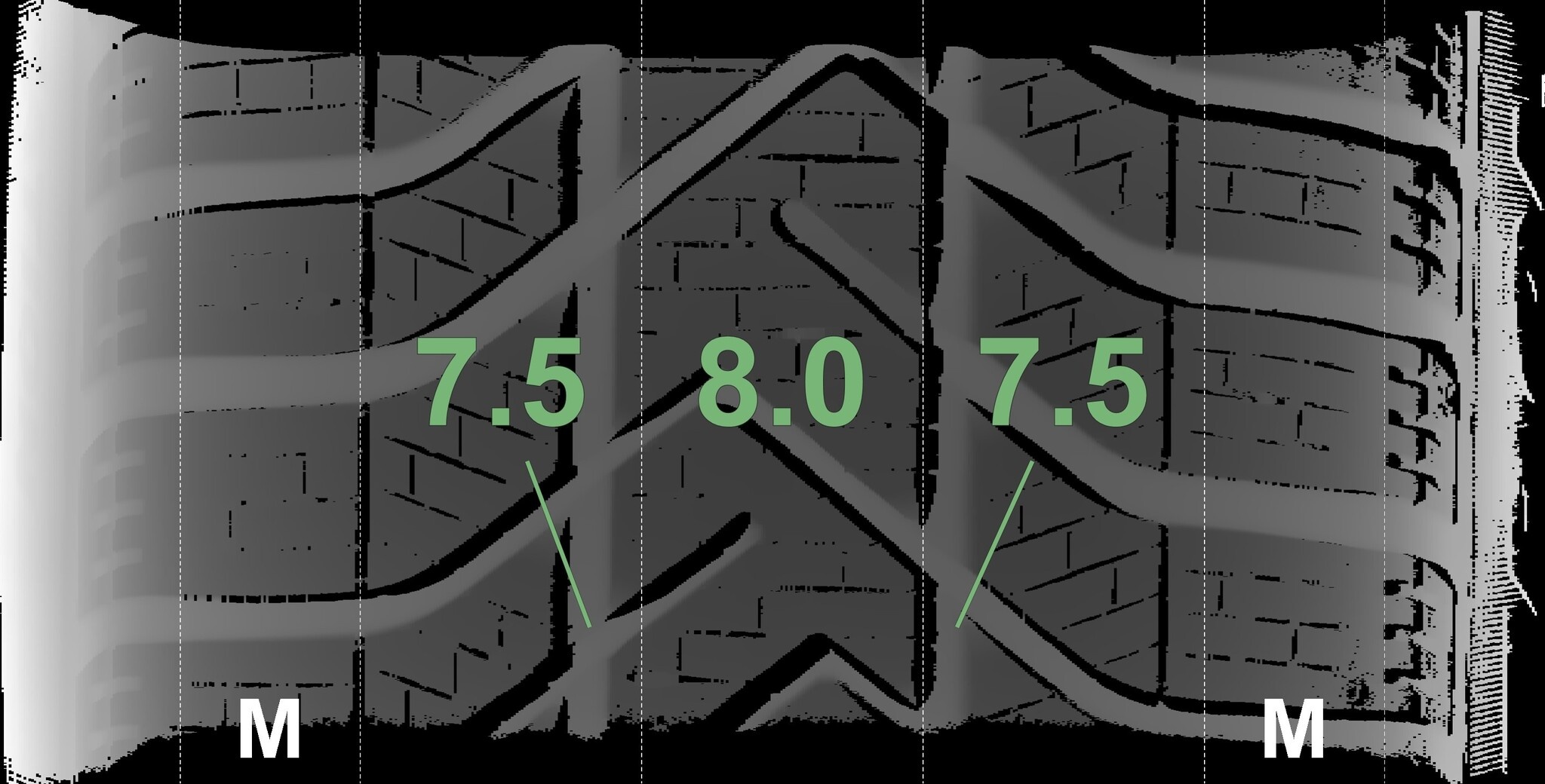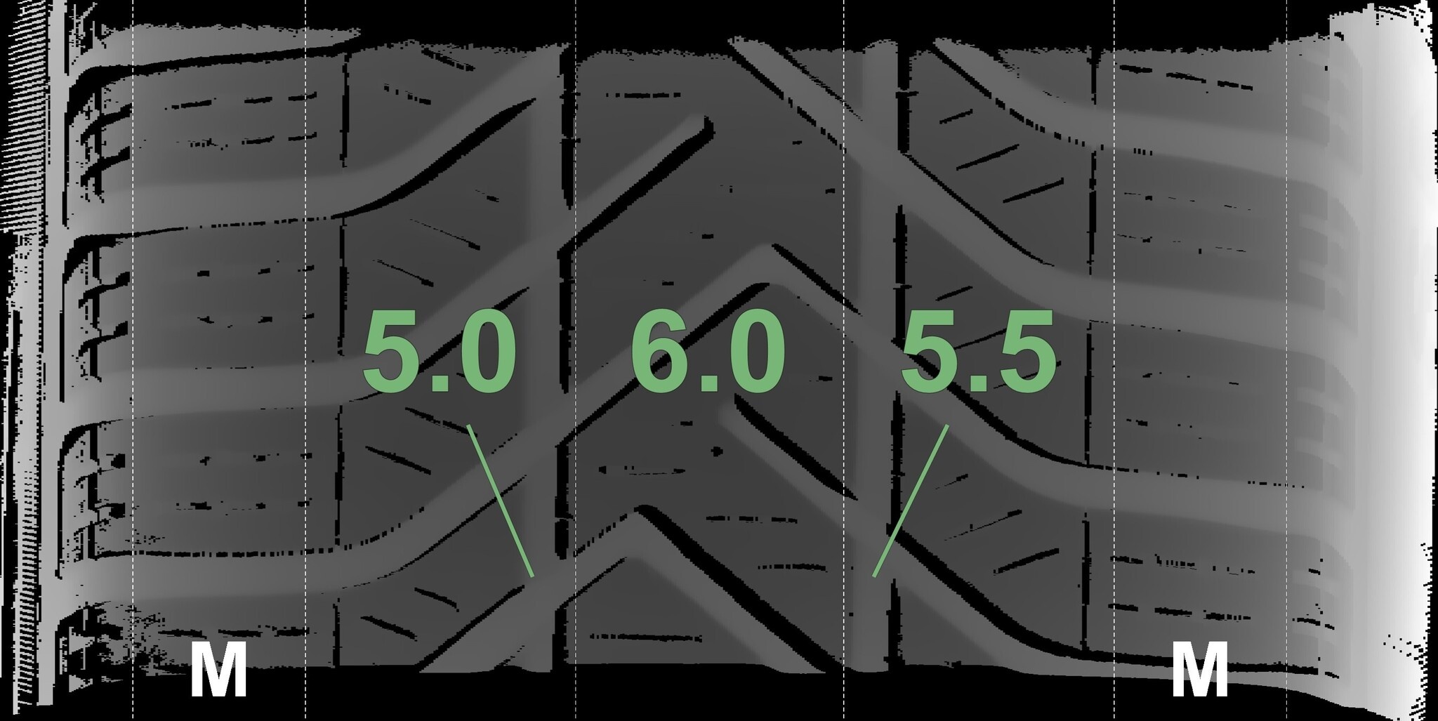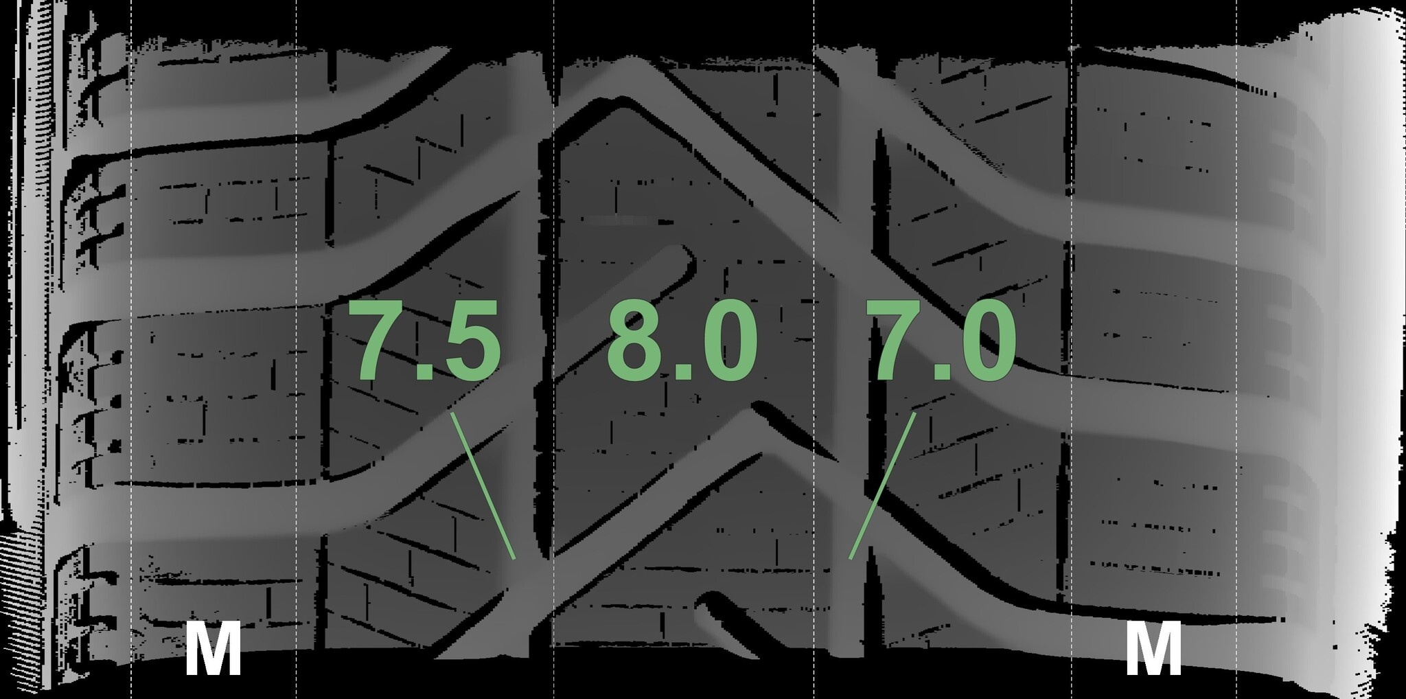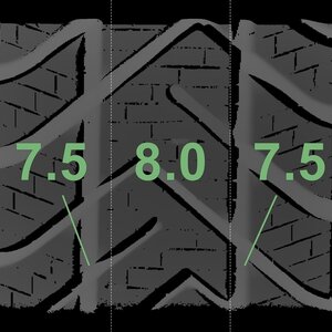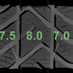 Die gemessenen Profiltiefen und die Details der Felgen sind oben dargestellt.