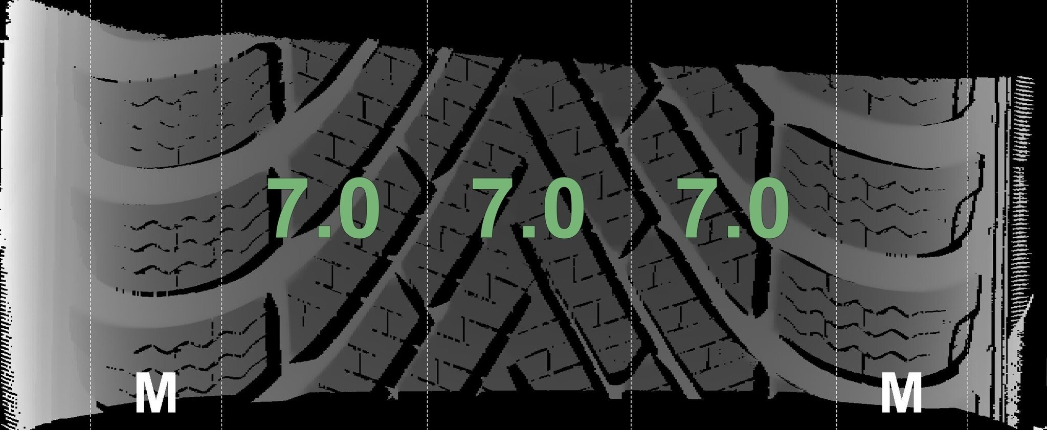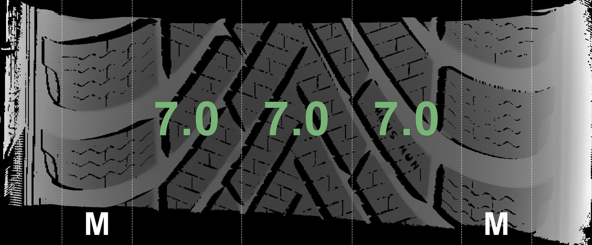 | Zustand | Profiltiefe | DOT | Vorderachse Links | Neu | 7.0 mm | 3319 |