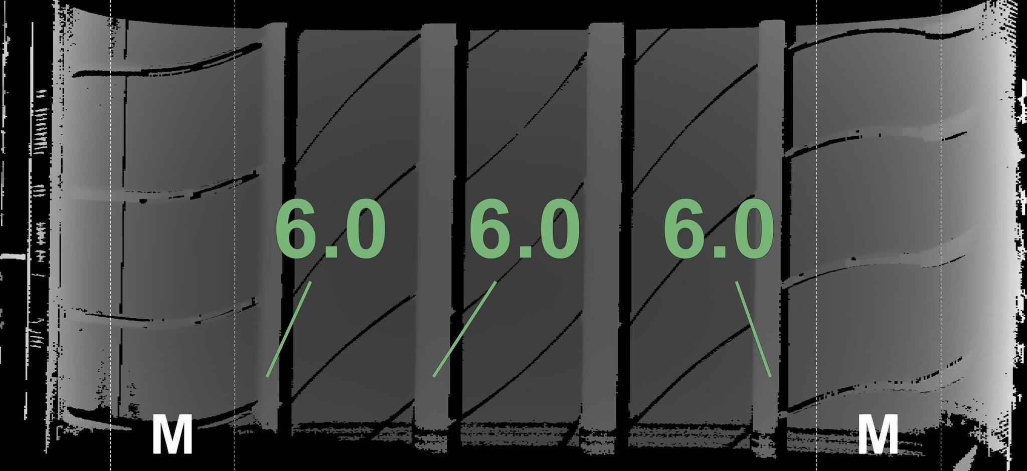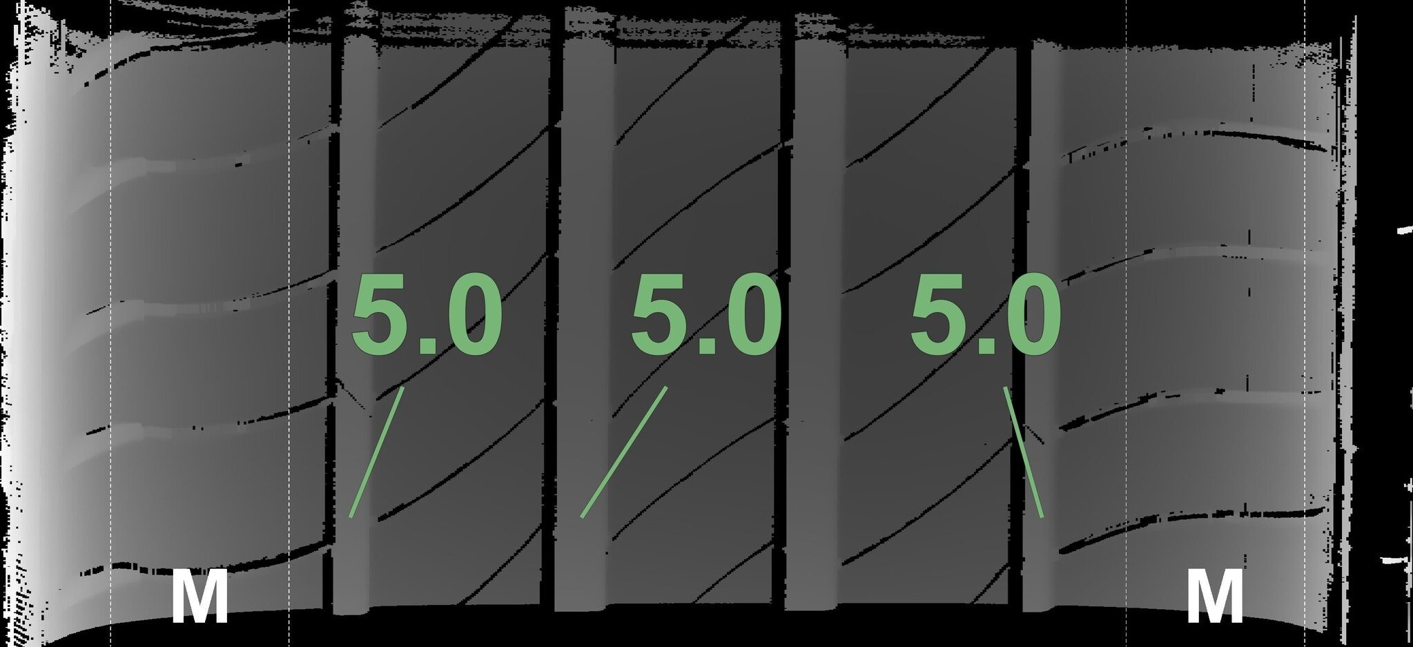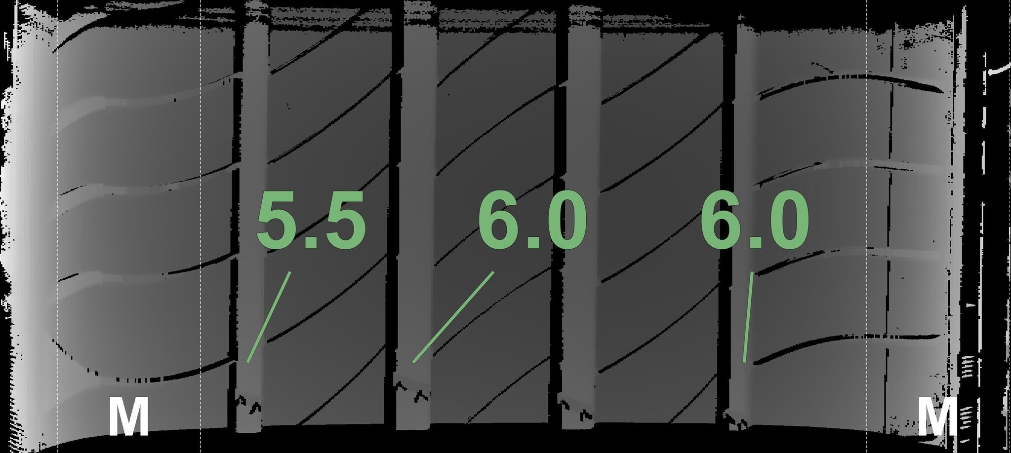 Die gemessenen Profiltiefen und die Details der Felgen sind oben dargestellt.