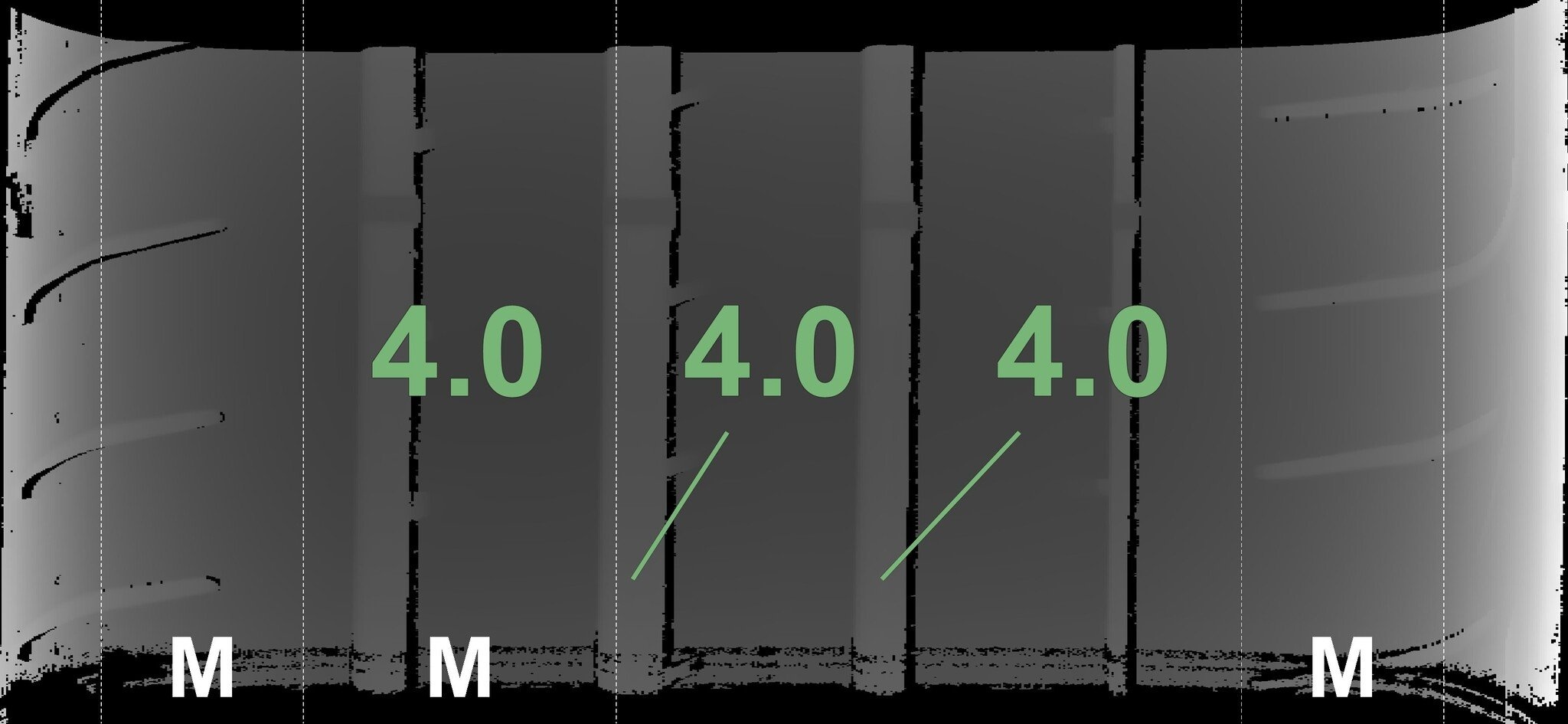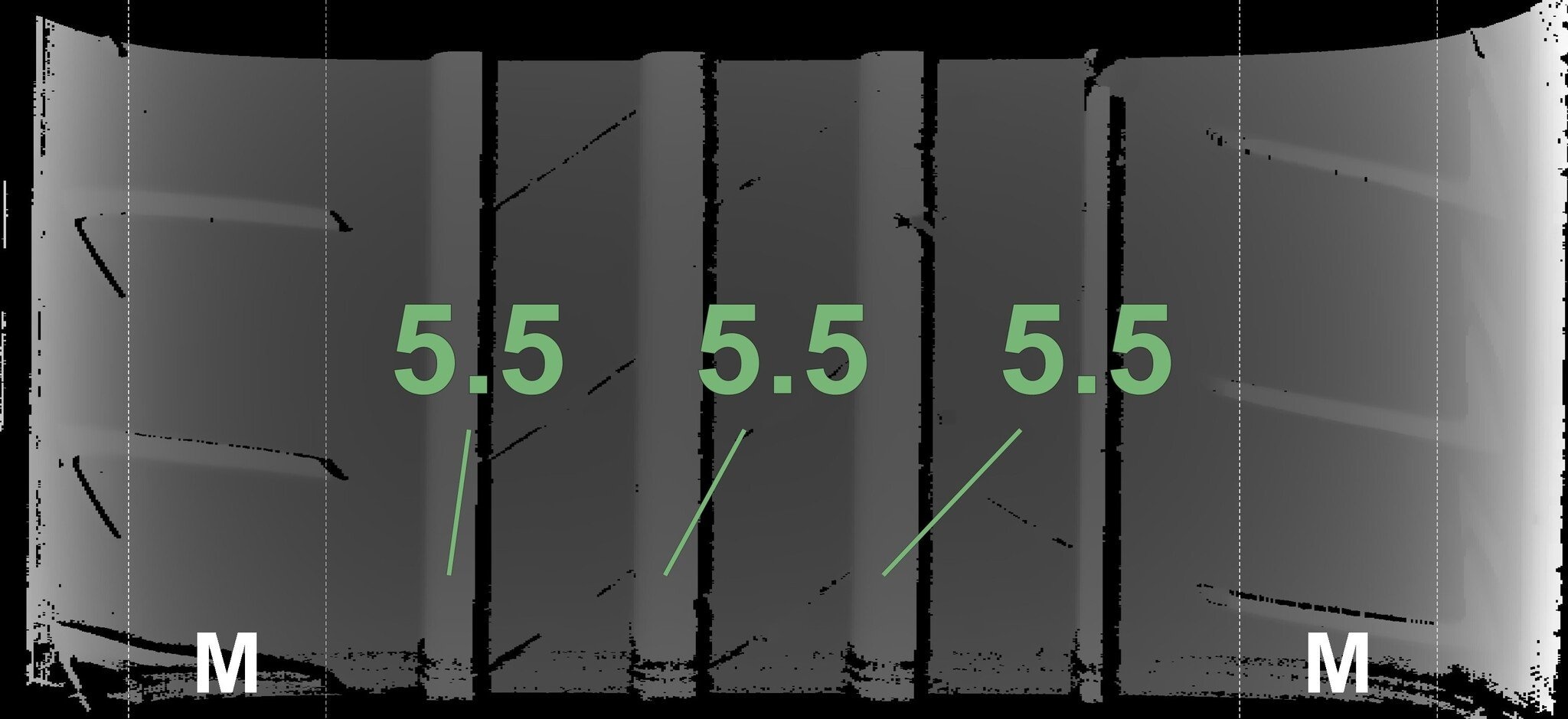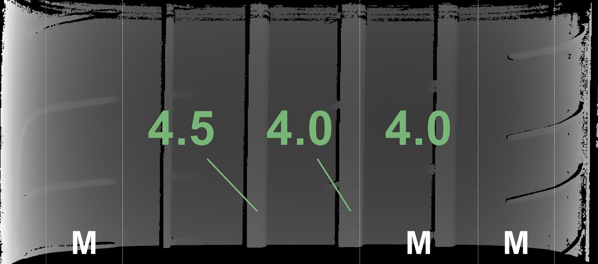 Die gemessenen Profiltiefen und die Details der Felgen sind oben dargestellt.