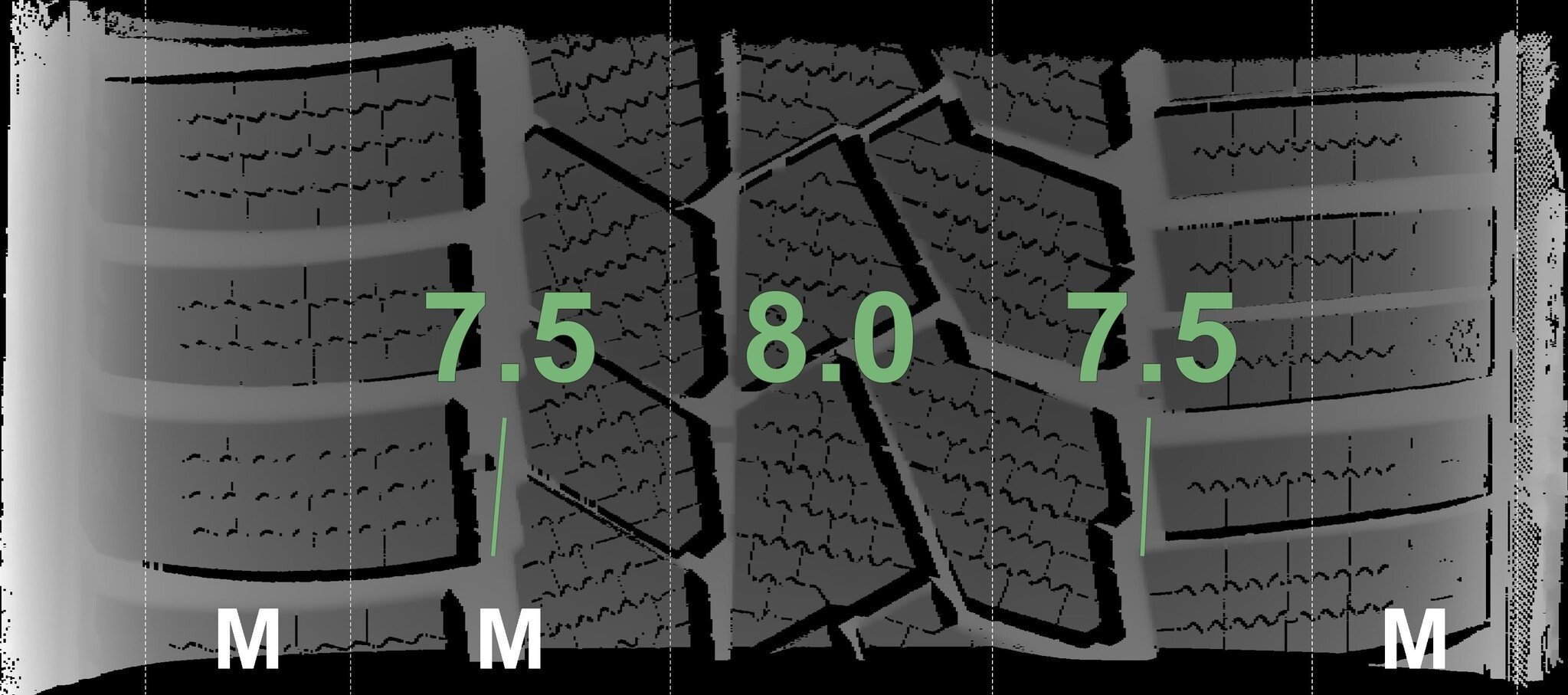 | Zustand | Profiltiefe | DOT | Vorderachse Rechts | Neu | 7.7 mm | 4120 |