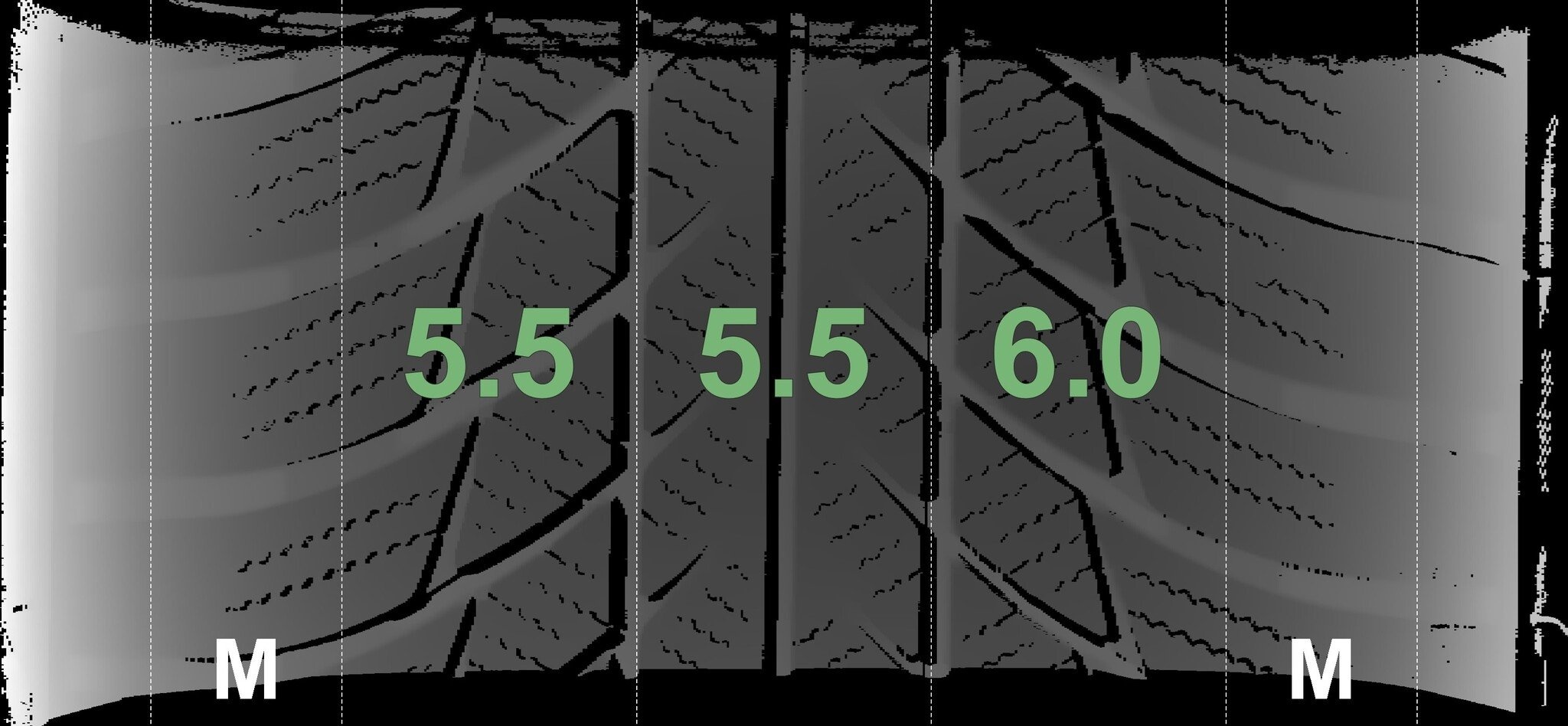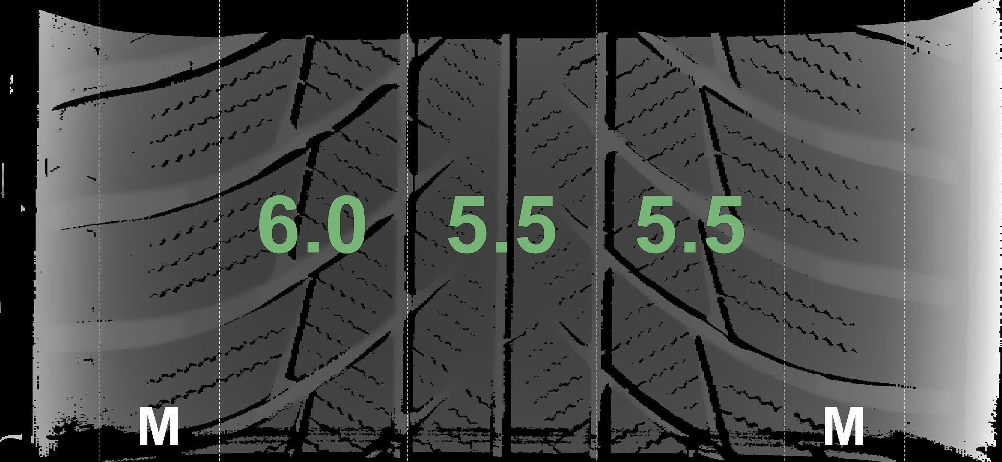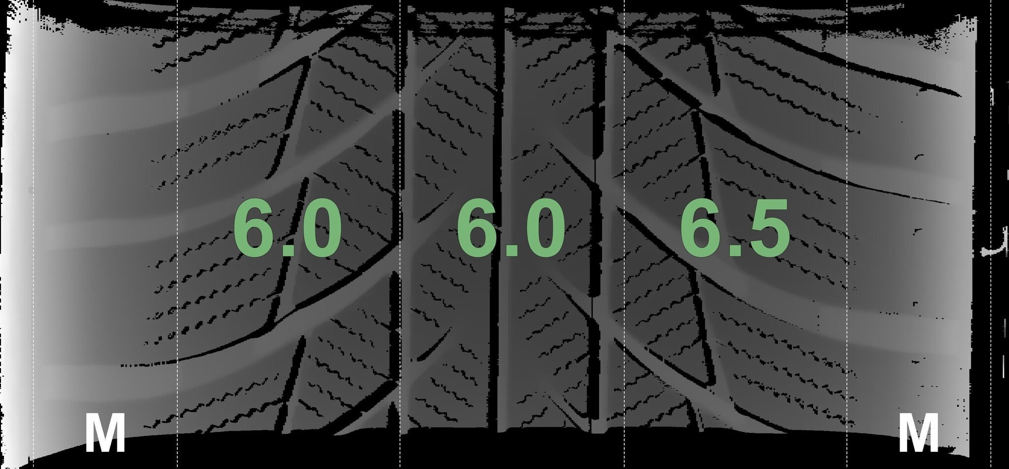 | Zustand | Profiltiefe | DOT | Vorderachse Links | Gebraucht | 6,0 mm | 2421 |