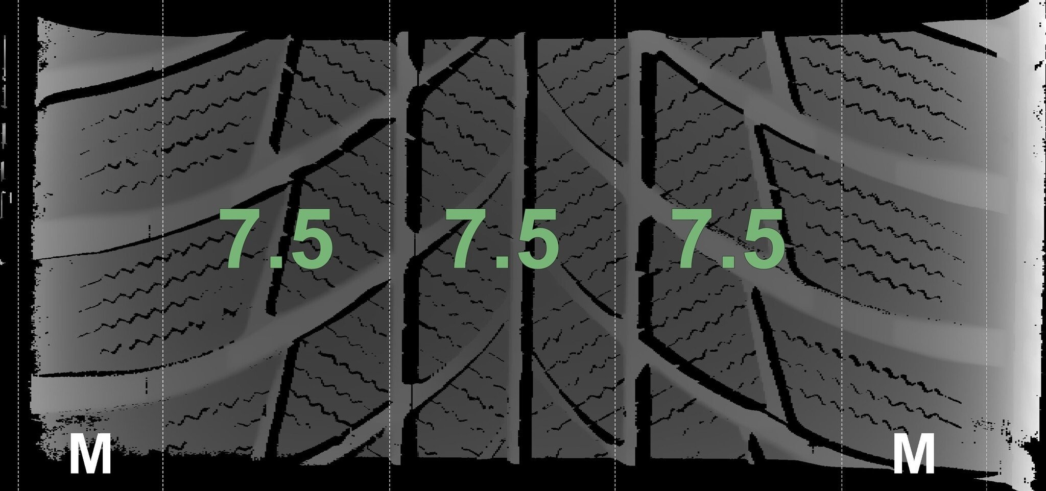 | Zustand | Profiltiefe | DOT | Hinterachse Rechts | Gebraucht | 7,5 mm | 3019 |