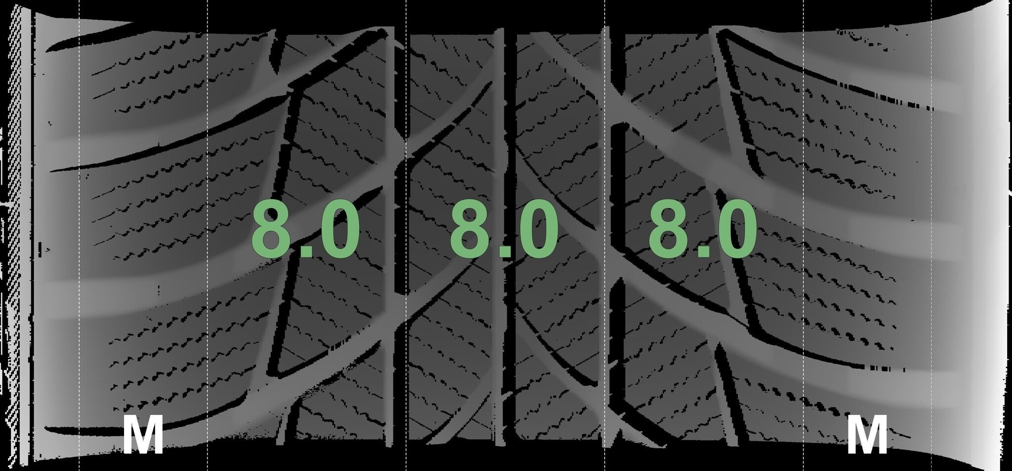 | Zustand | Profiltiefe | DOT | Hinterachse Rechts | Neu | 8,0 mm | 3820 |
