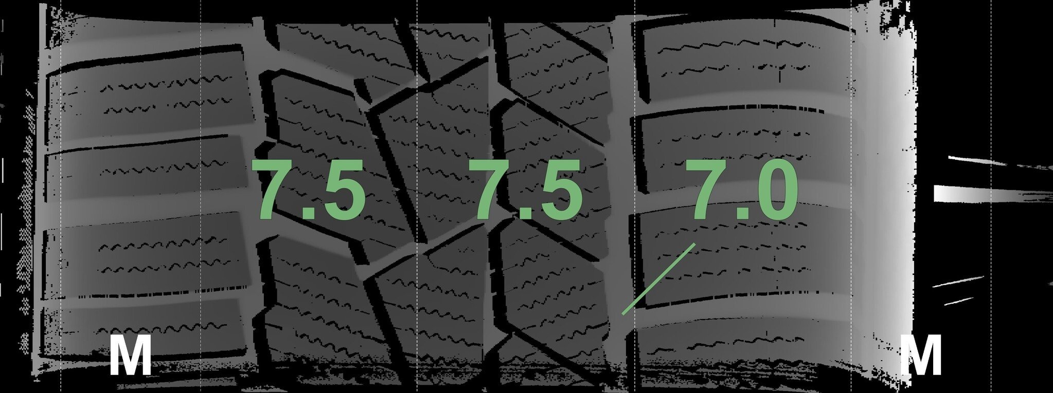 | Zustand | Profiltiefe | DOT | Vorderachse Links | Gebraucht | 7,0 mm | 4320 |